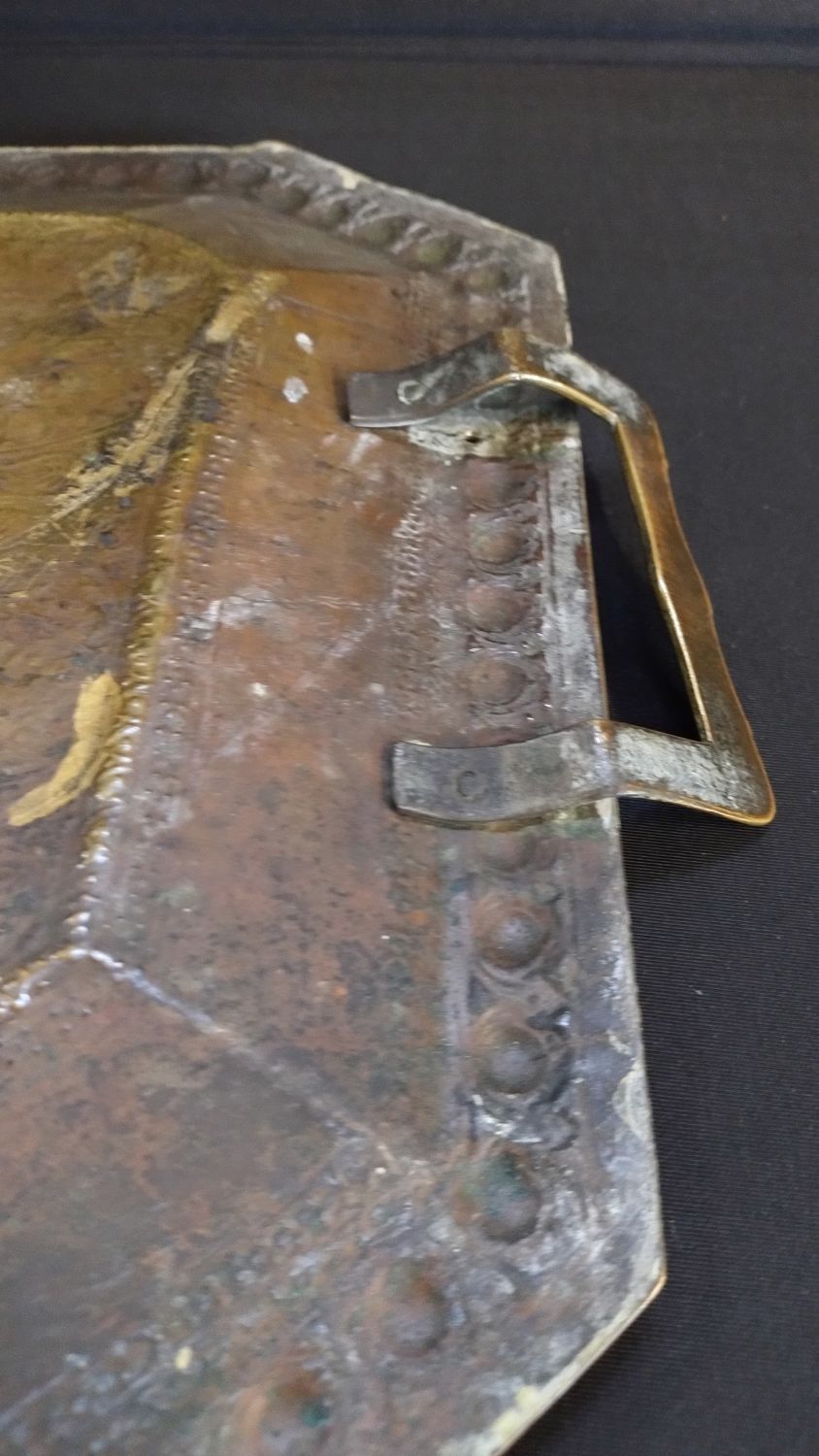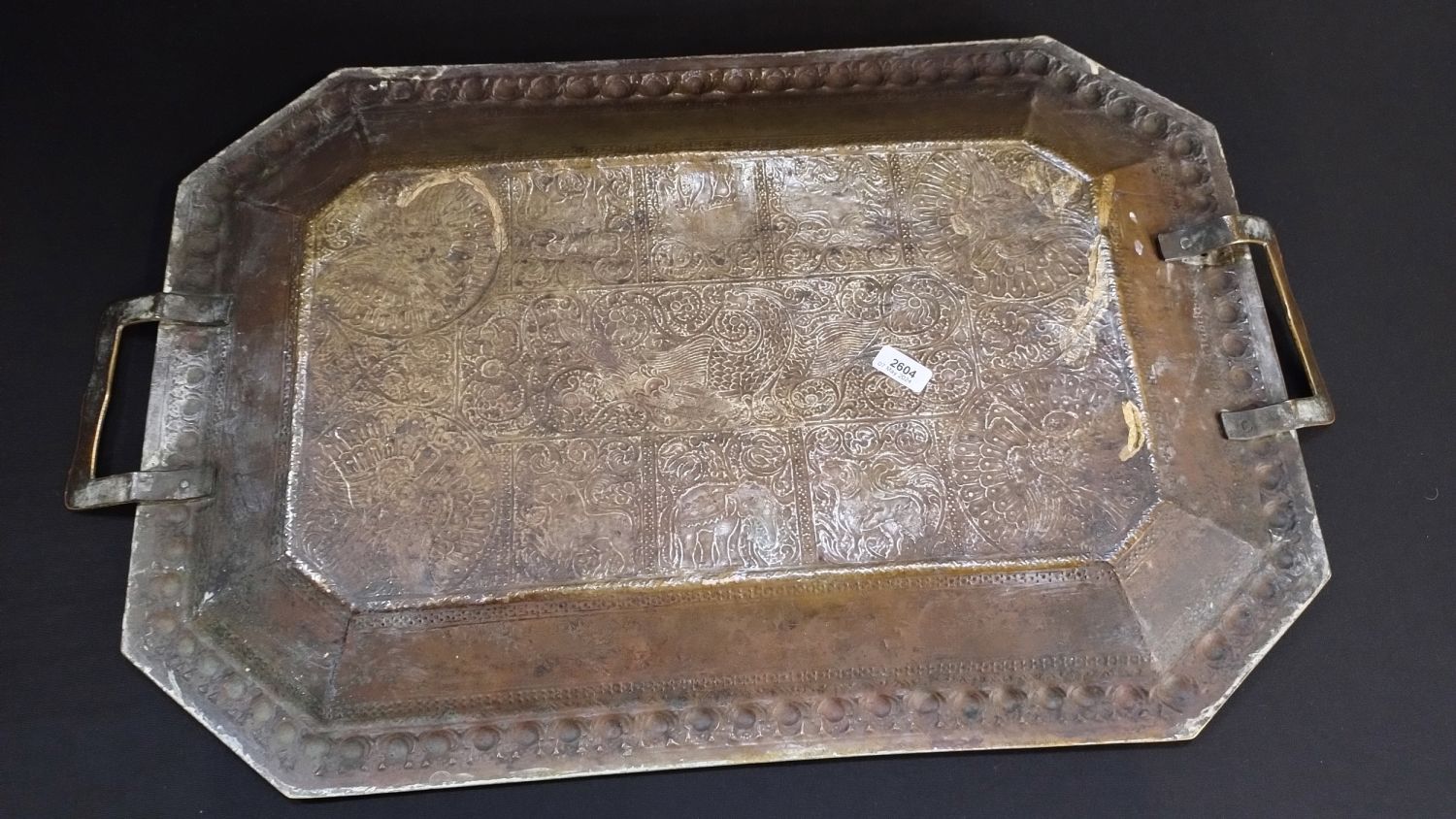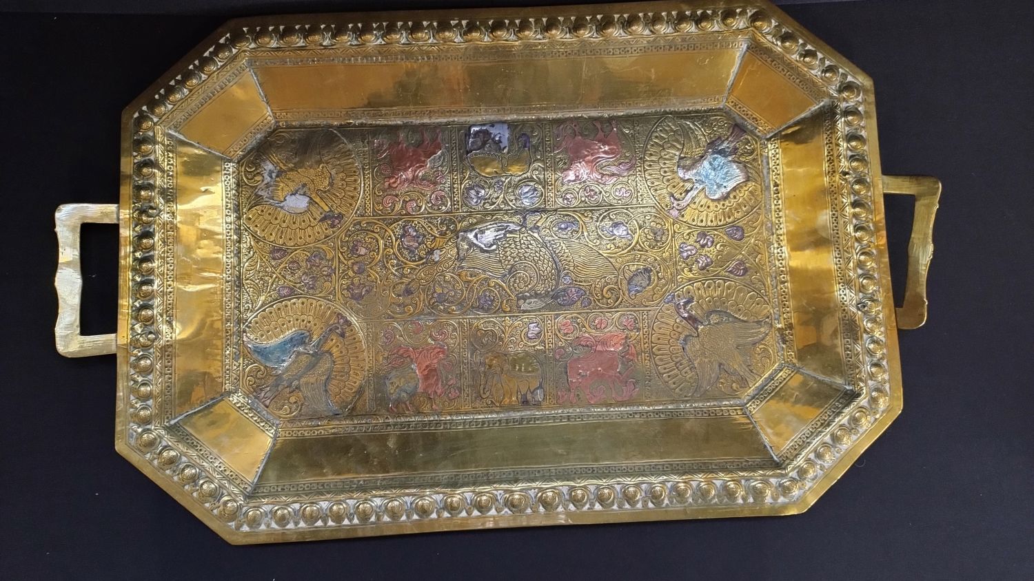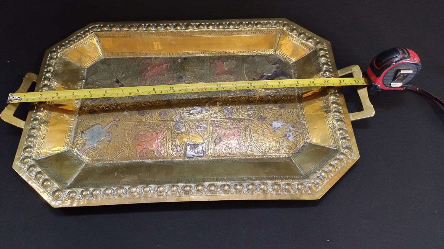 Large brass animal relief tray with peacocks,elephants,lions A/F