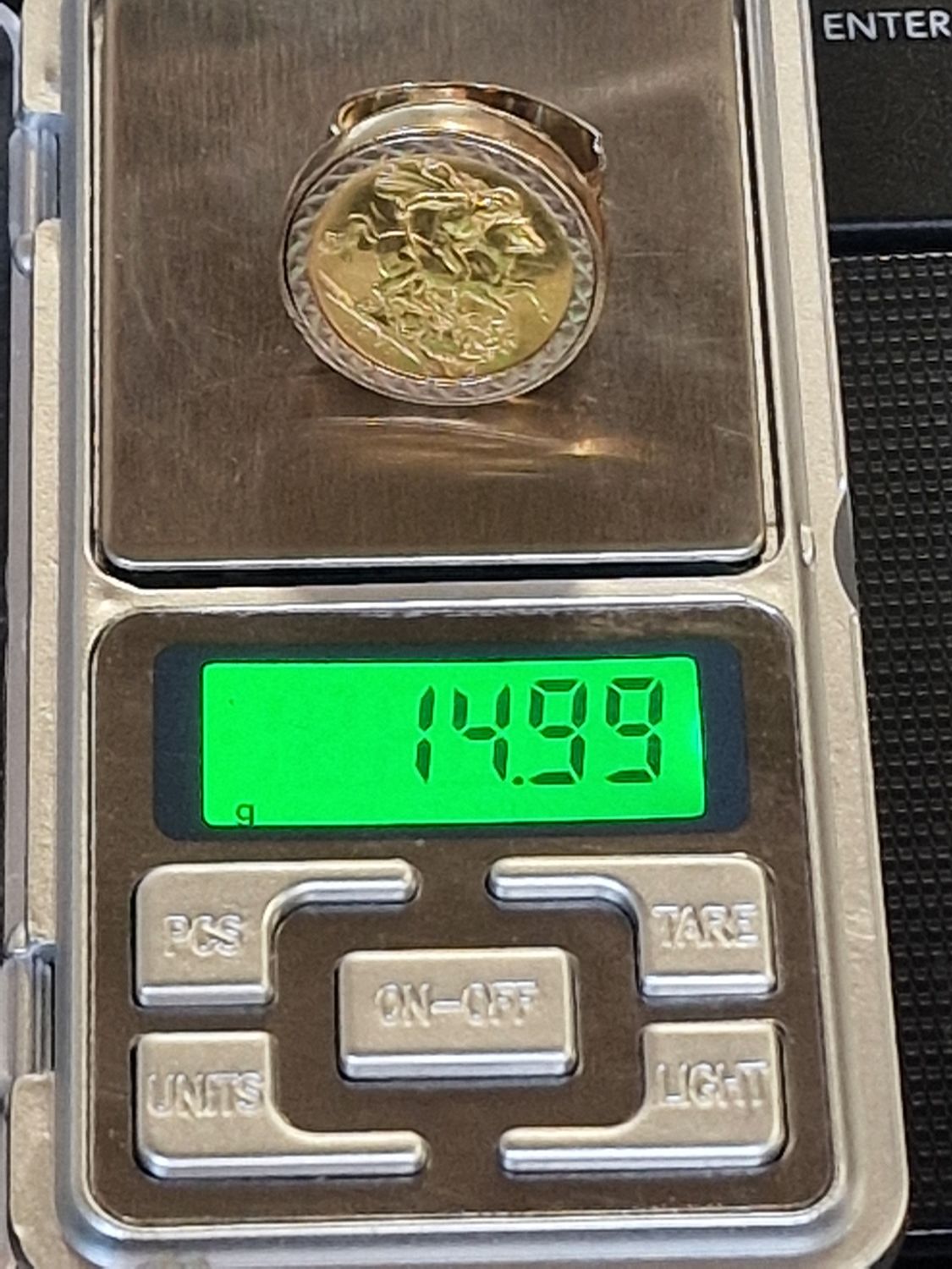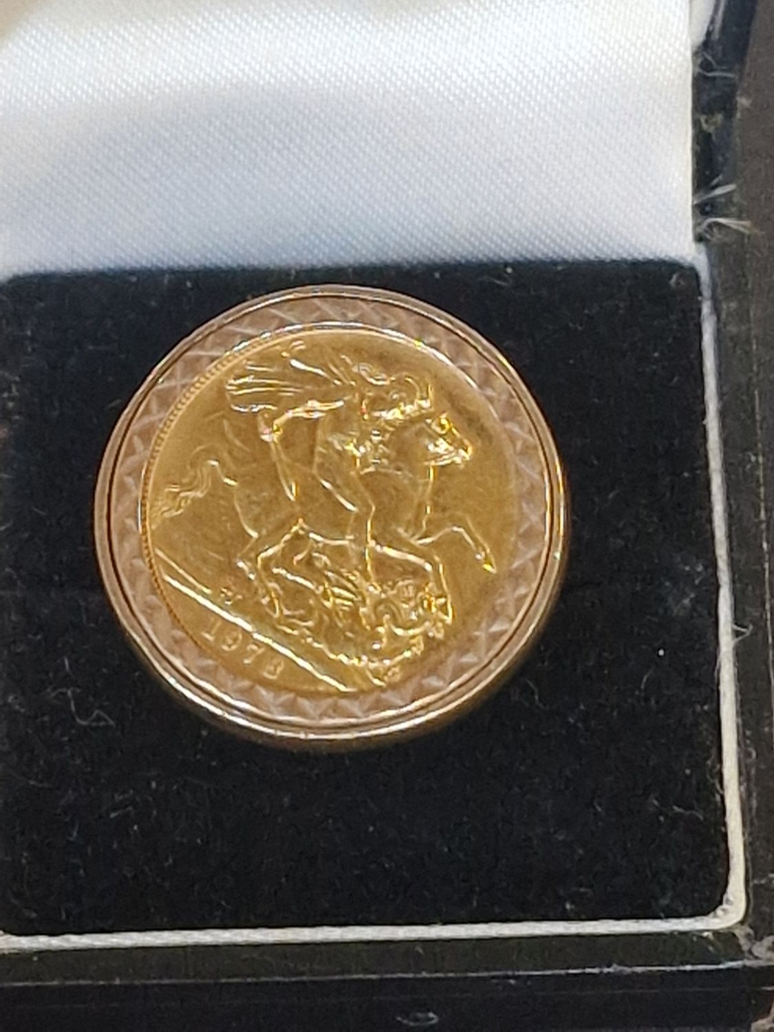 Mens 1978 22ct gold sovereign ring set in 9ct gold. Weight 14.99 approx. Size S