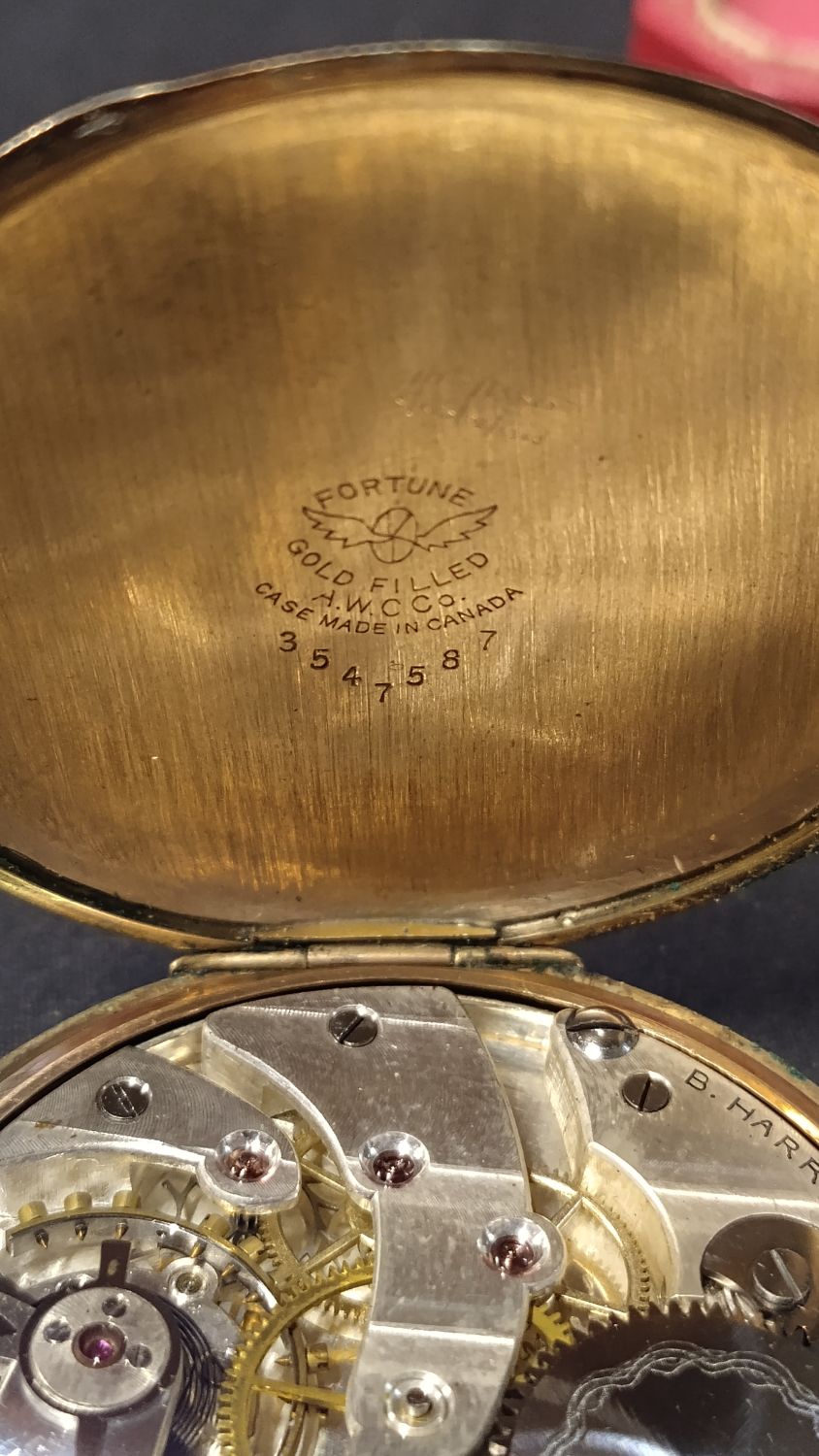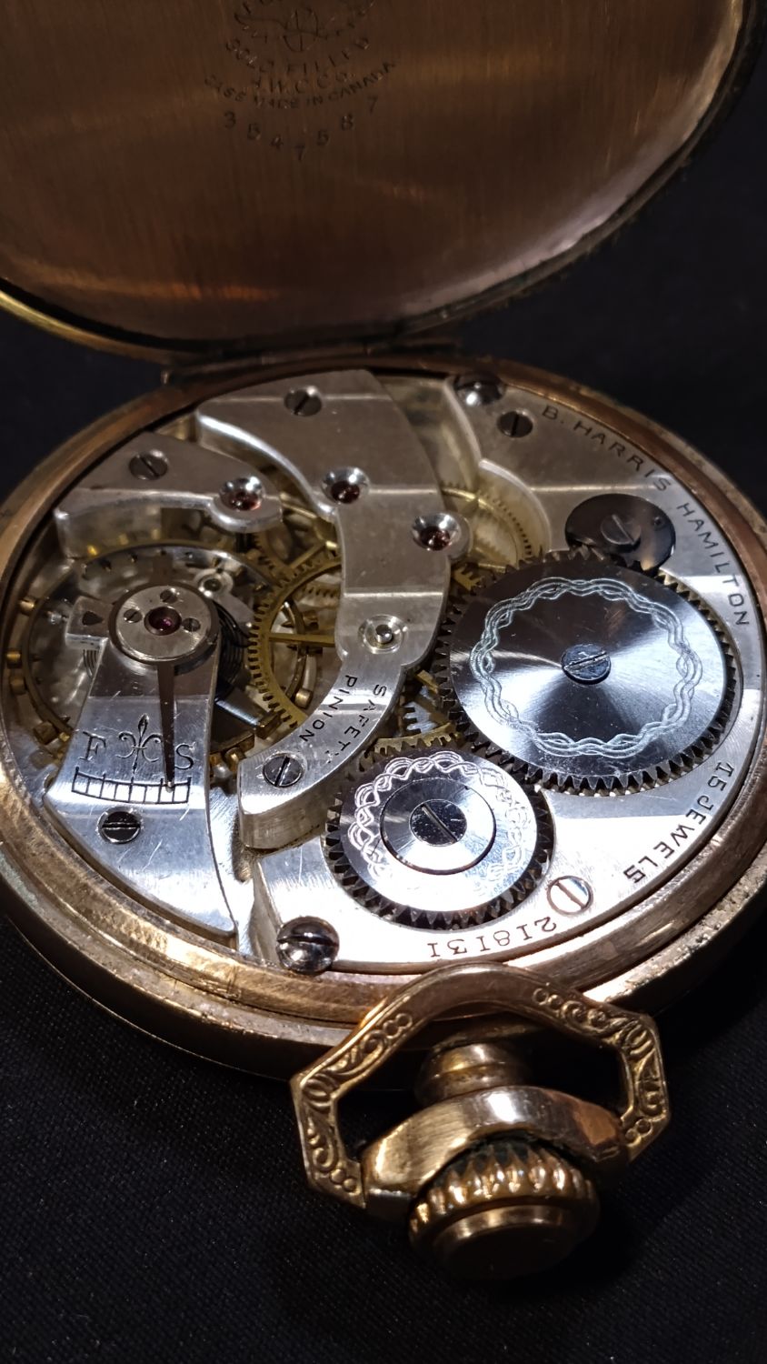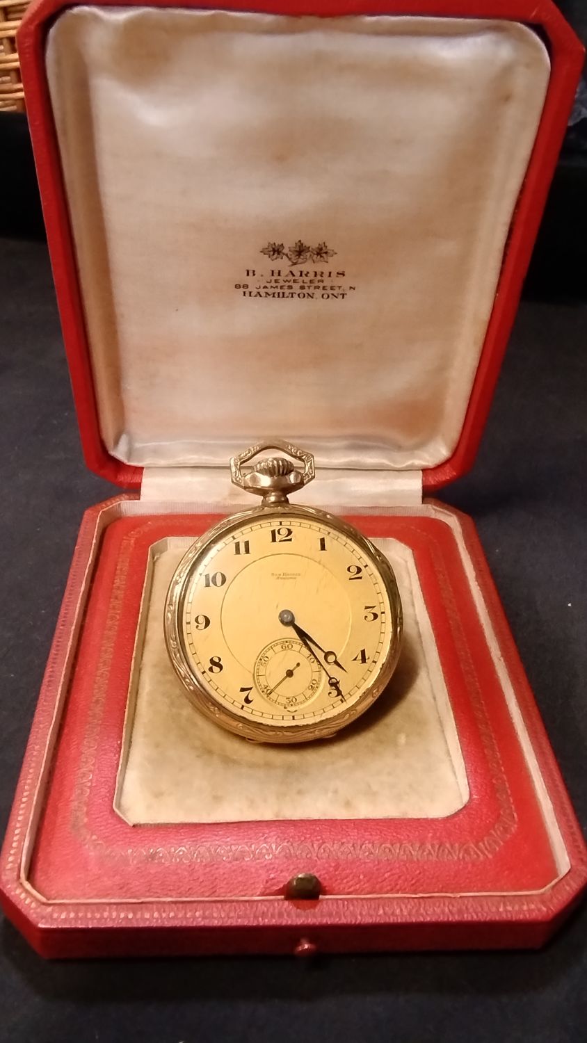 Vintage, B.Harris, gold filled half hunter watch from Hamilton.ONT , in good condition in original box.