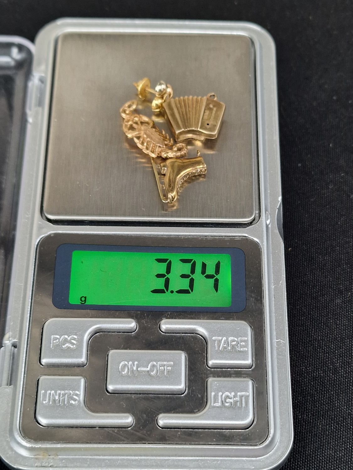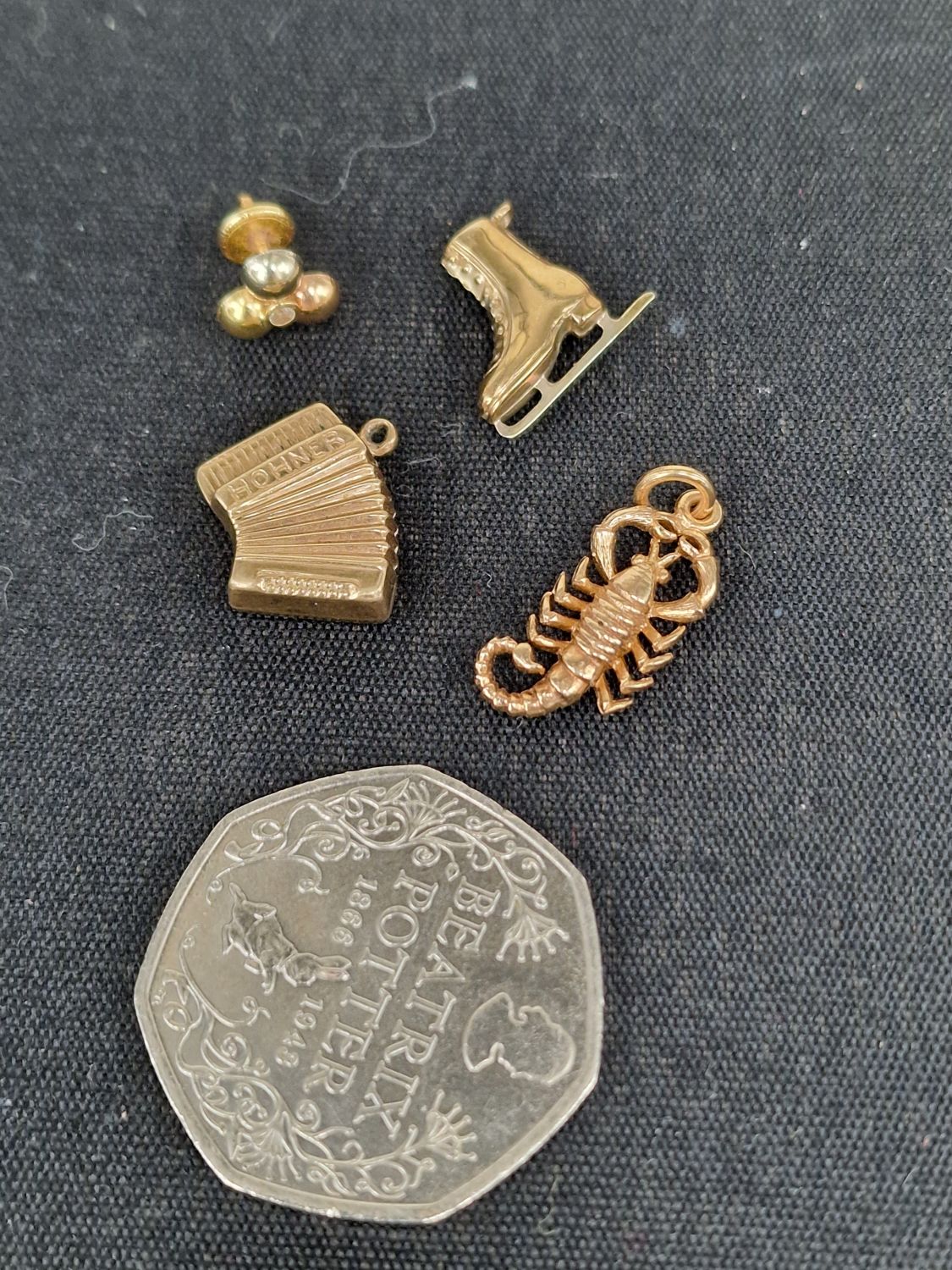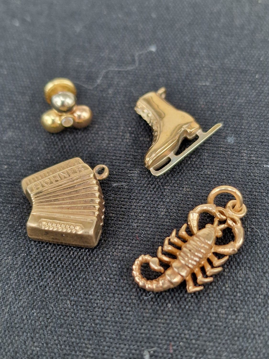 Three 9ct yellow gold pendant / charms, a scorpion, and accordian and an ice skate. and a three tone single earing with back.