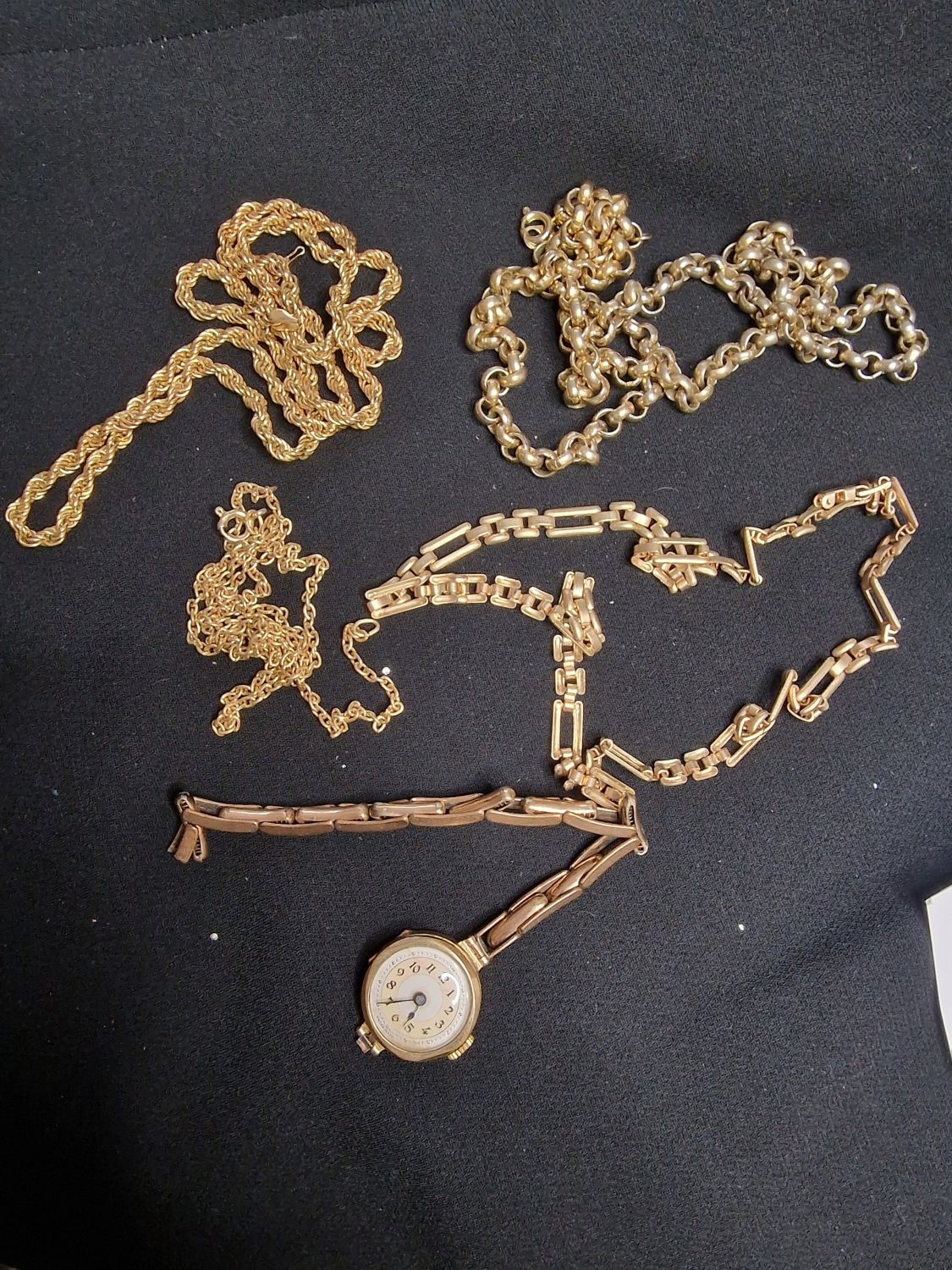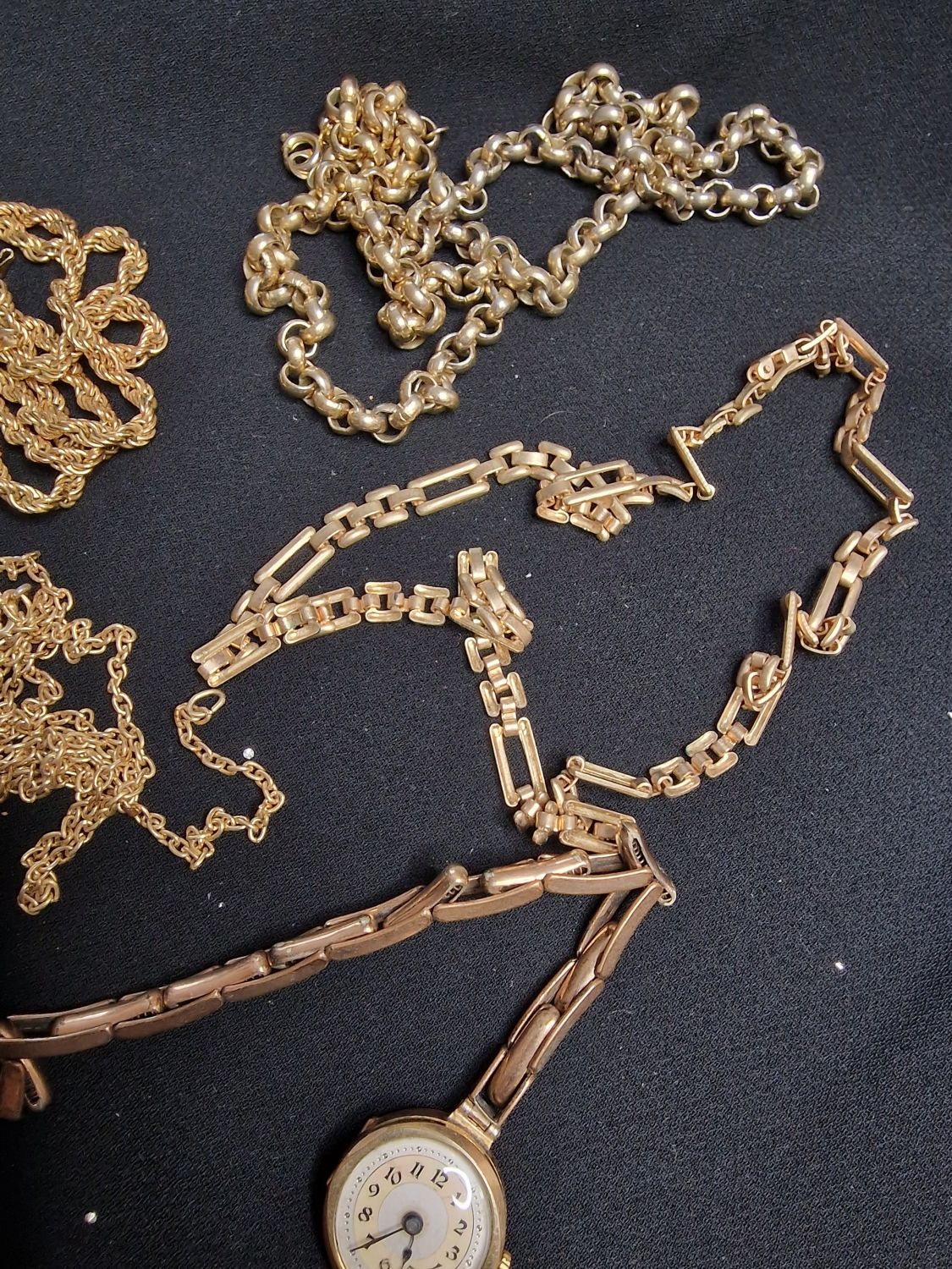 A.collection of rolled.gold and gold plated chains and a vintage watch