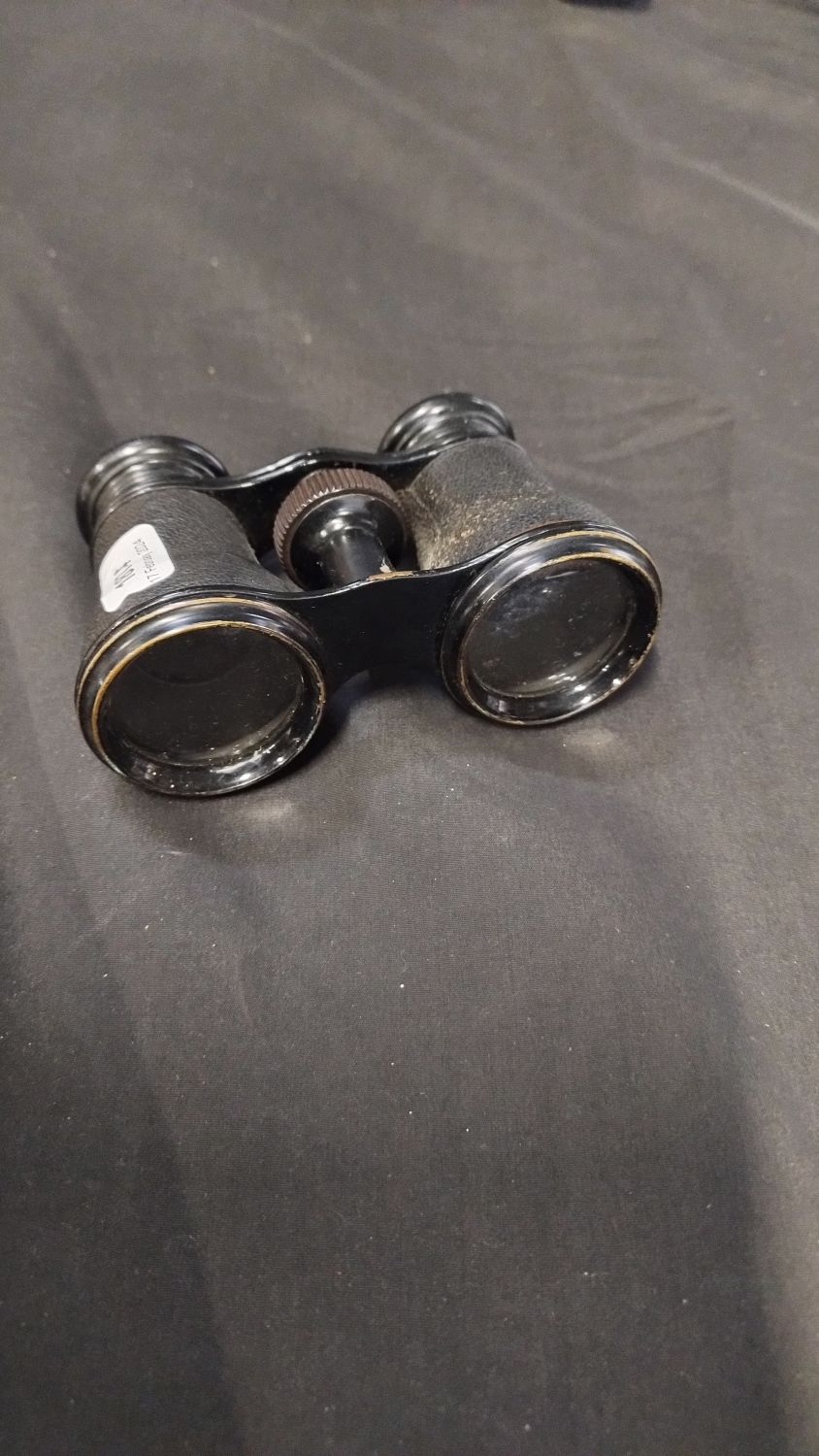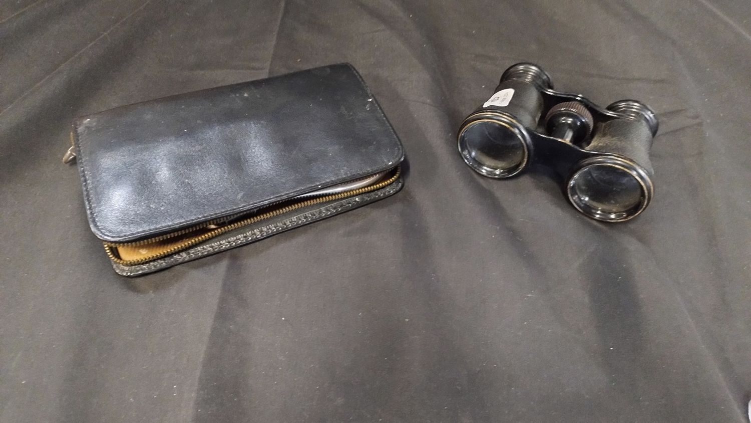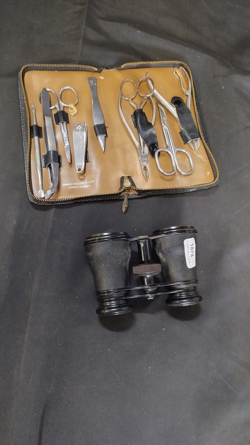 Vintage Topgrain cowhide, Western Germany, black and Tan zipper, travel manicure set nine pieces inside, pair of small spot binoculars,