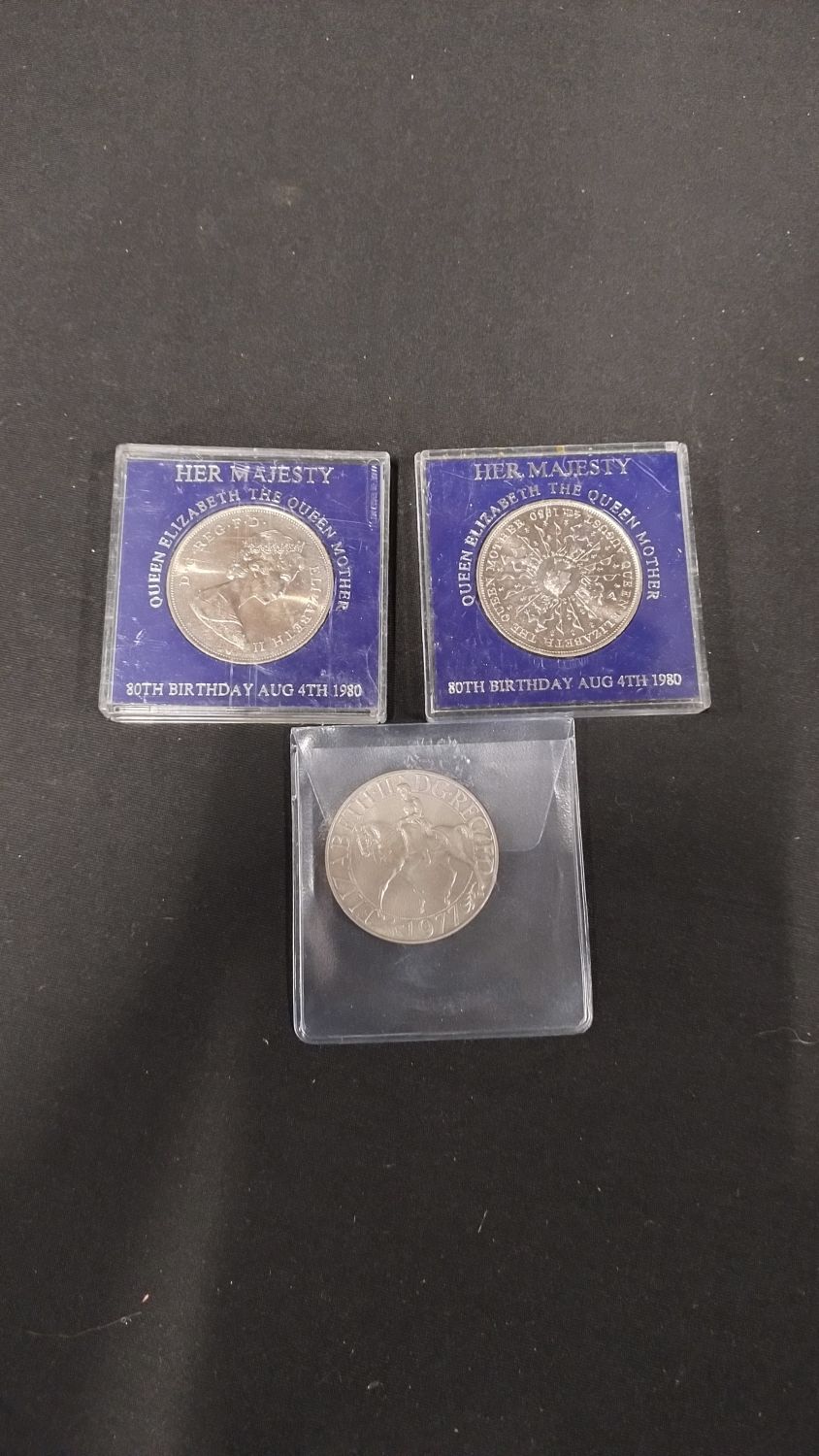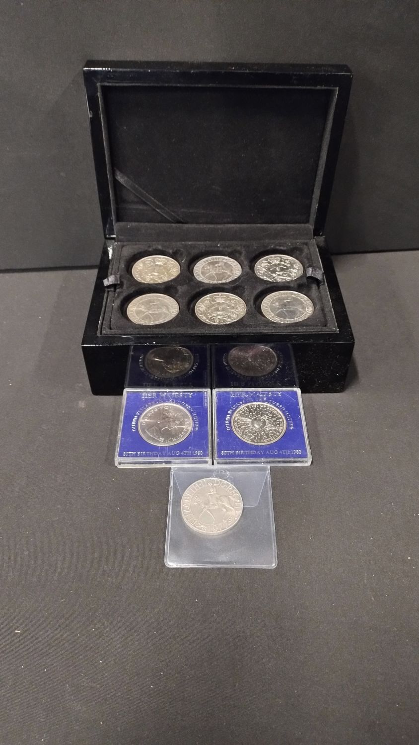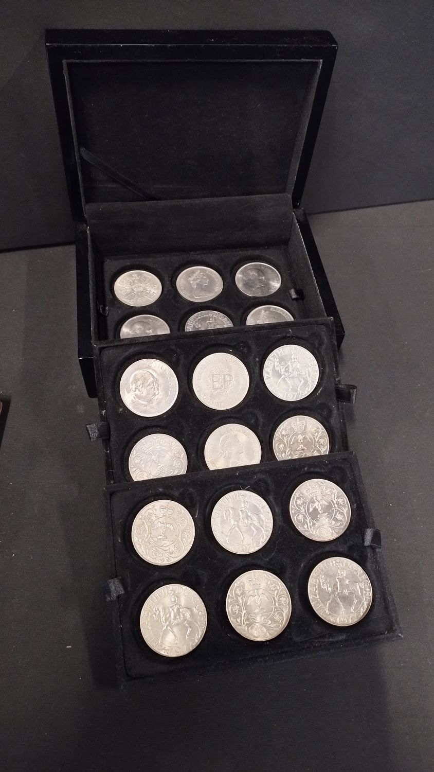 Collection of coins including Winston Churchill, queens jubilee, and various other coins set in a black coin display box with lid