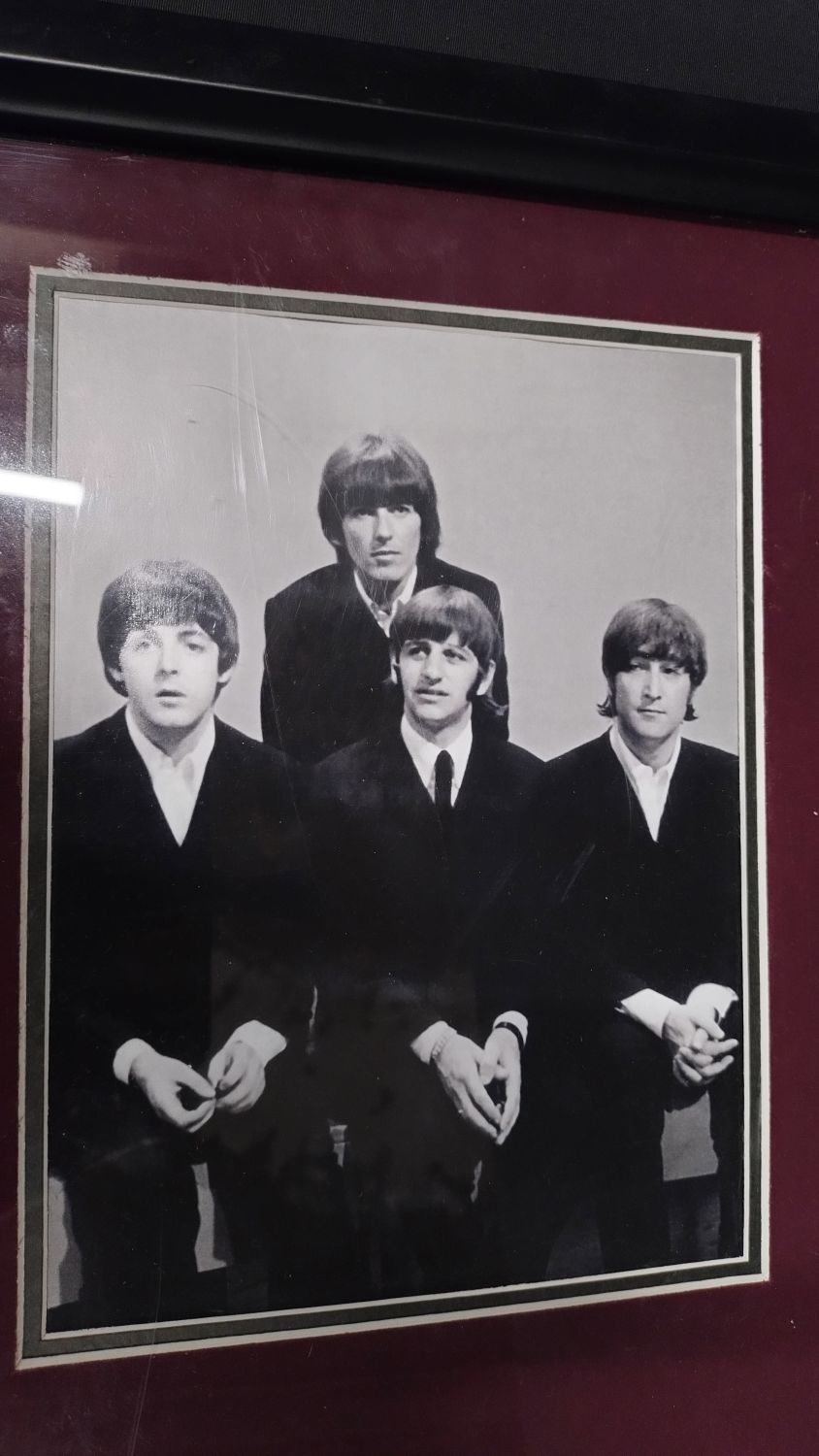 A tall The Beatles framed picture with a CD inset picture measures 22 x 12.5 inches