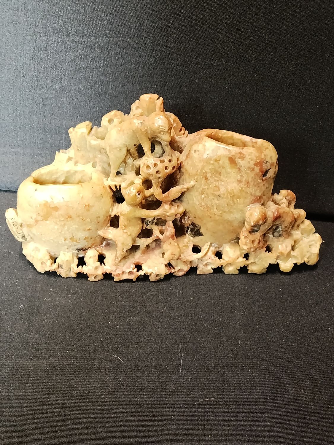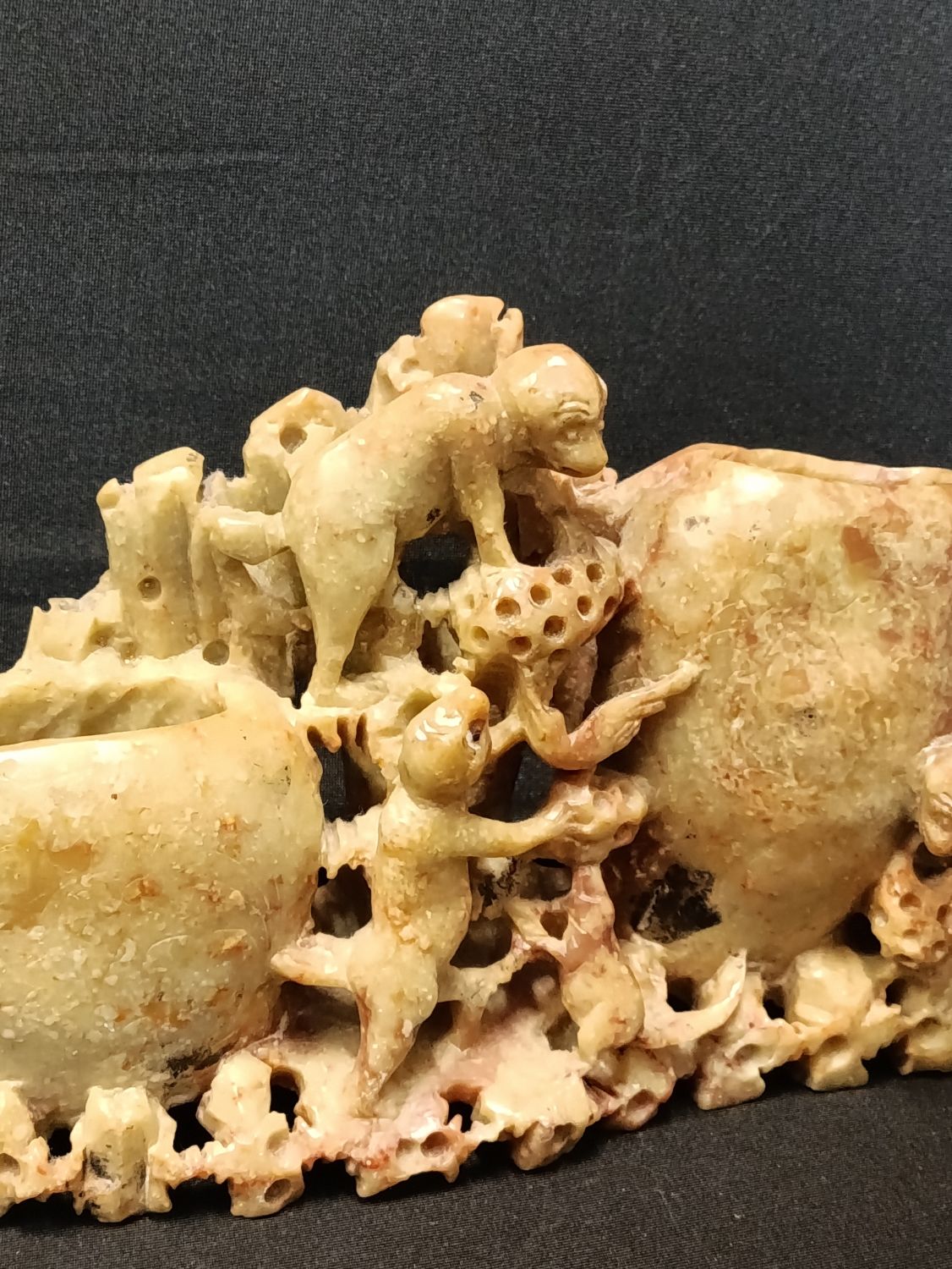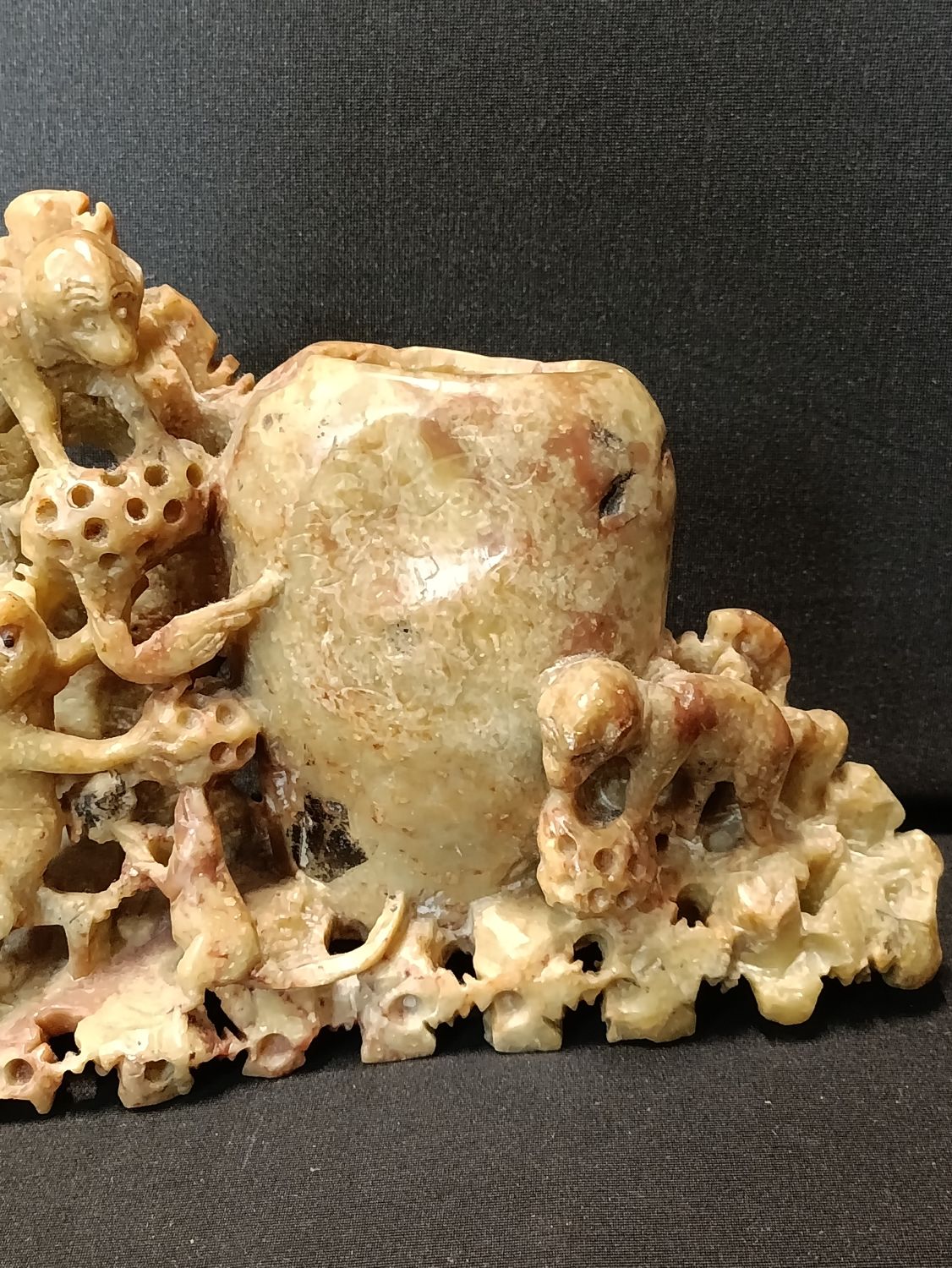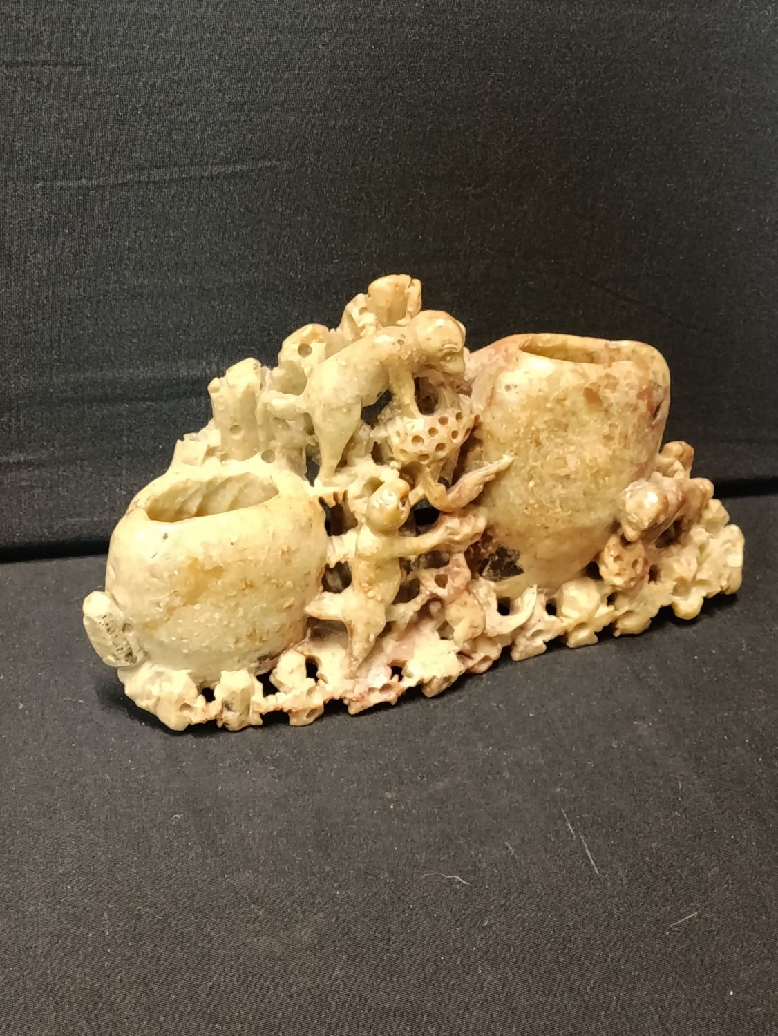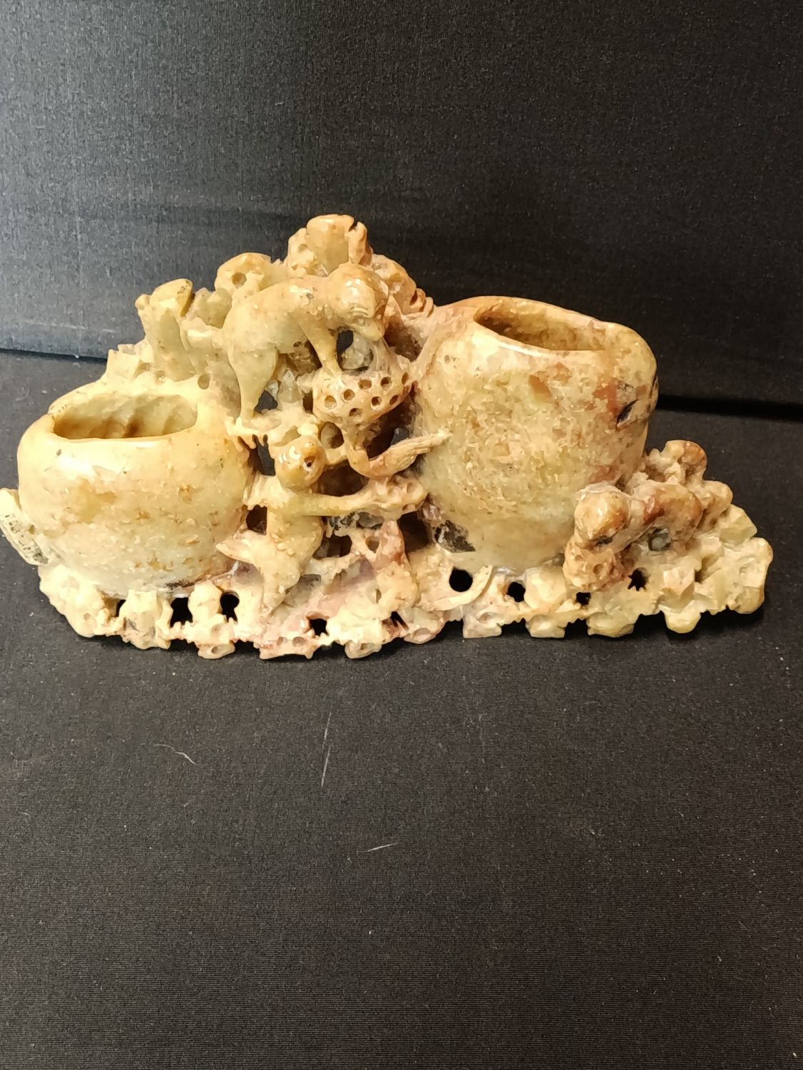 Vintage chinese Soapstone carving of monkeys around 2 bowls