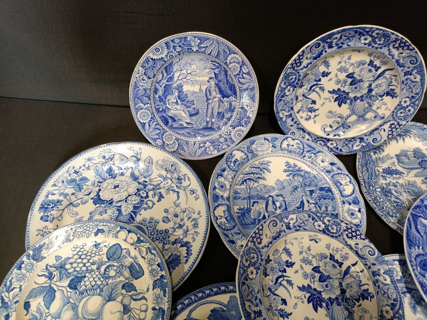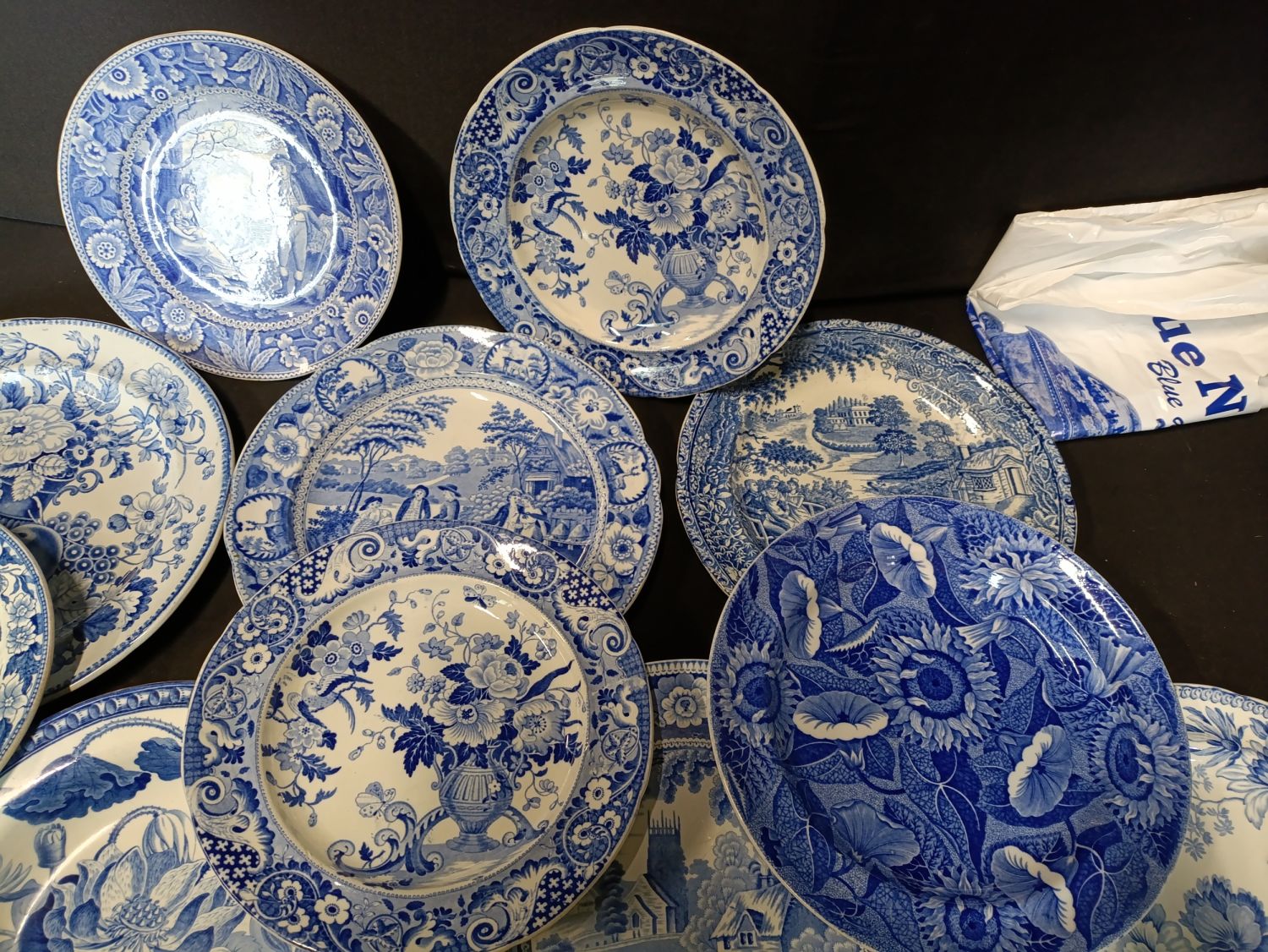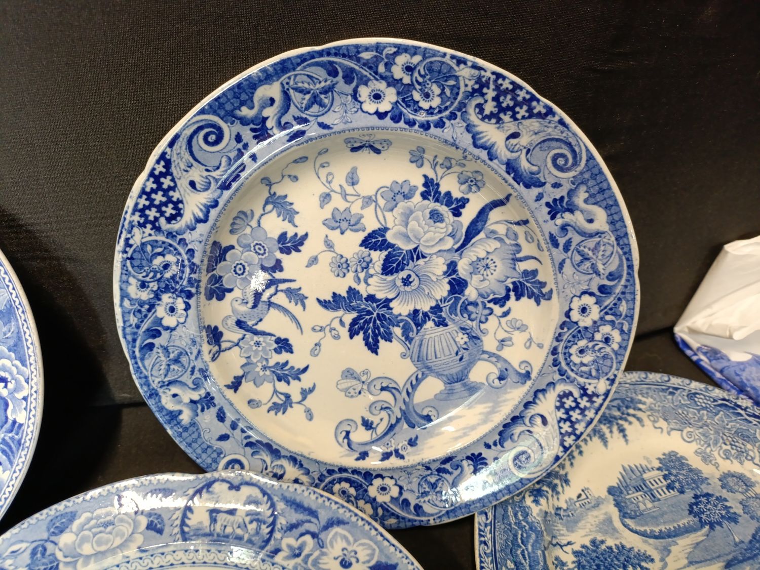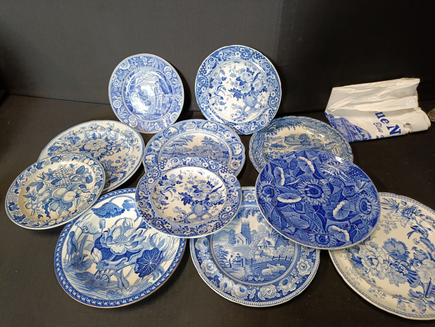 Collection of antique blue and white plates including Spode and Wedgwood. Some dated from the early 1800s
