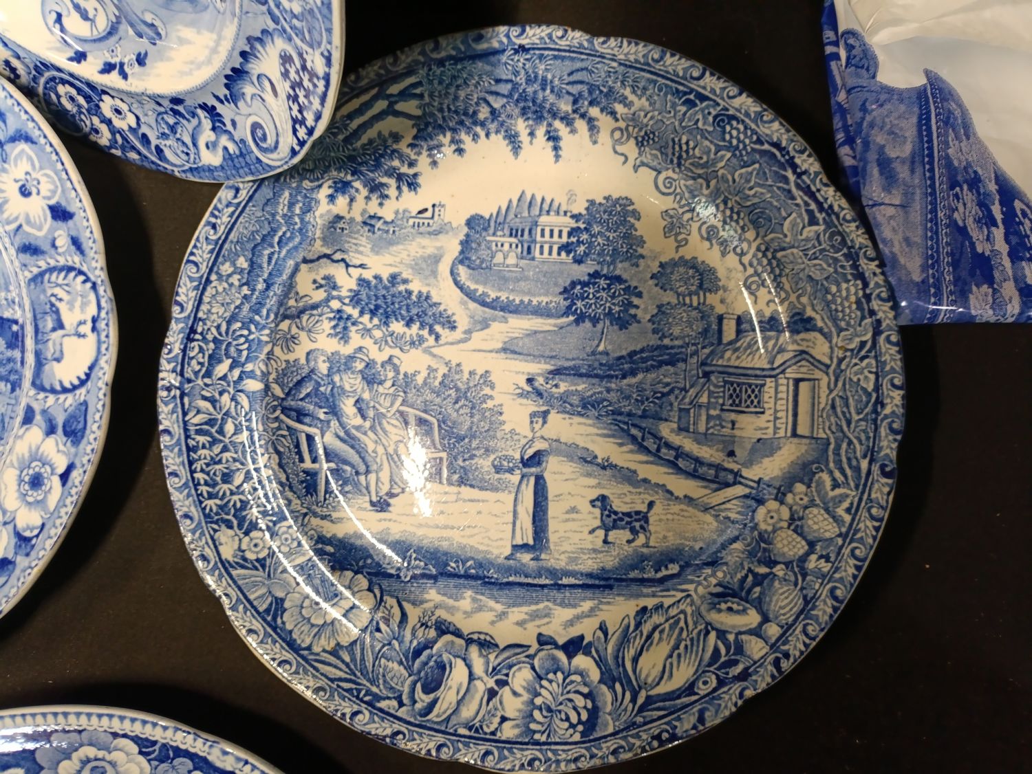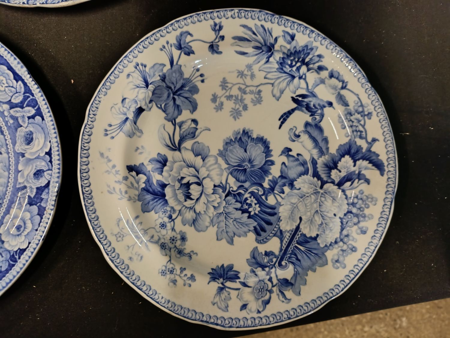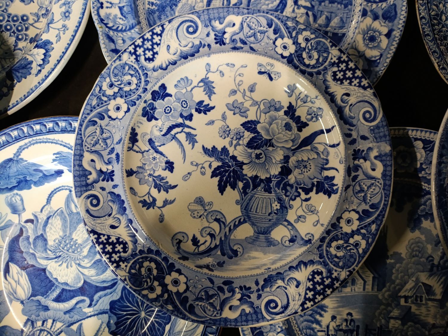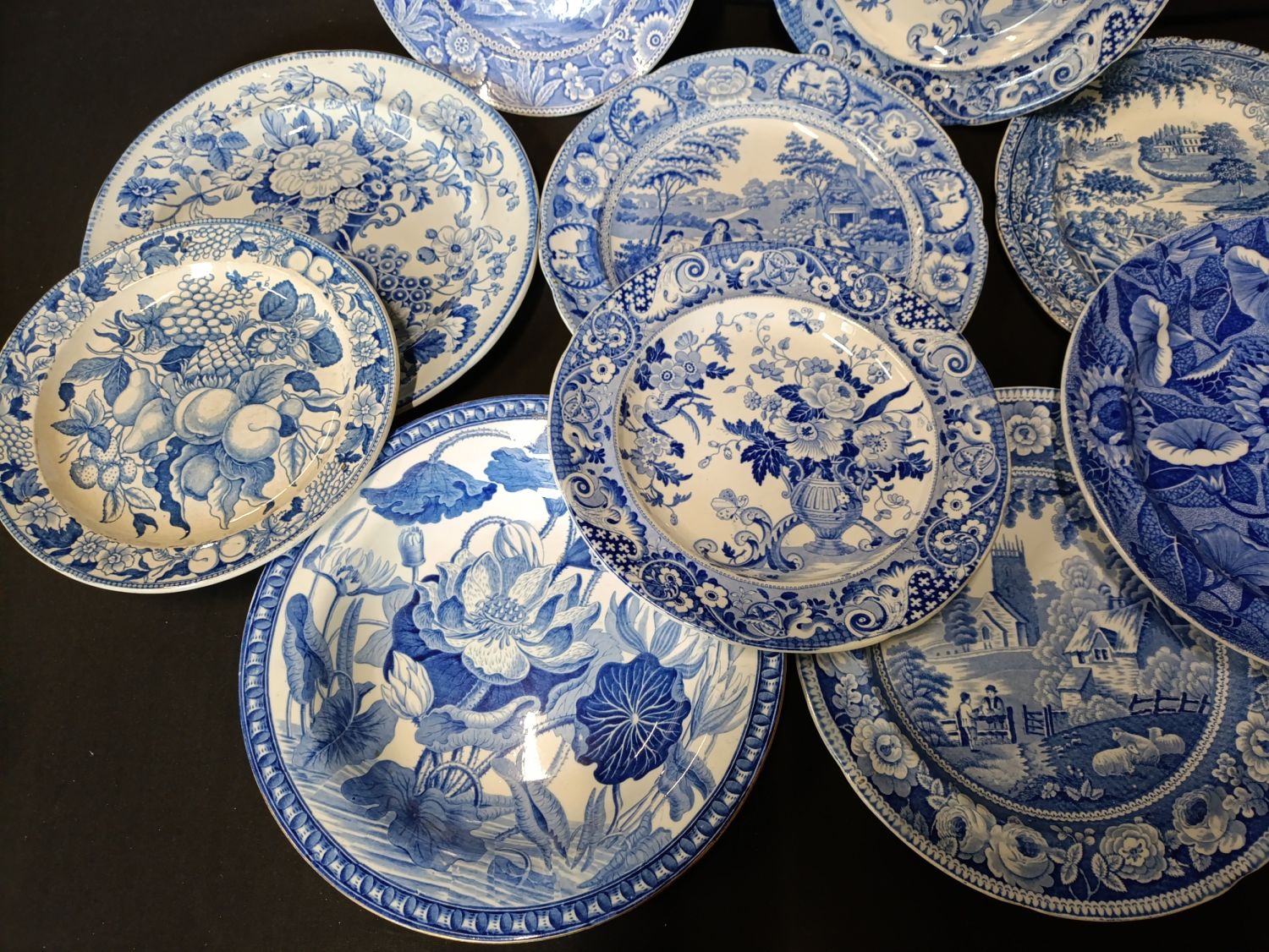 Collection of antique blue and white plates including Spode and Wedgwood. Some dated from the early 1800s