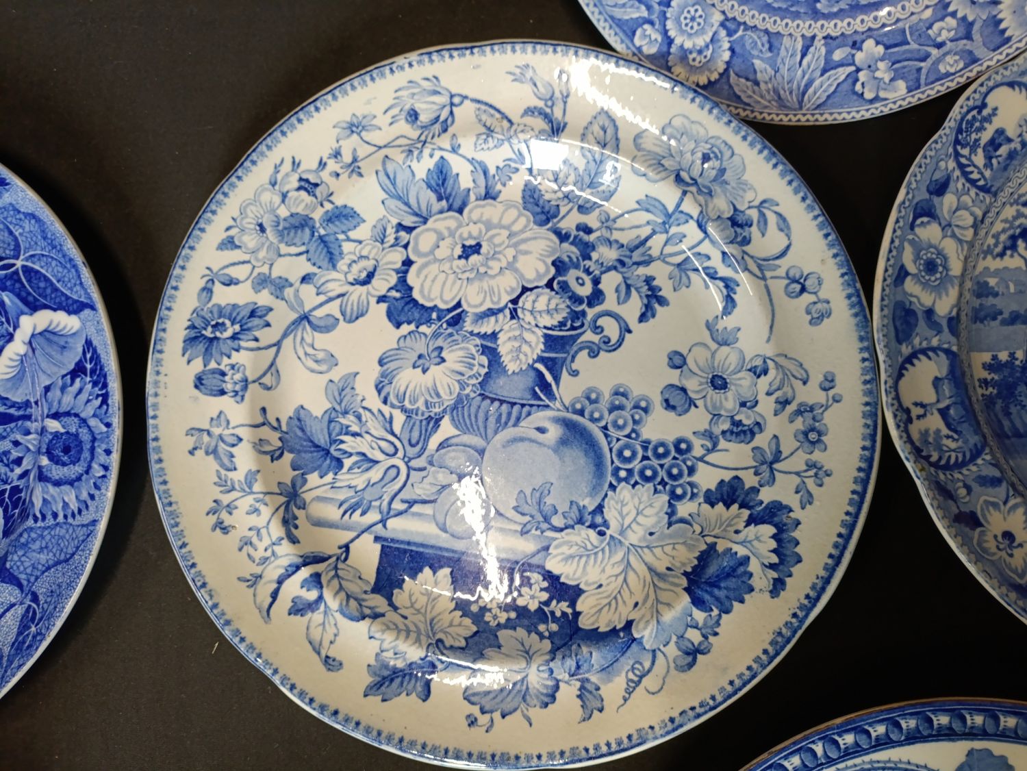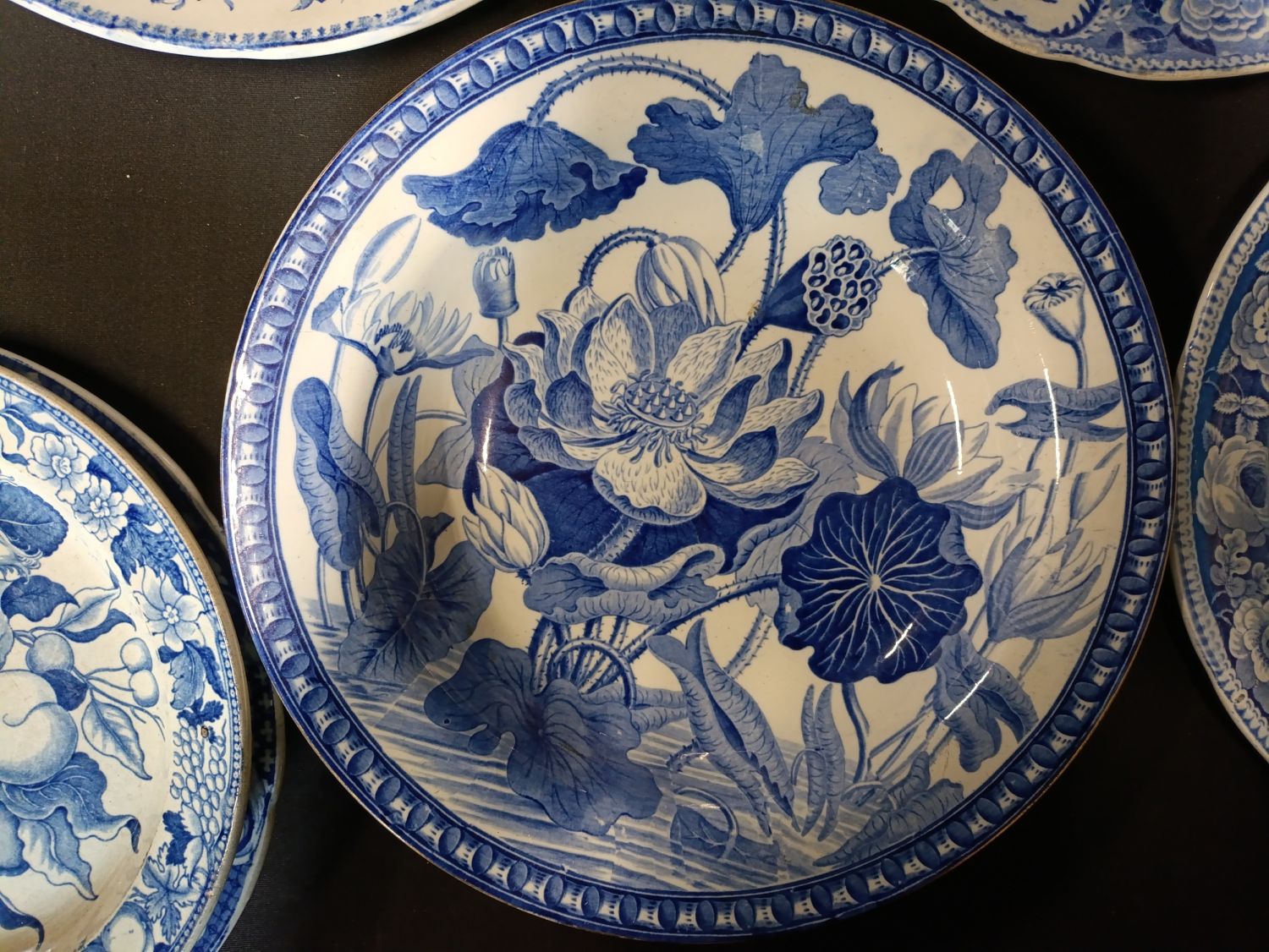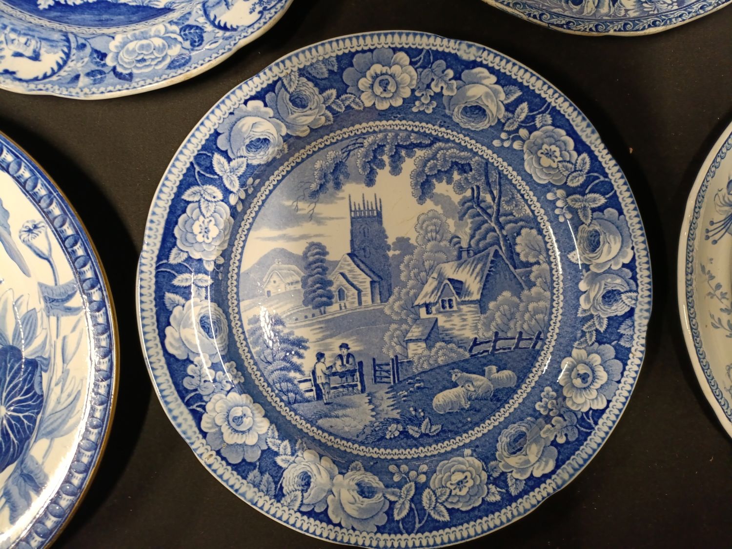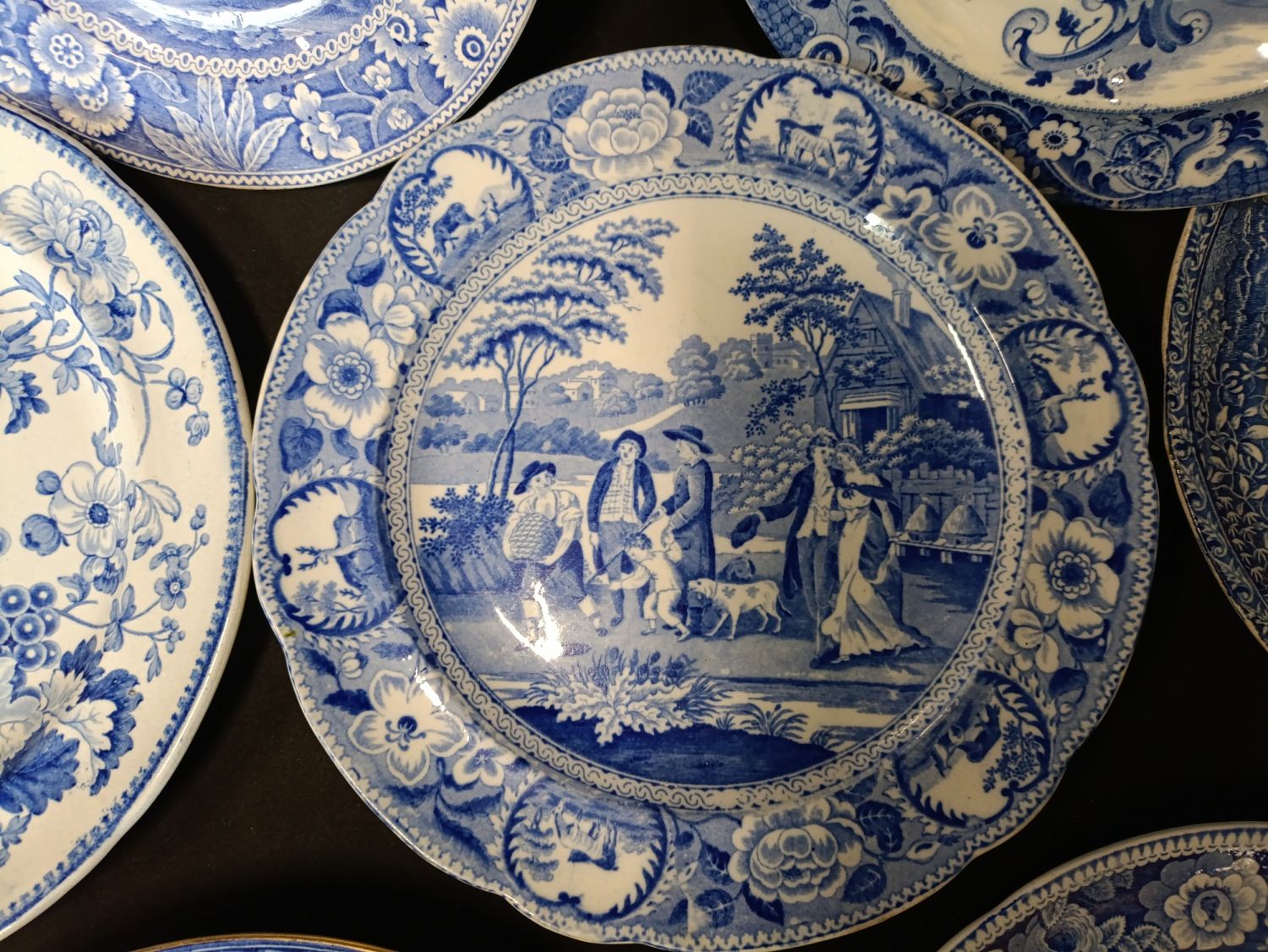 Collection of antique blue and white plates including Spode and Wedgwood. Some dated from the early 1800s