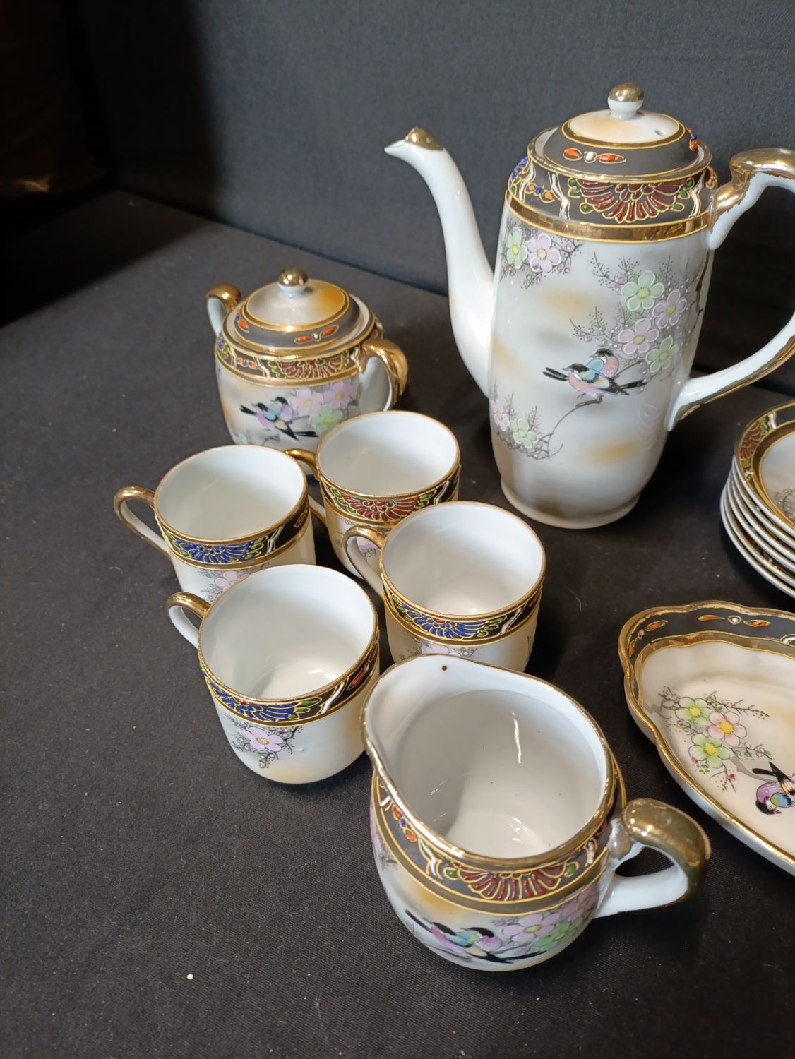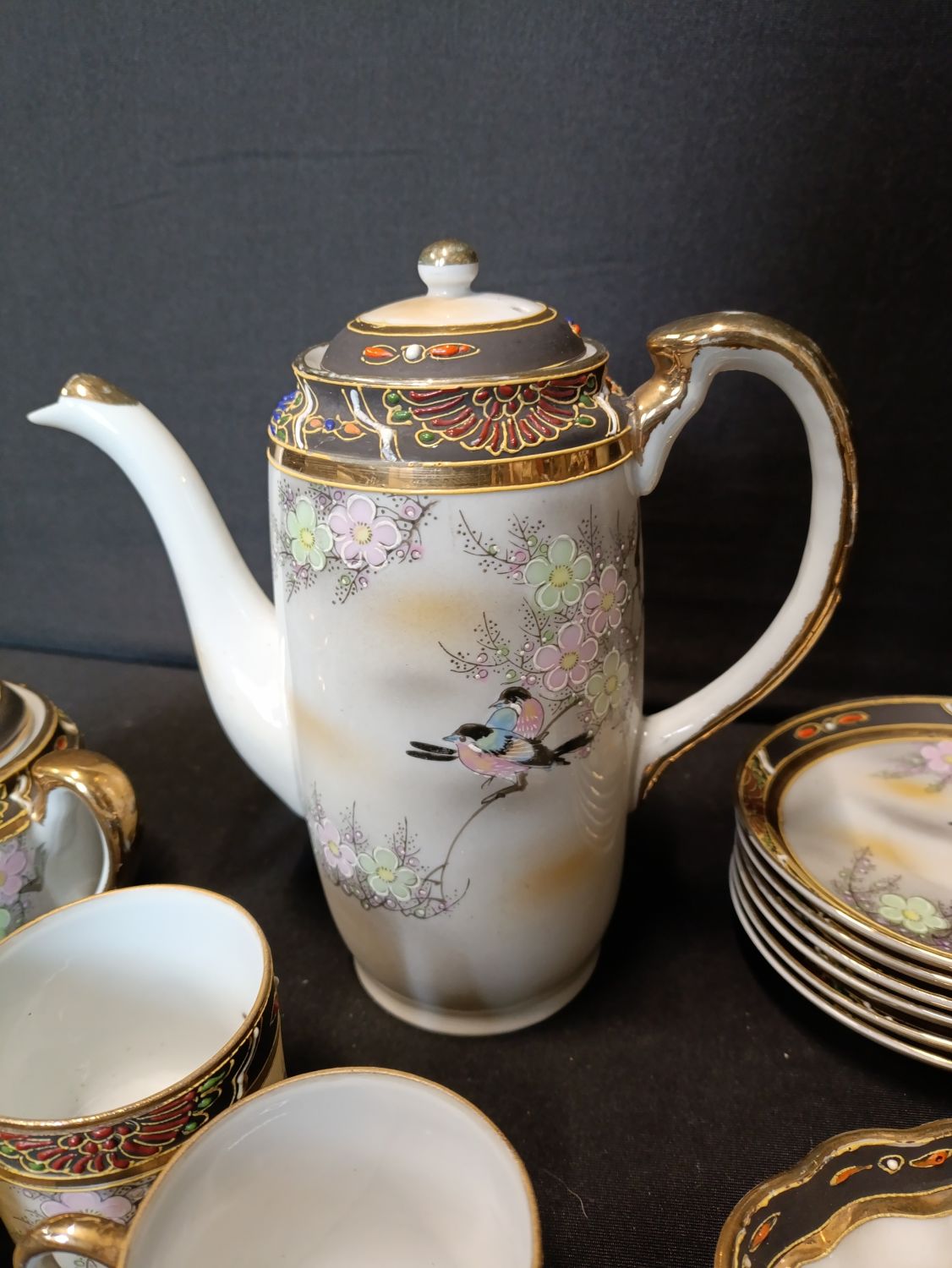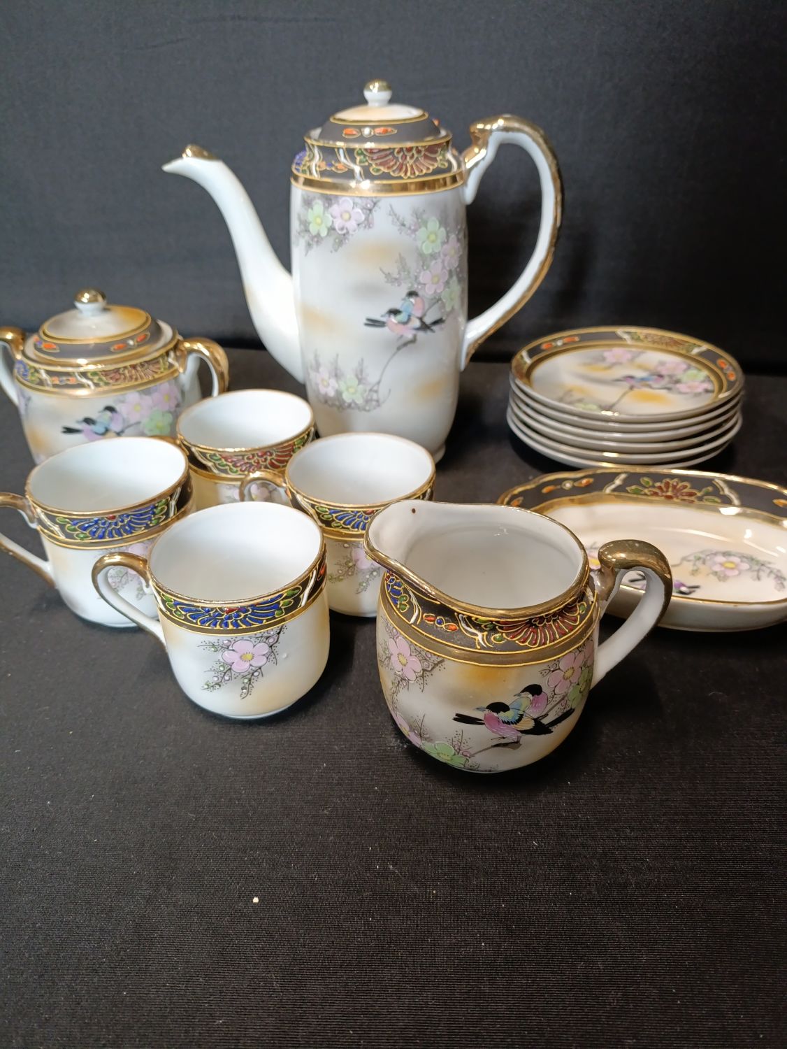 Vintage Japanese hand painted coffee set including coffee pot, milk jug, sugar bowl with lid, cups and saucers.