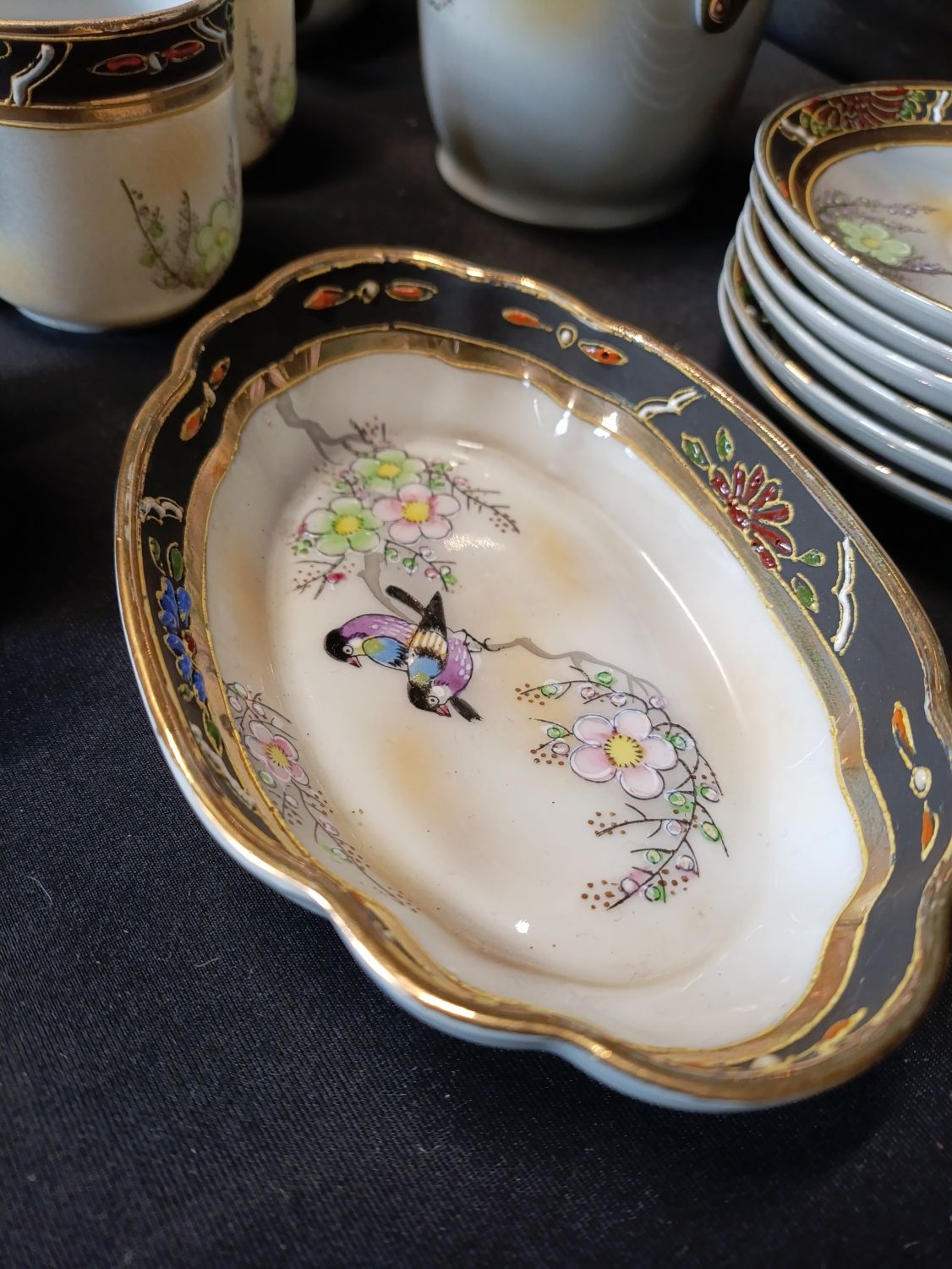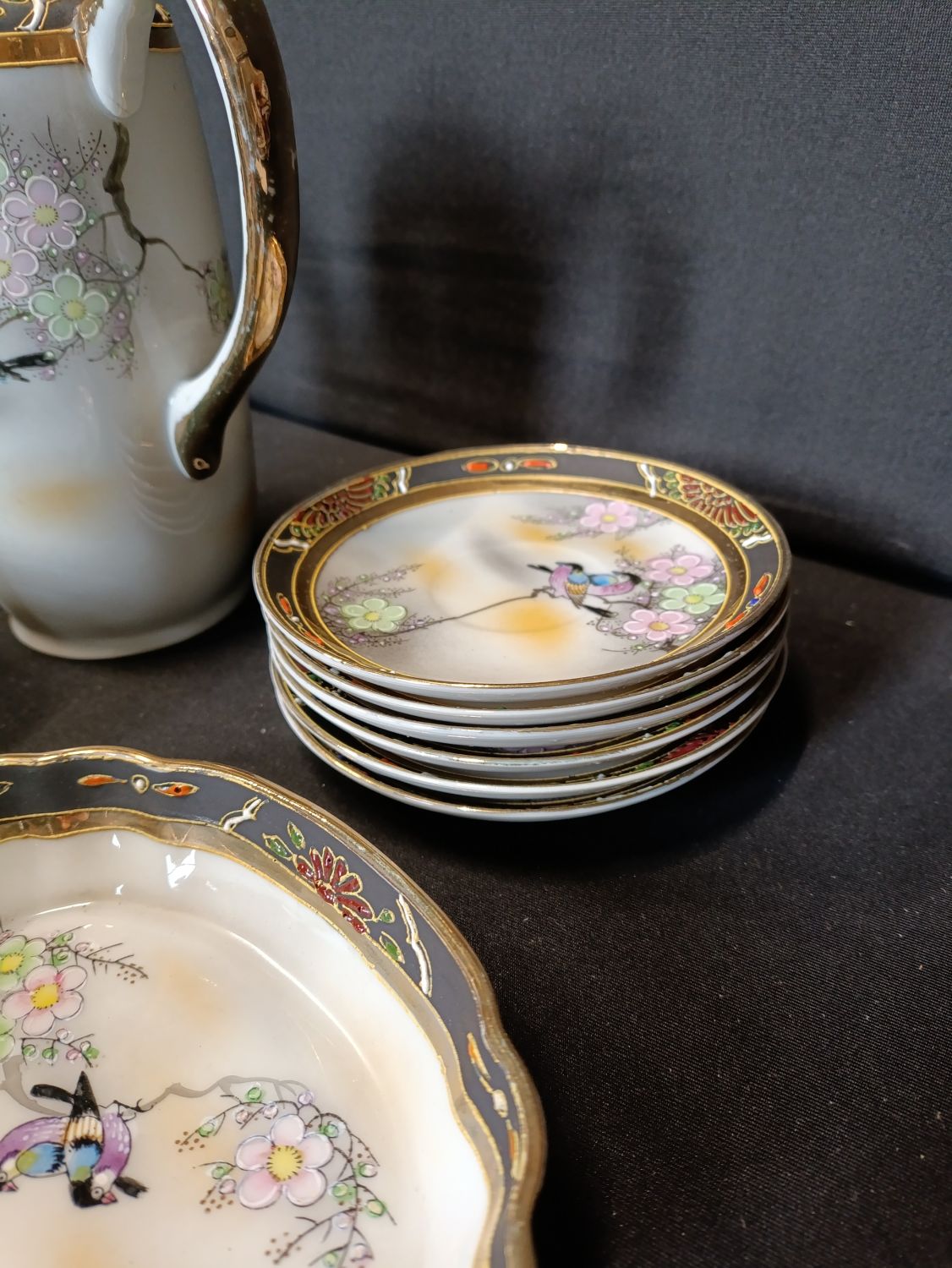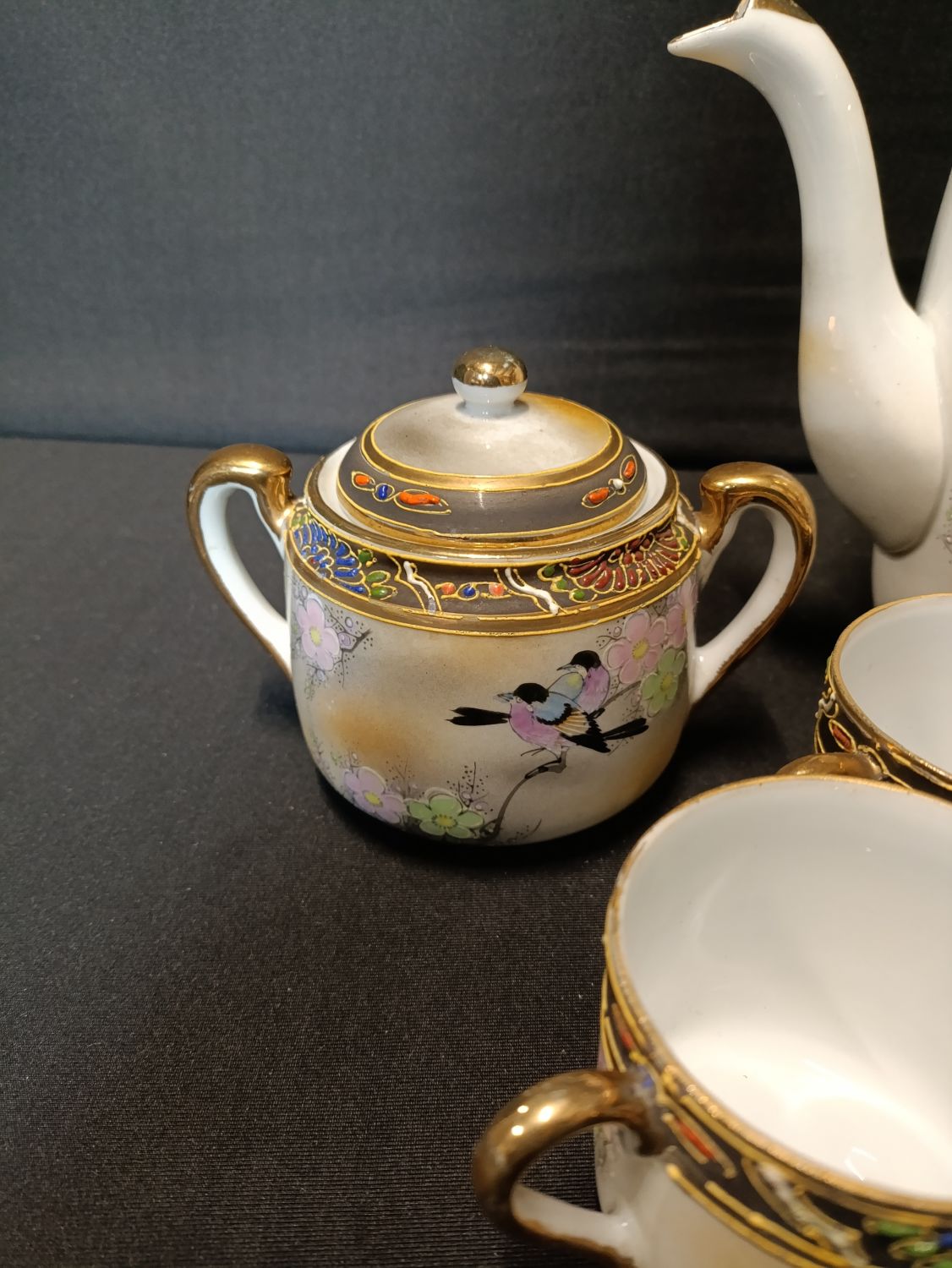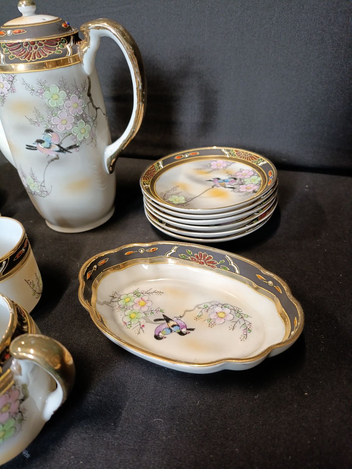 Vintage Japanese hand painted coffee set including coffee pot, milk jug, sugar bowl with lid, cups and saucers.