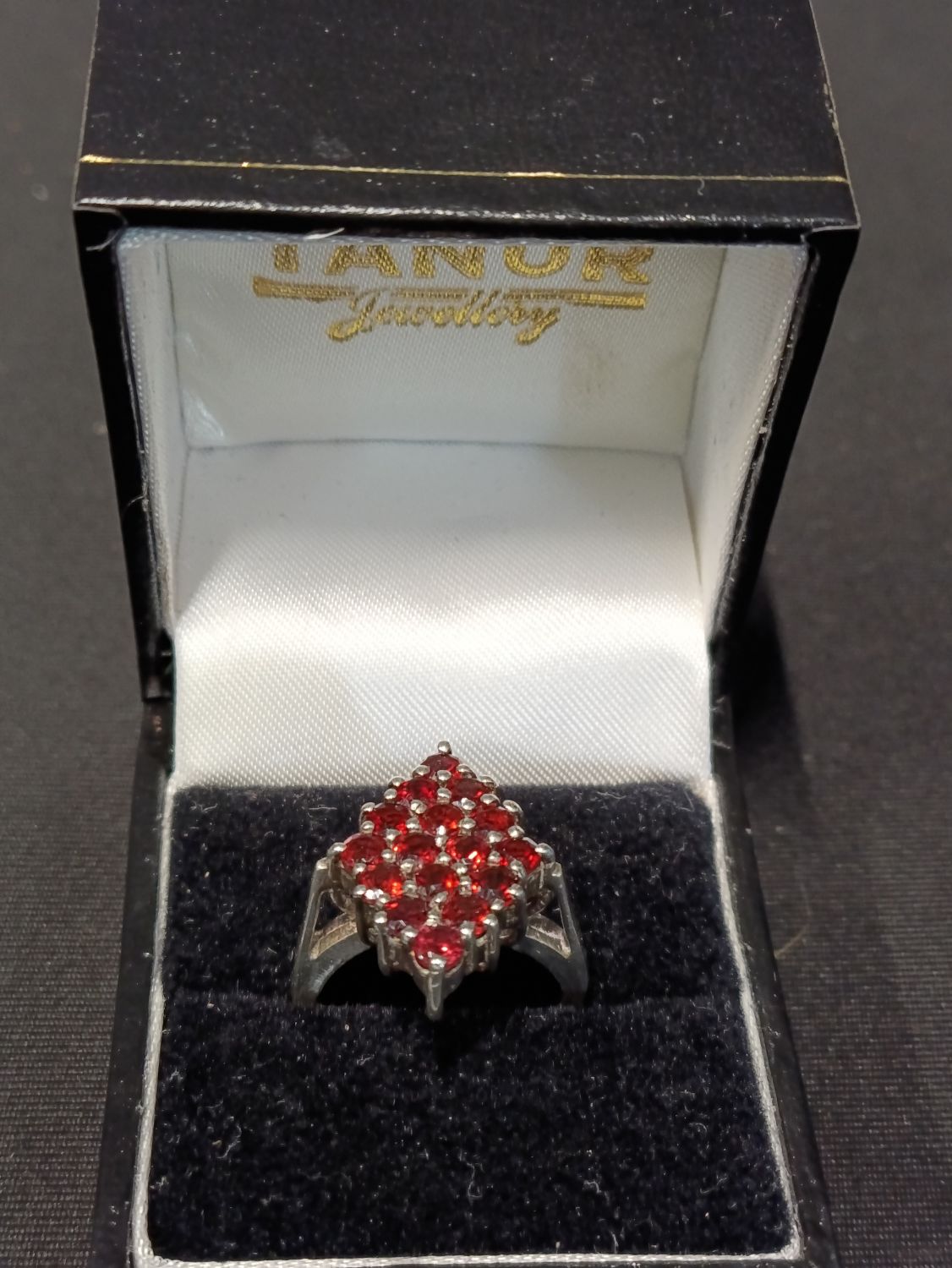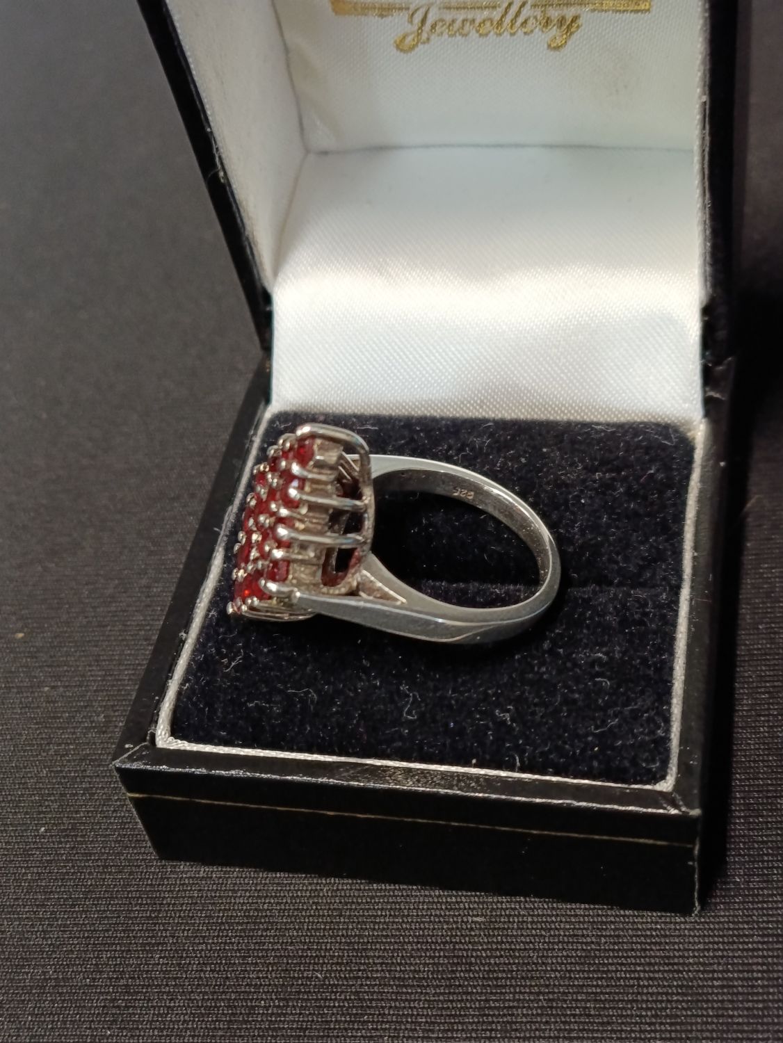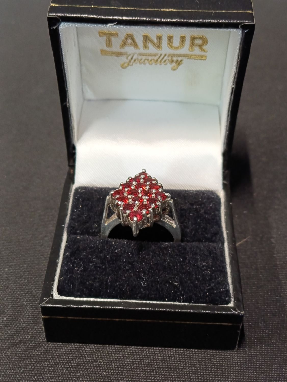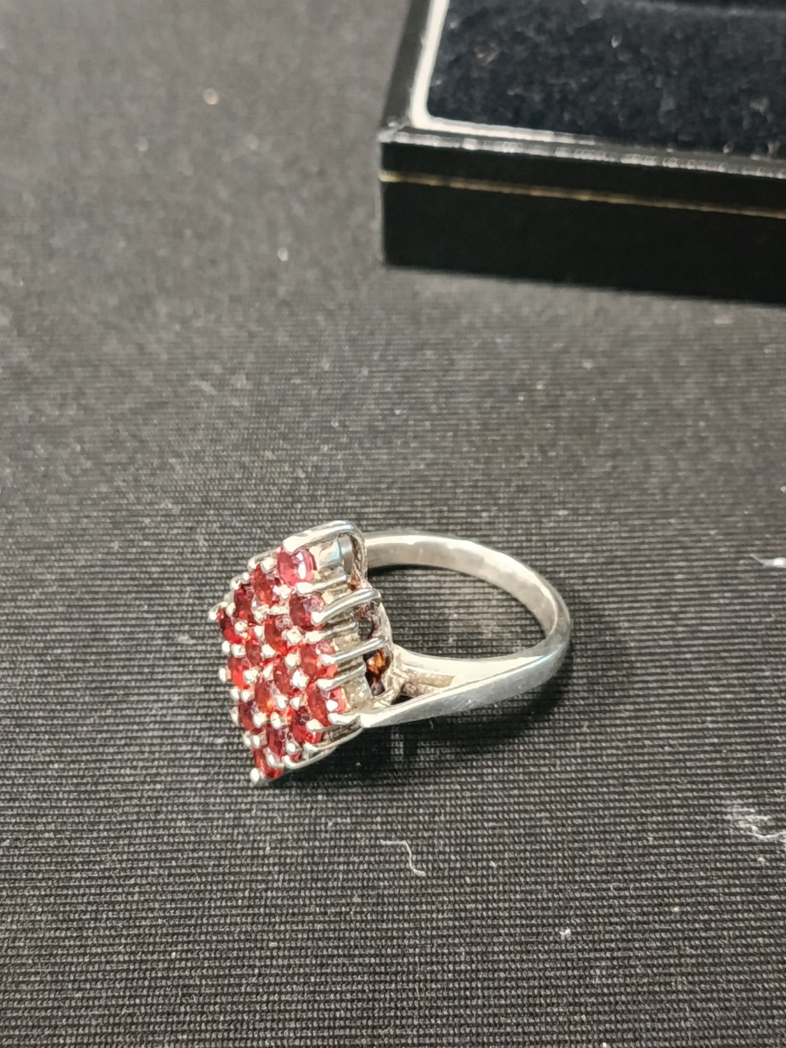 Sterling silver ring with red garnet stones set in a diamond configuration. Approximately size J.