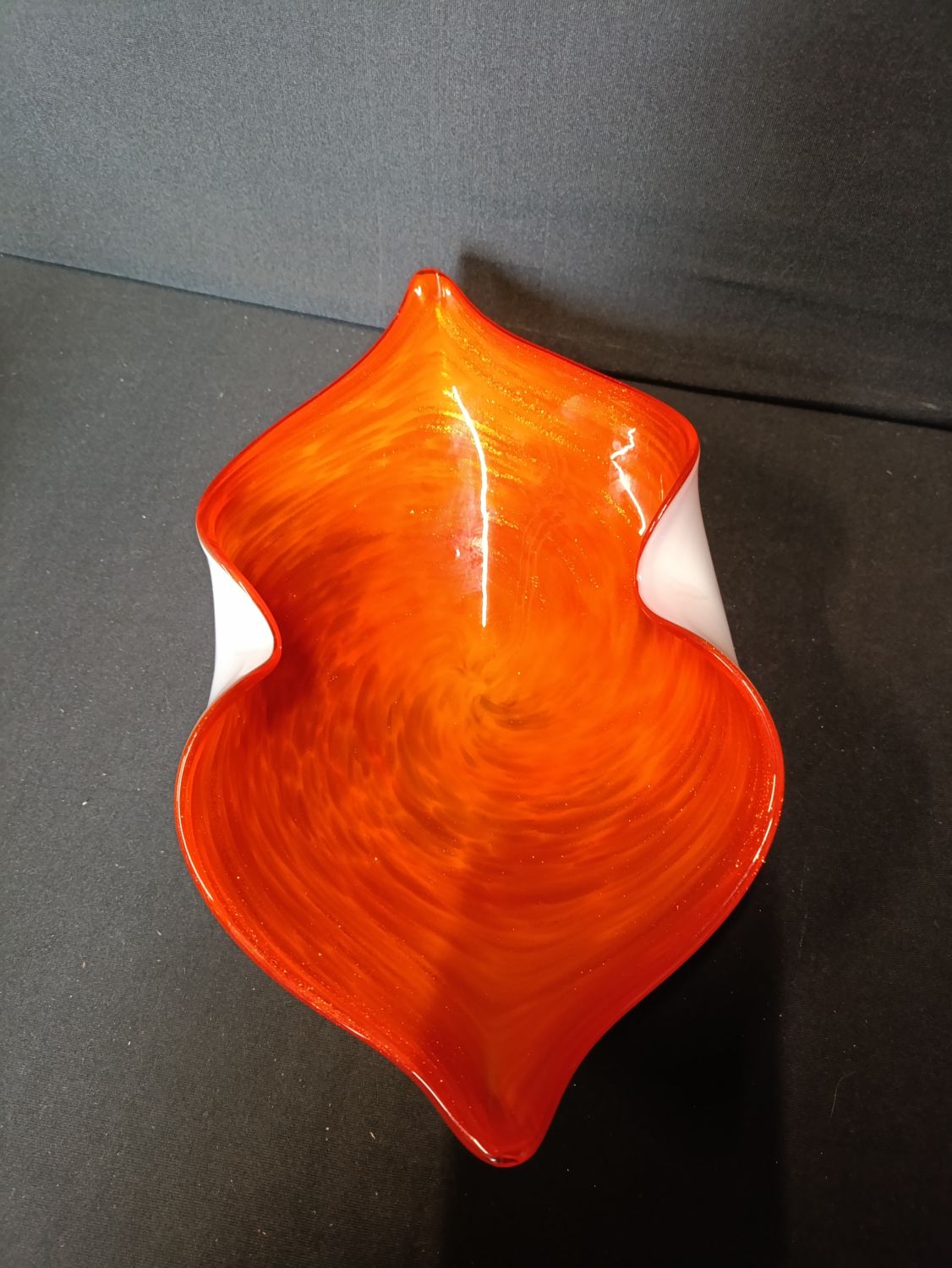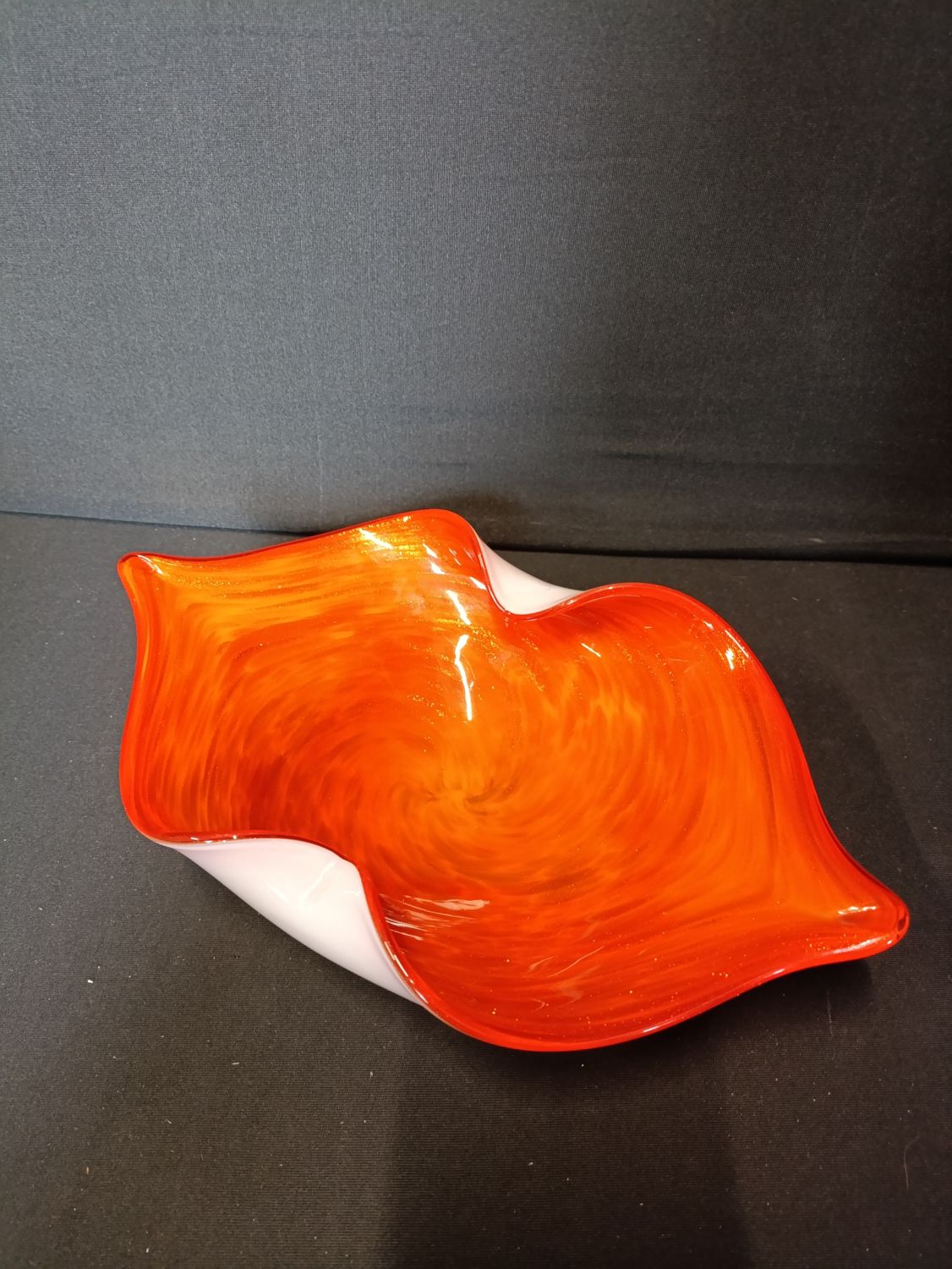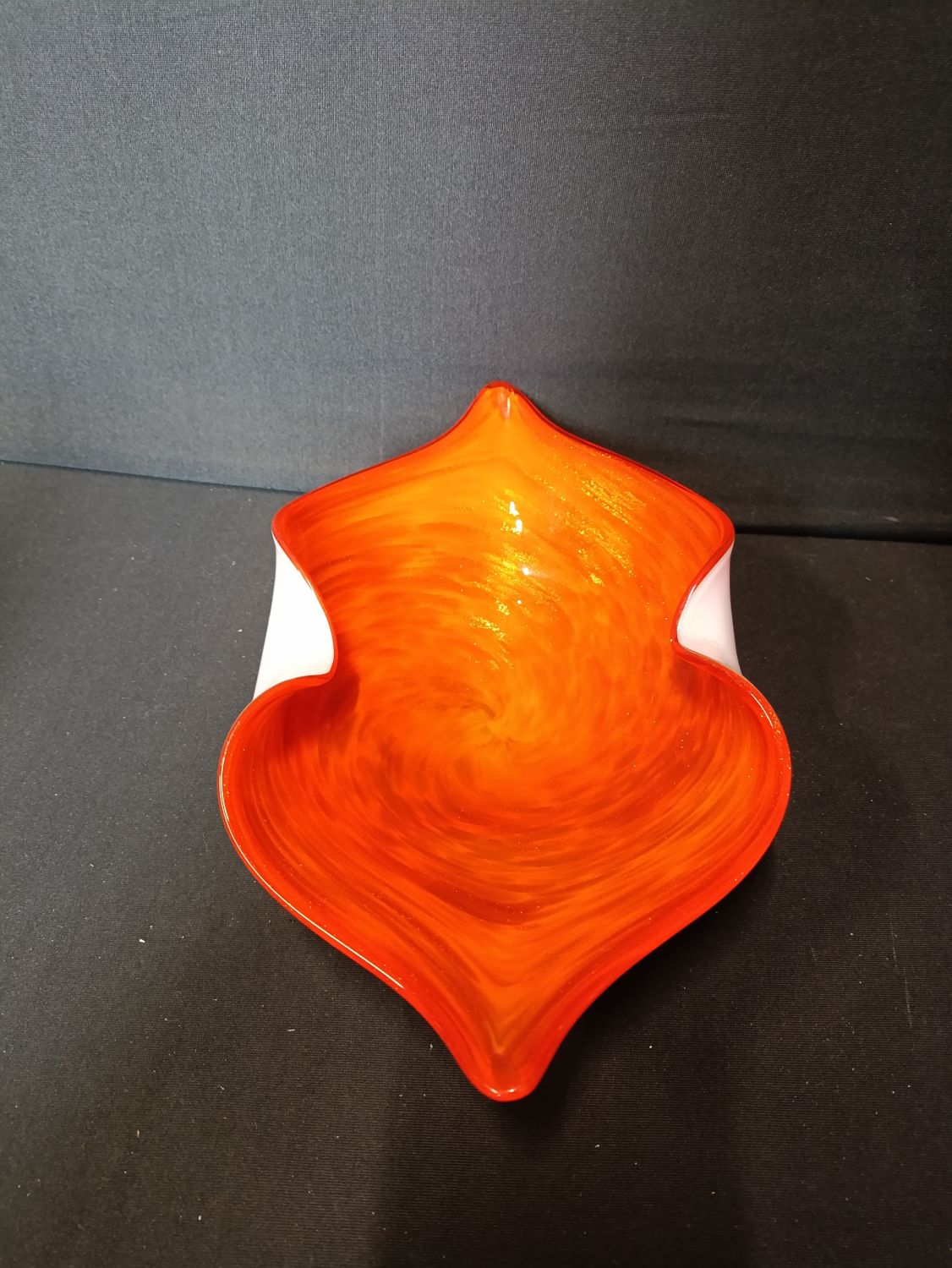 French hand made decorative orange glass bowl with glitter flashes throughout