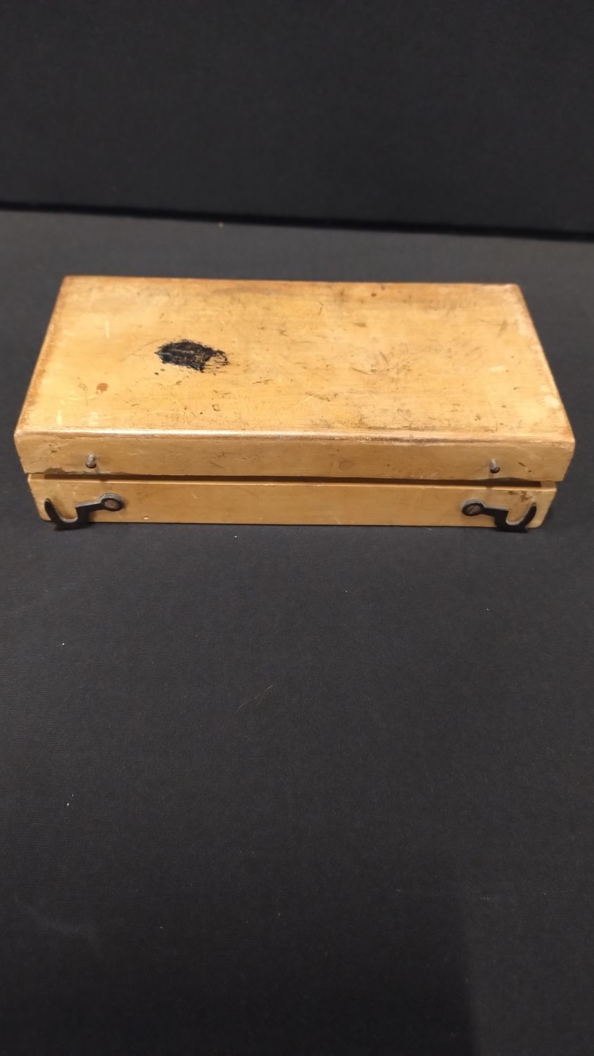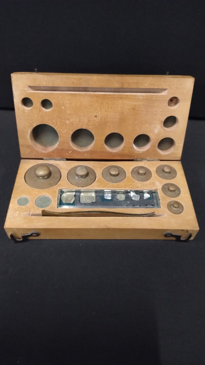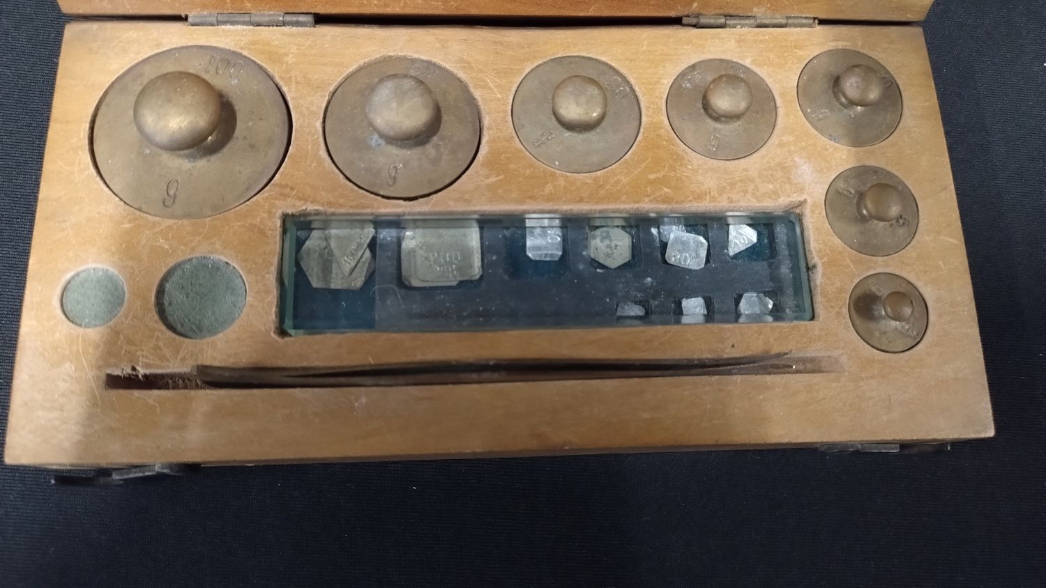 Jewellery weighing set comprises of brass weights, and white metal piece weights in a glass topped compartment, and brass tweezers (two weights missing) all set in a wooden box with hook clasps.
