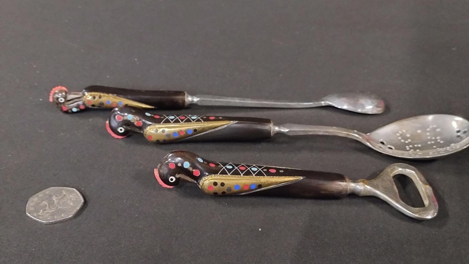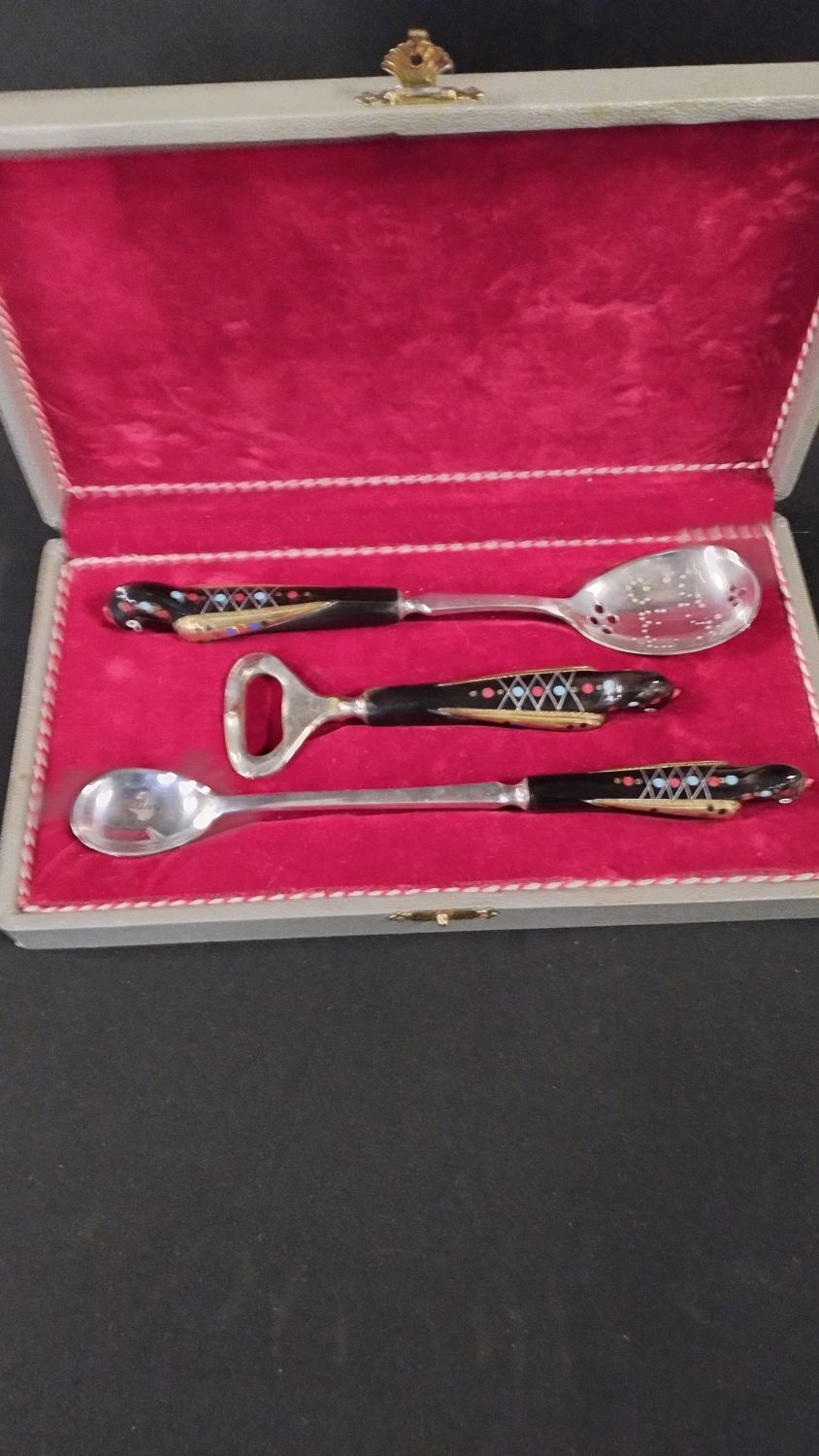 Haddad Jezzin three piece Cutlery, Beirut, Lebanon 1960s in grey presentation box with red lining