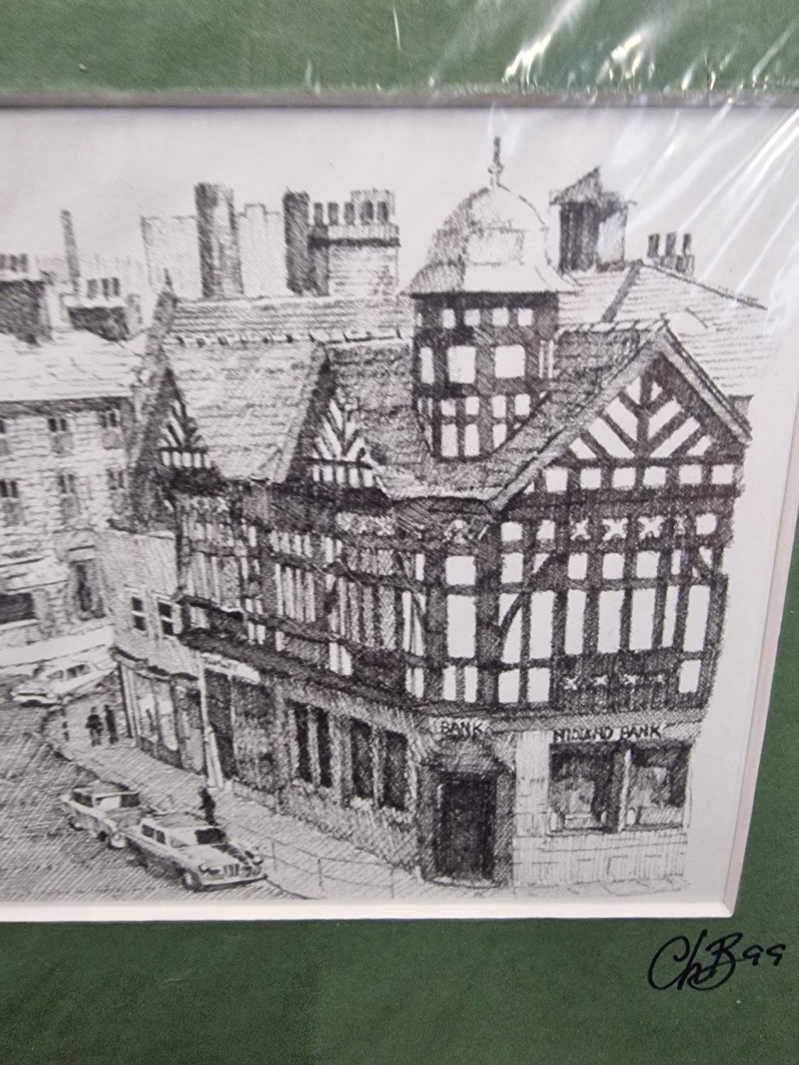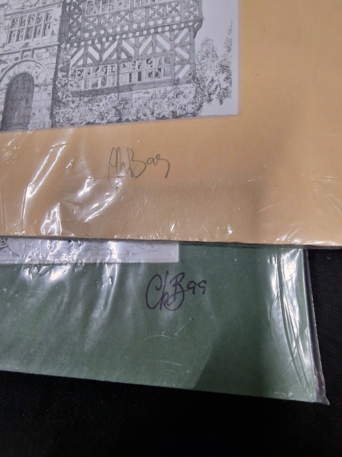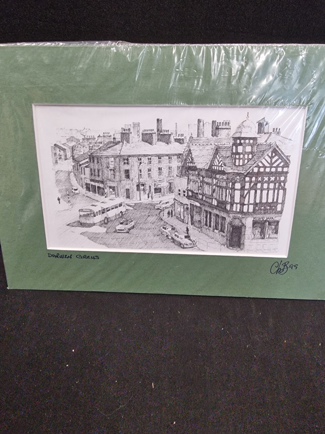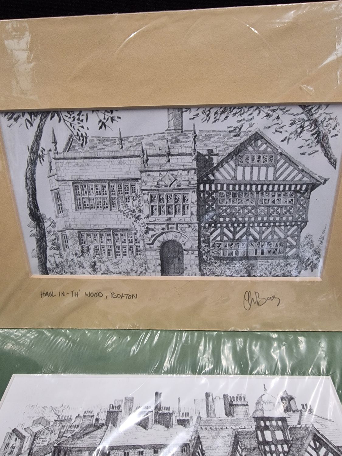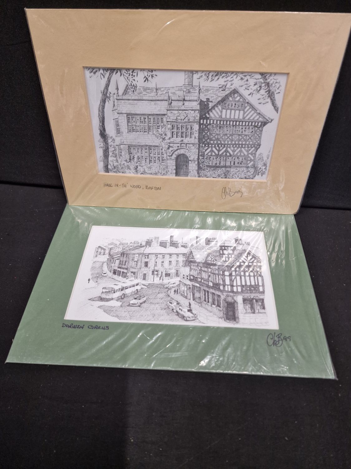 Two mounted hand drawn stencil pictures. Darwen circus and Haal in-th wood Bolton