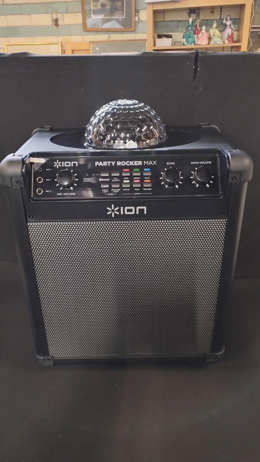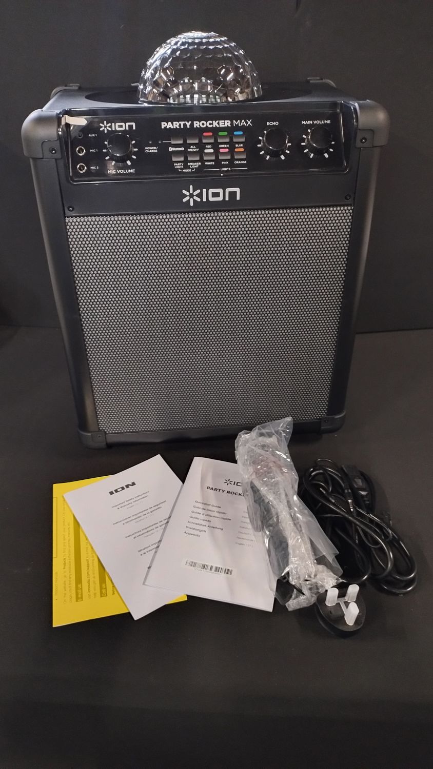 ION Party Rocker Max party speaker with light ball on top, microphone with cable,1/8-inch (3.5mm) Audio cable