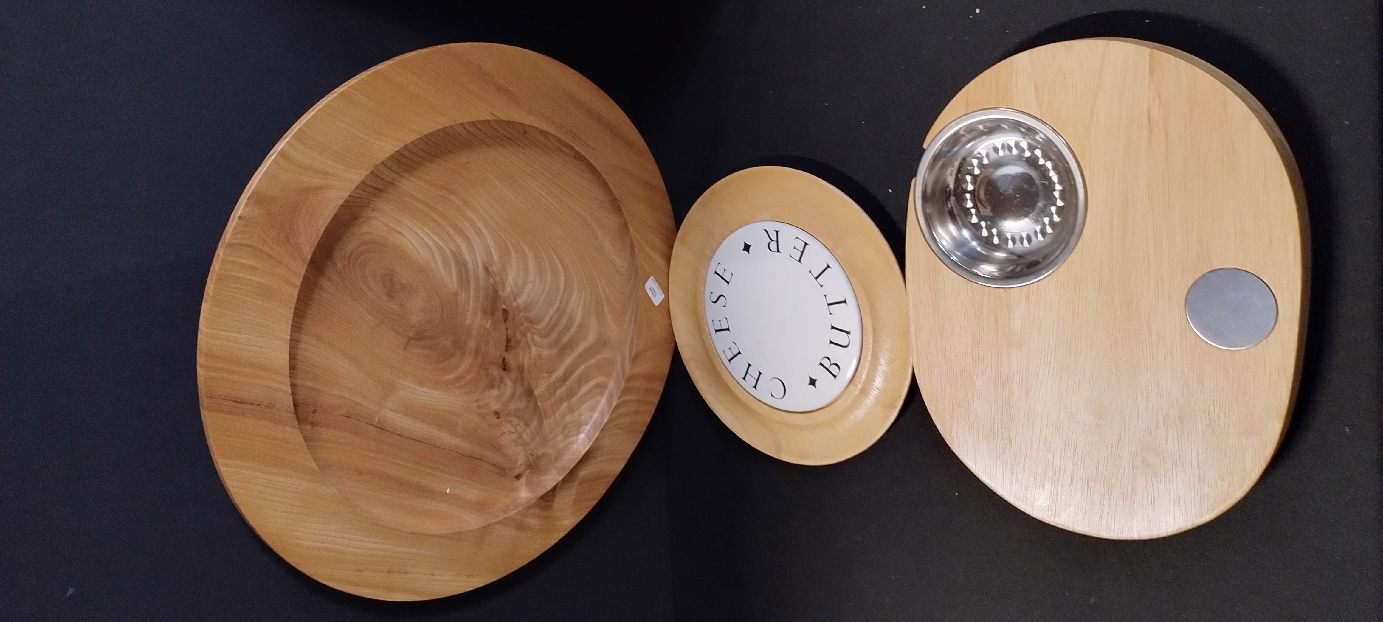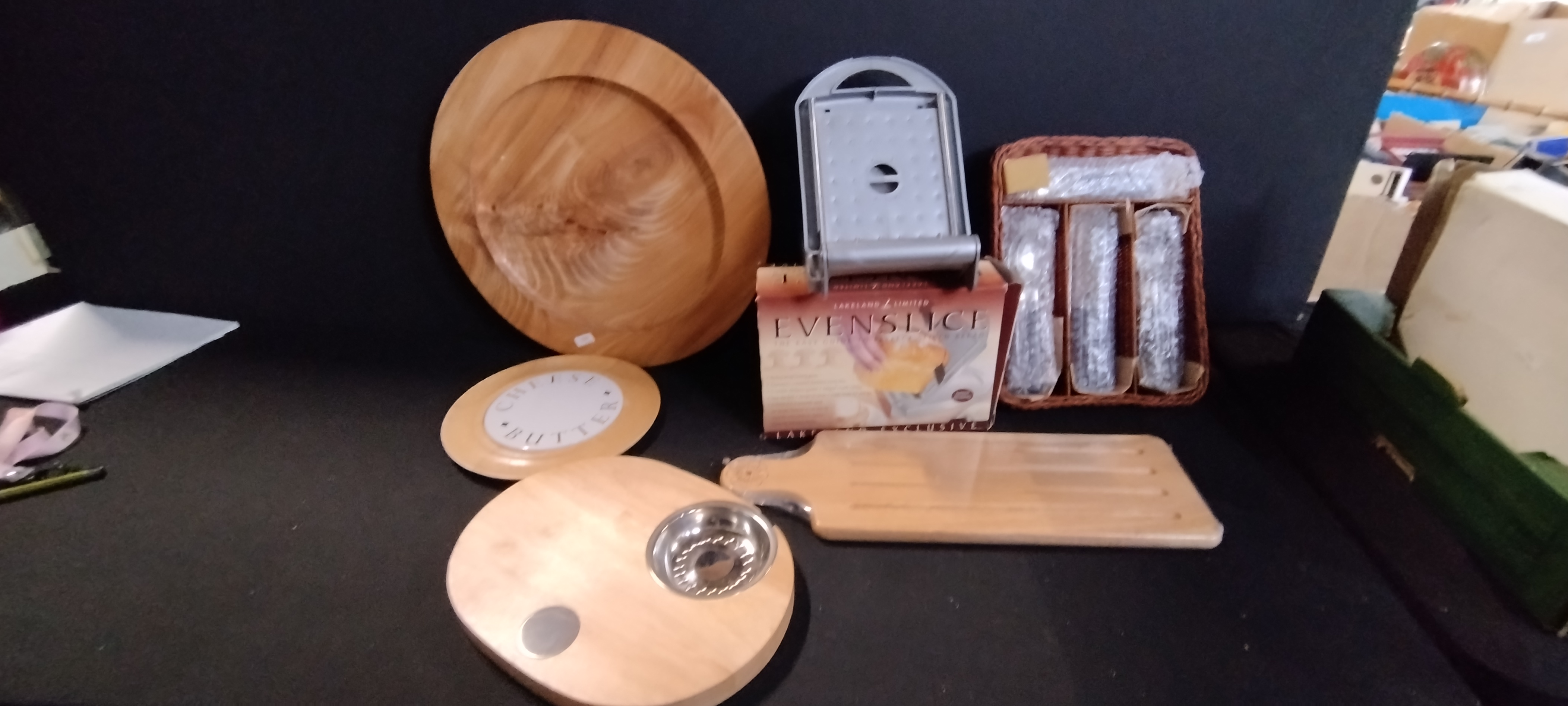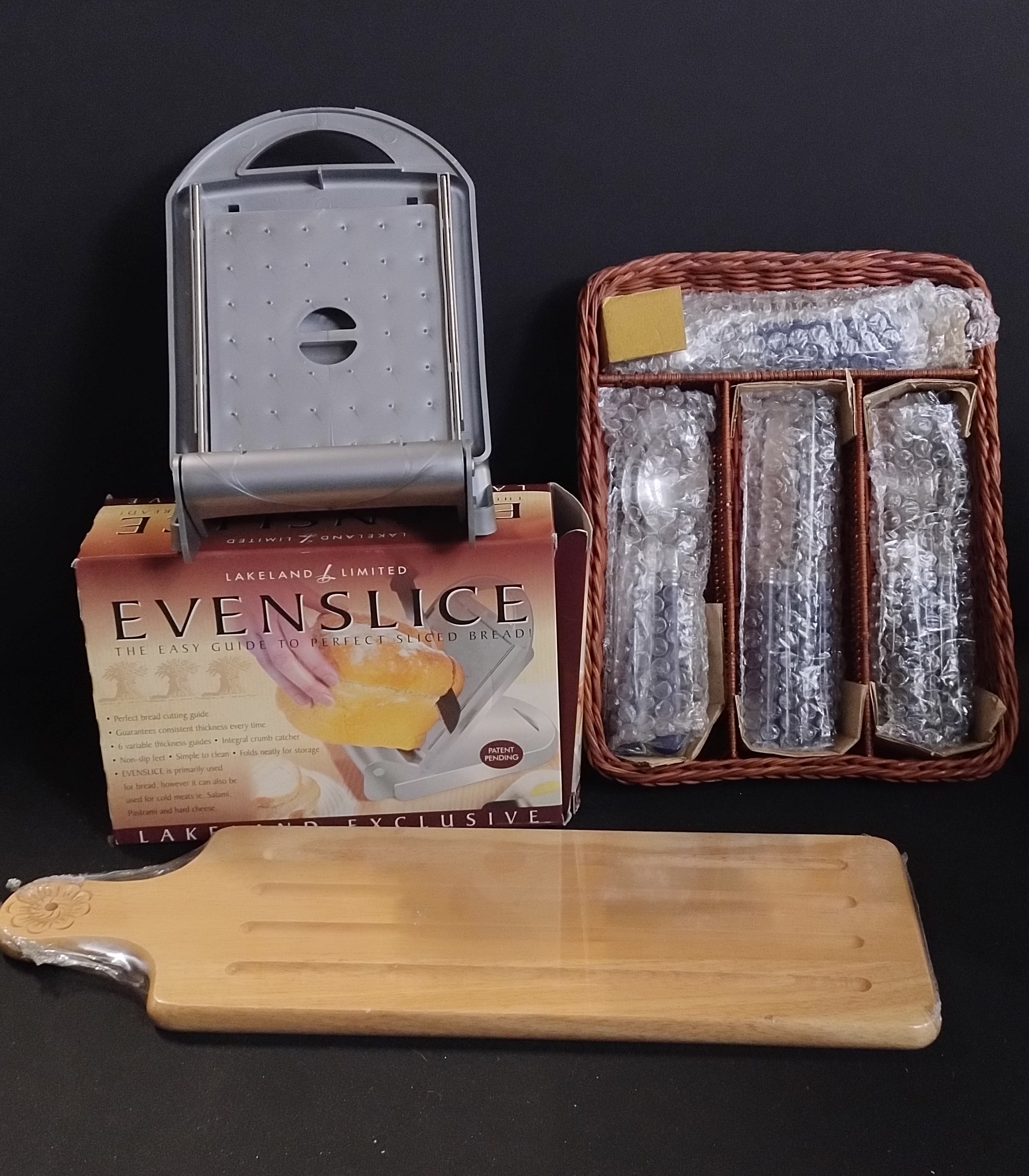 Cutlery set in a woven basket, baguette board, bread slice, and other wooden kitchen items