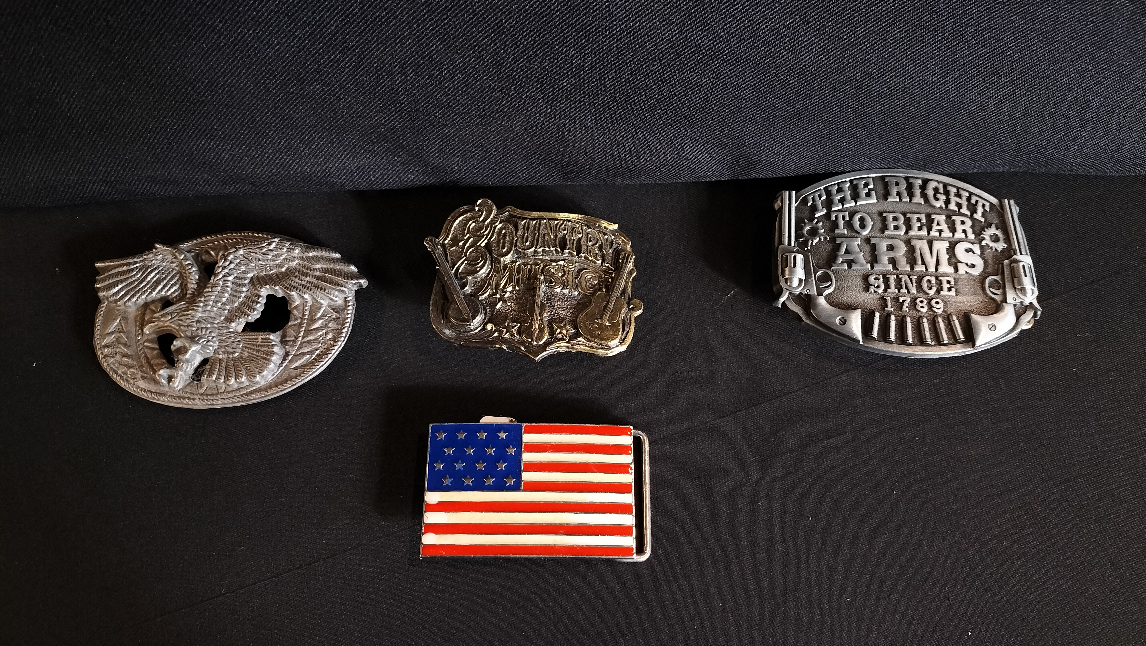 Four Belt Buckles. American Flag, Eagle, Country Music, and The Right To Bear Arms