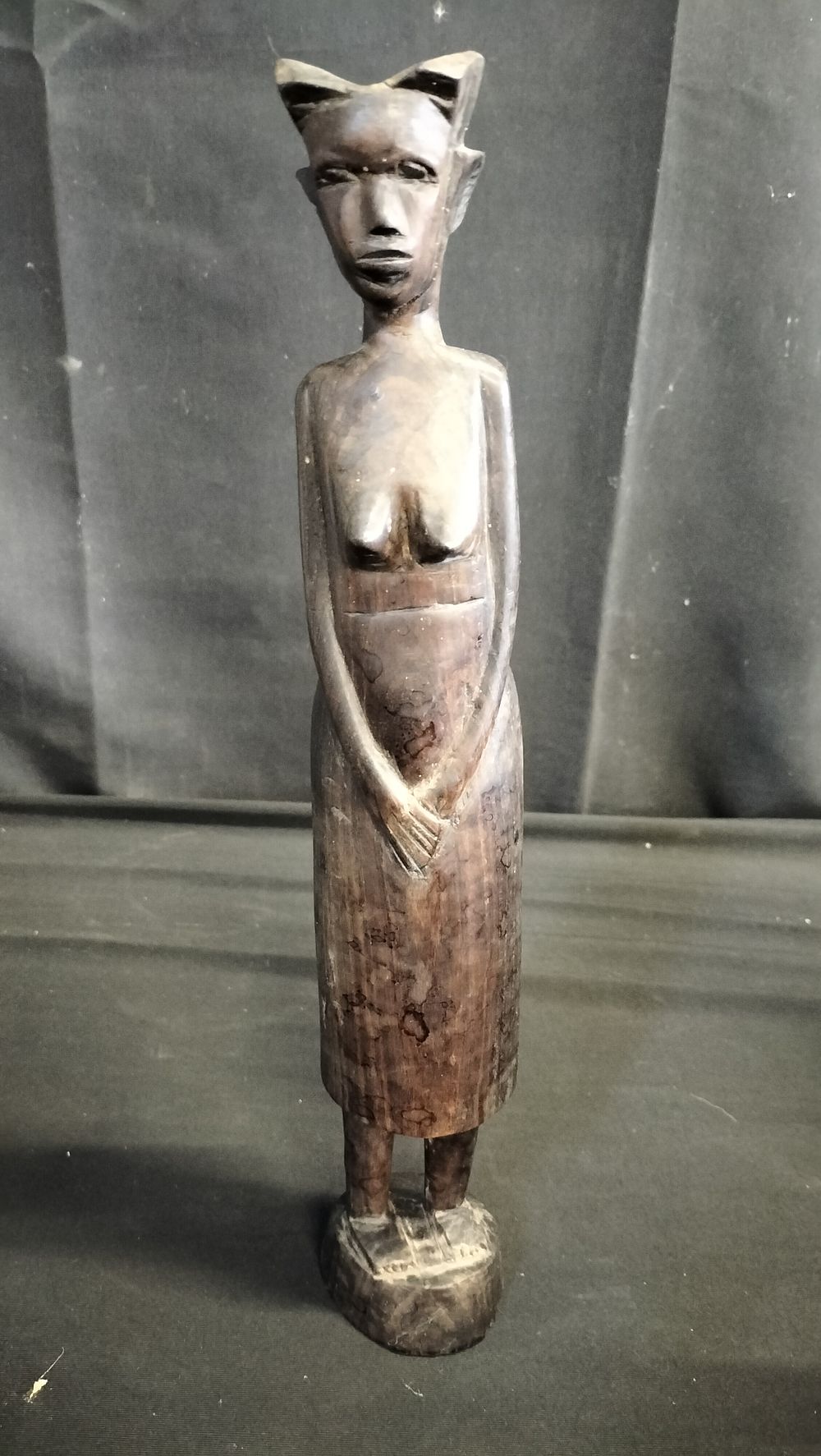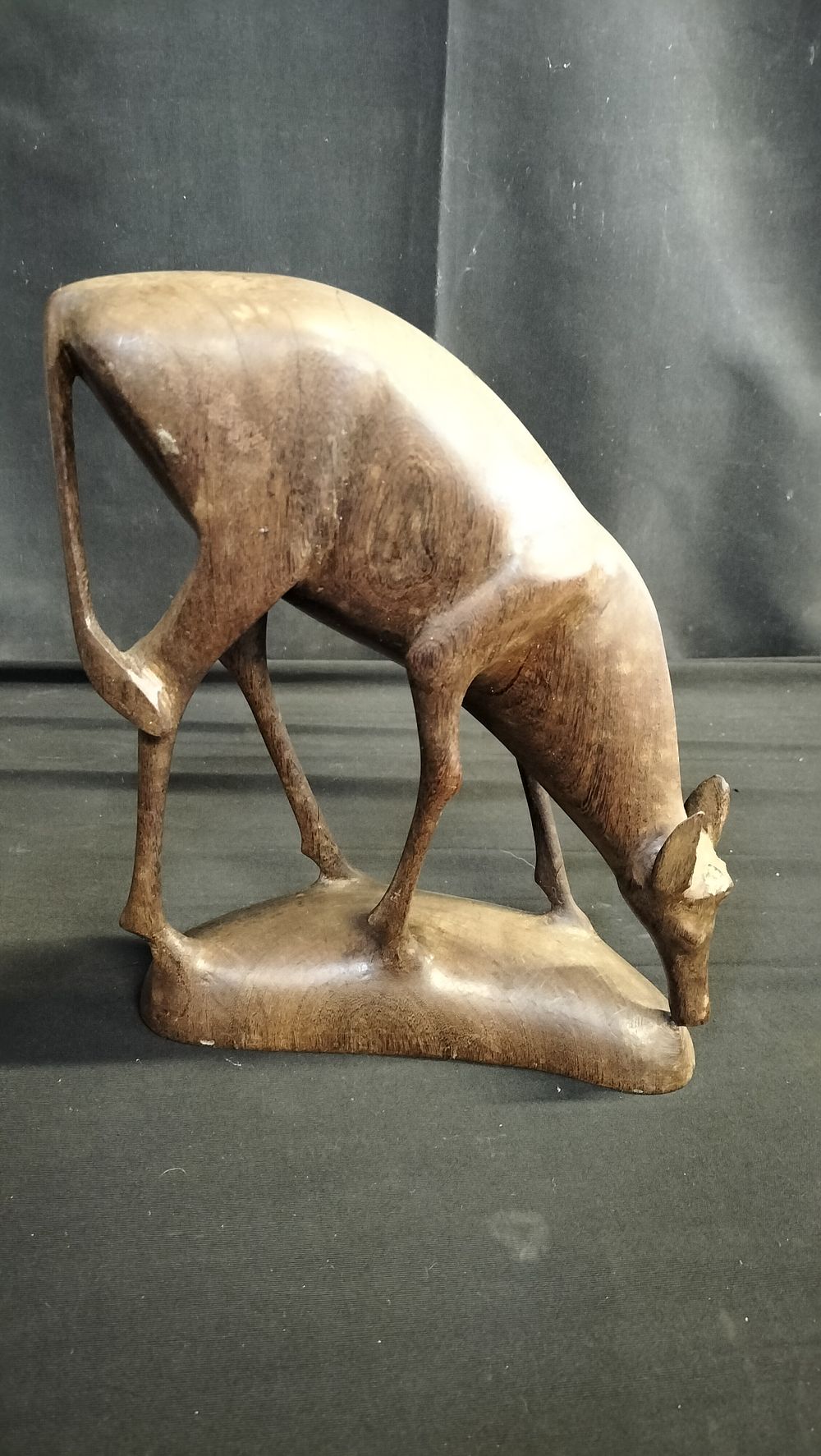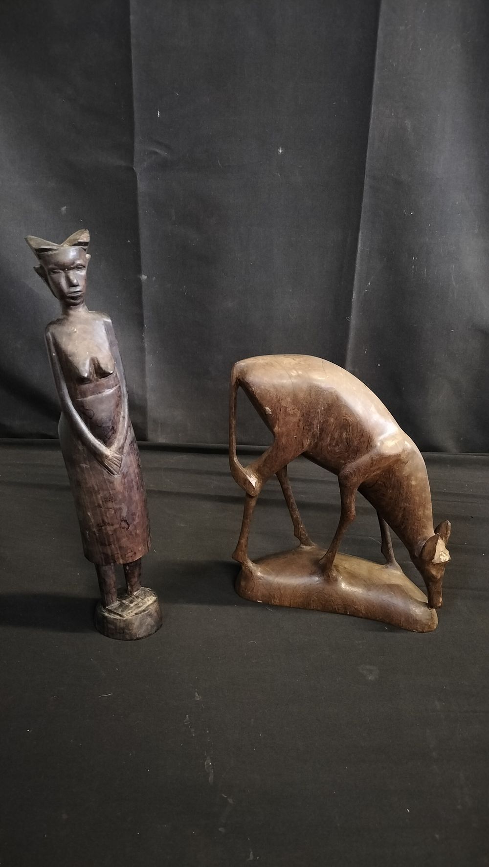 Two Wooden Figurines One African Woman 33cm Tall and One Gazelle 24cm Tall