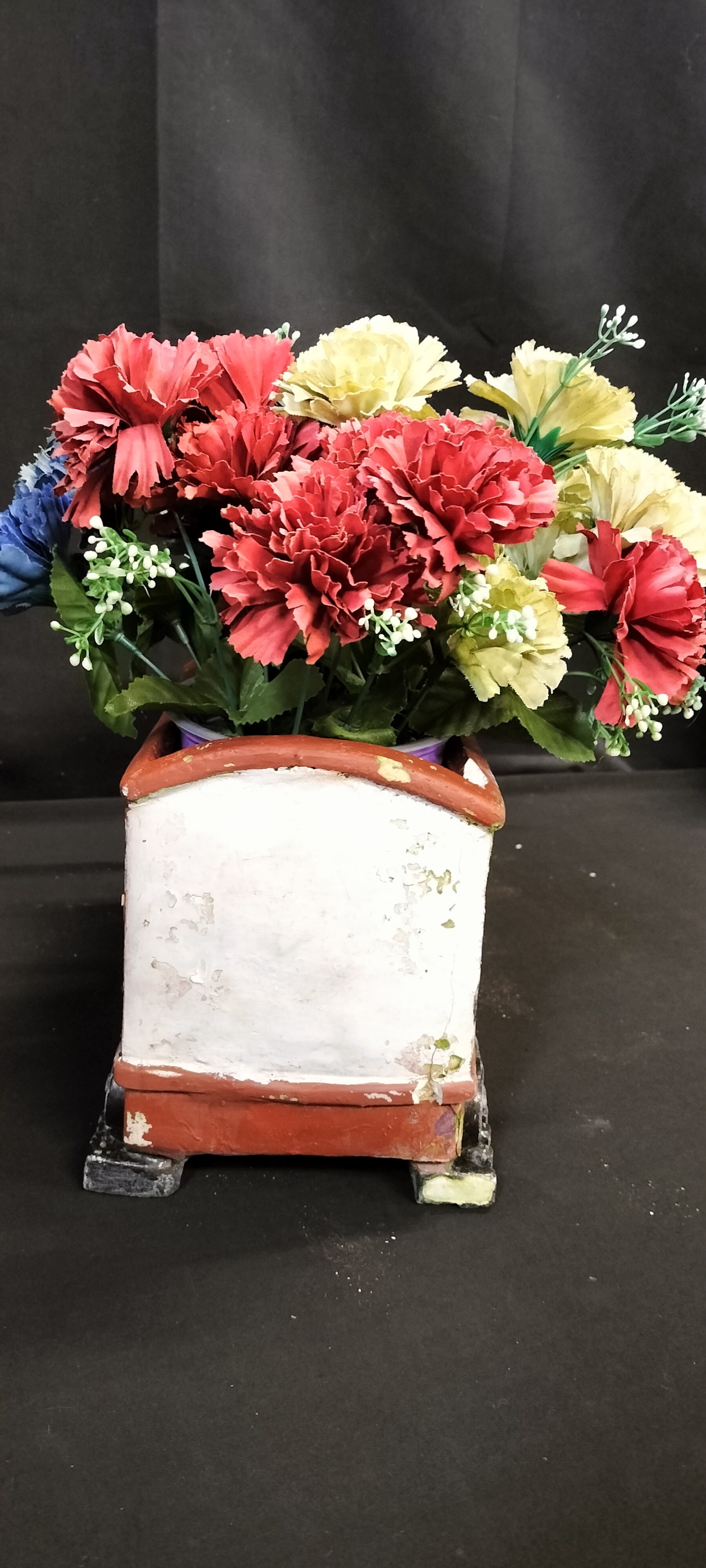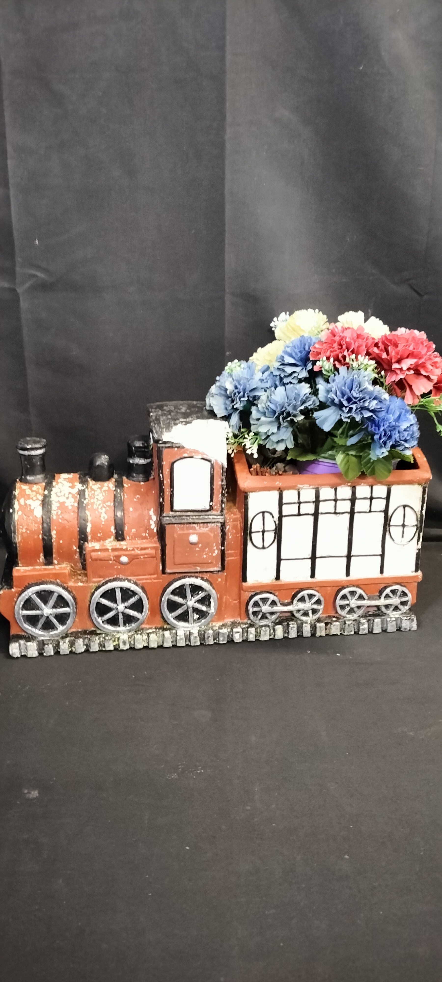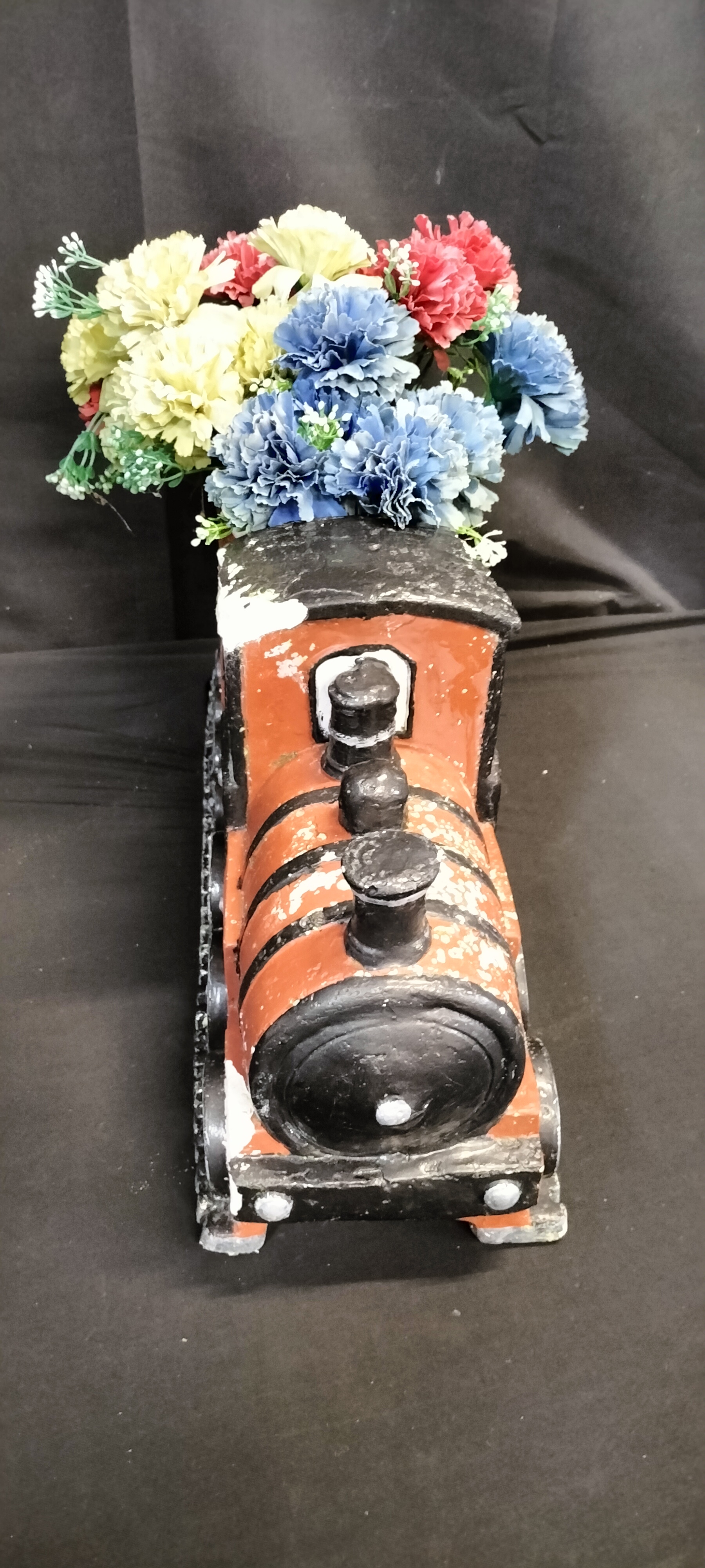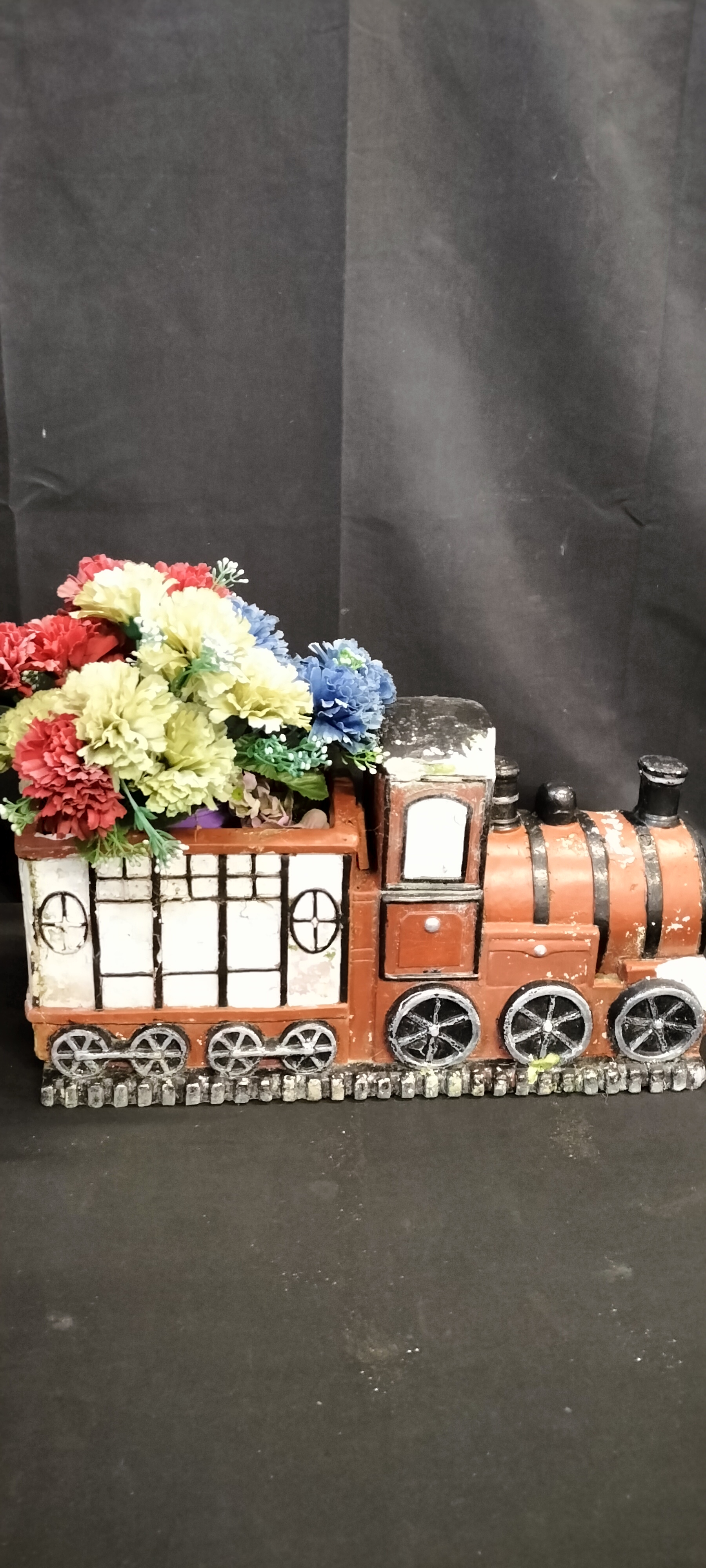 Plaster cast Train planter with faux flowers. Measures approx H 26 x W 47 x D 17 cm. Collection only