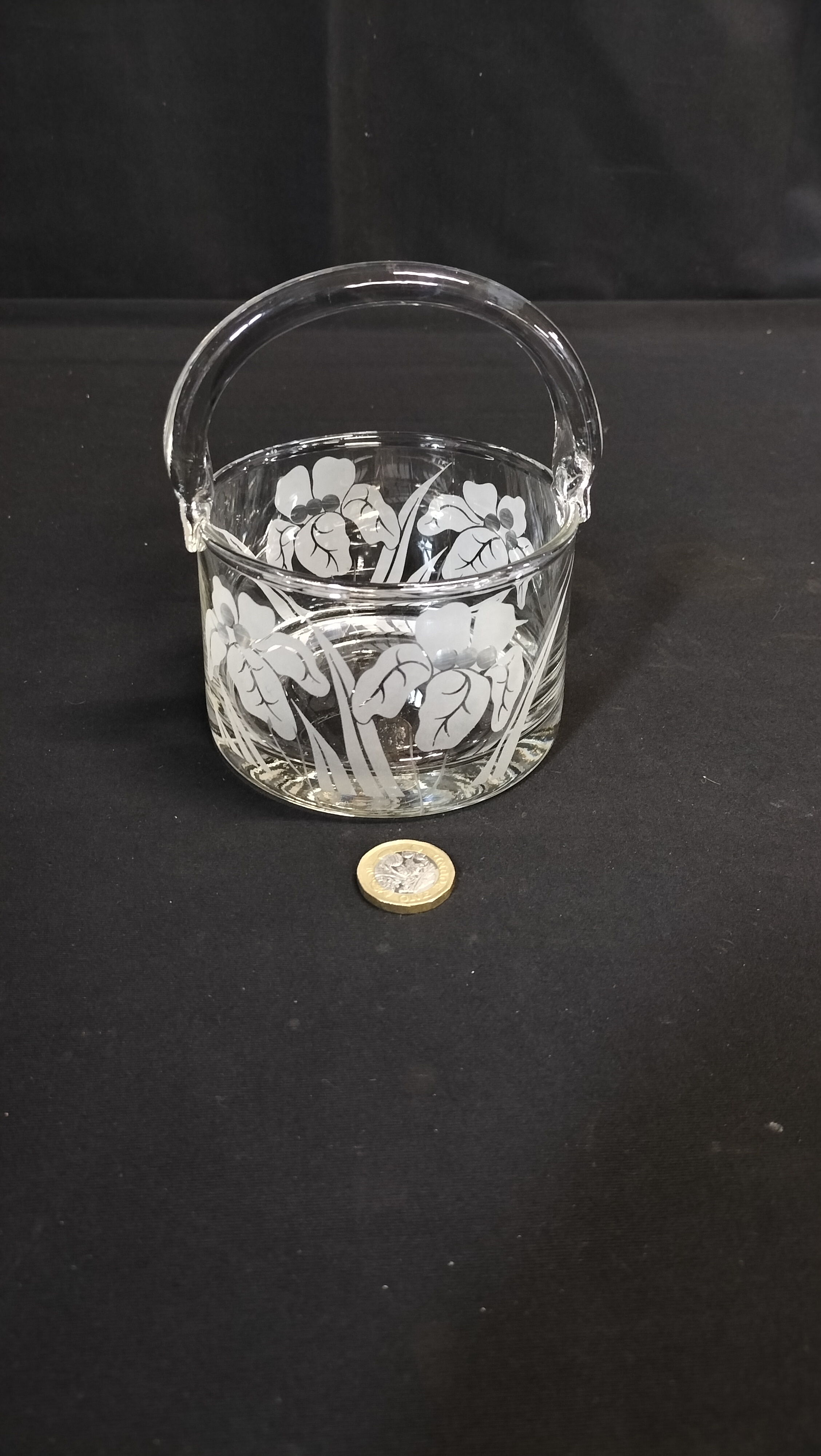 Rayware Glass basket etched with a flower pattern, round with a glass handle