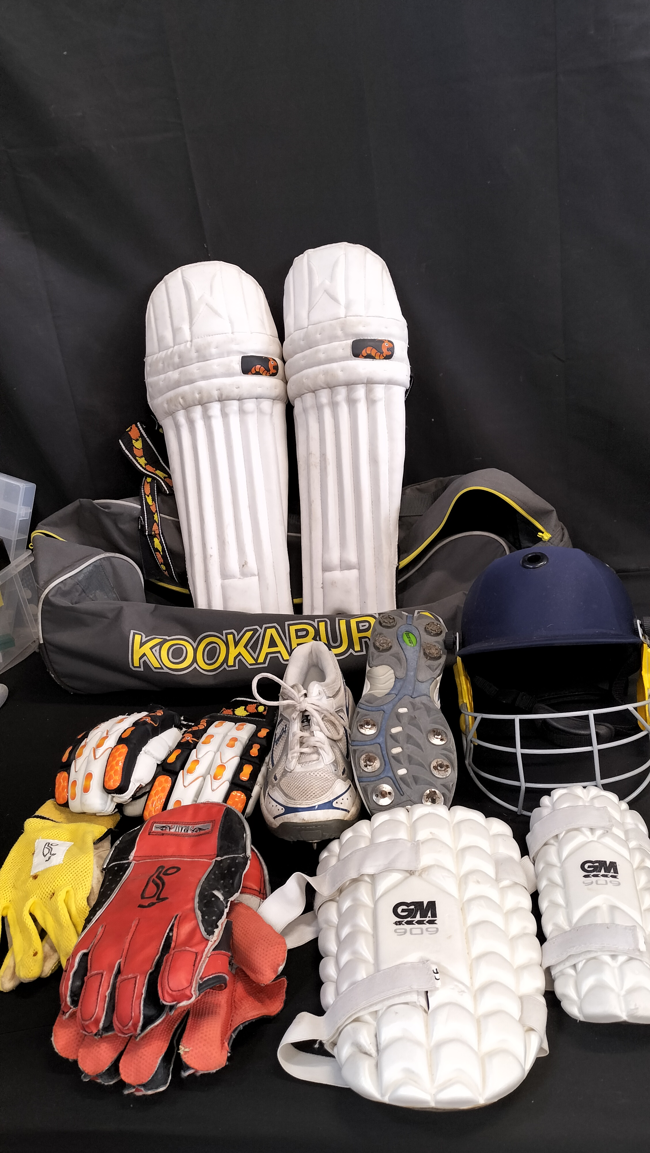 Kookaburra cricket bag containing various cricket equipment including helmet, pads and shoes size UK 9