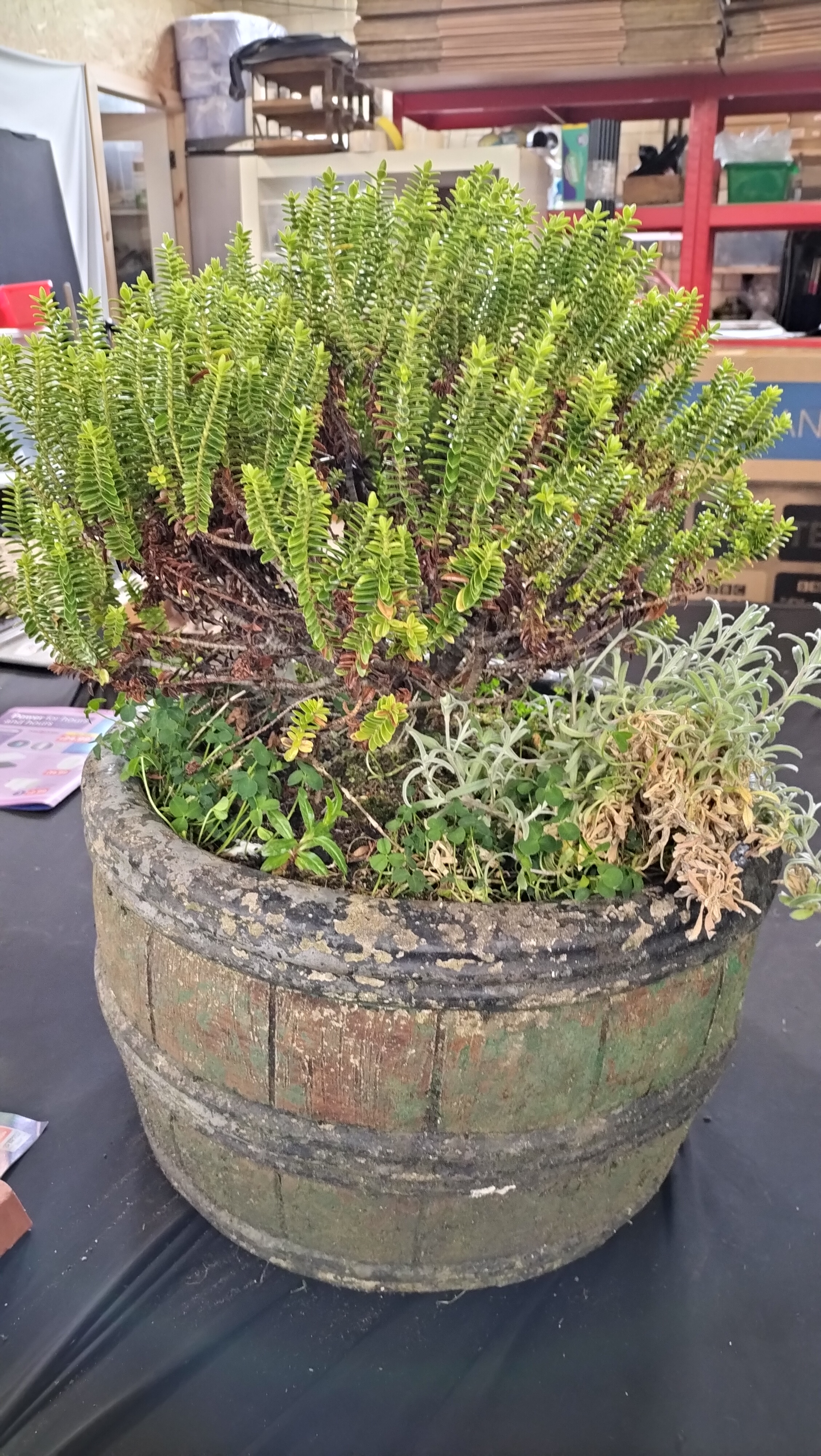 Hebe odora Nana in a concrete half barrel planter. COLLECTION ONLY