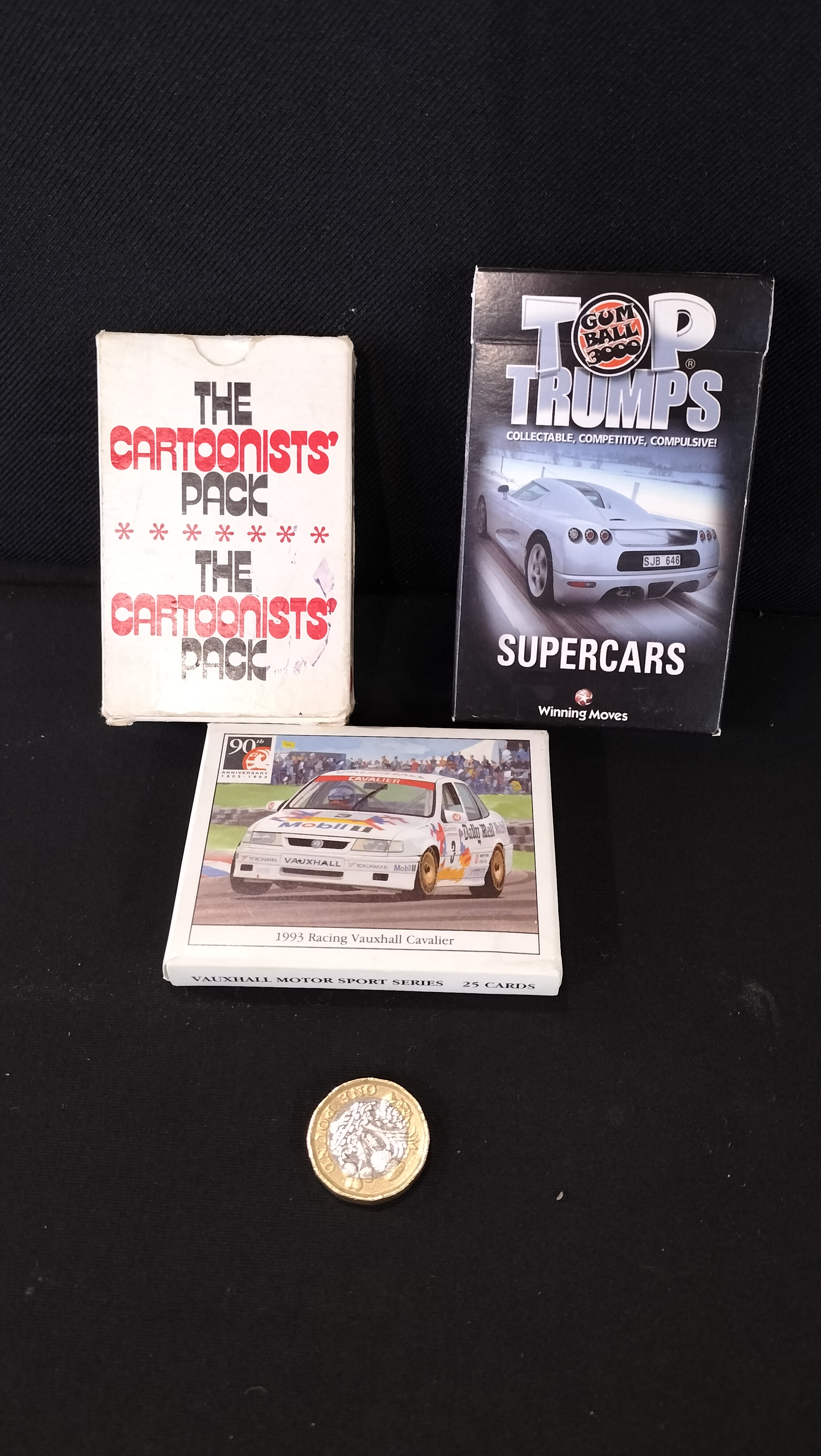 Three decks of Cards including. Tops Trumps Super Cars, The Cartoonists Pack Of Cards and 25 Vauxhall Motor Sport Series cards