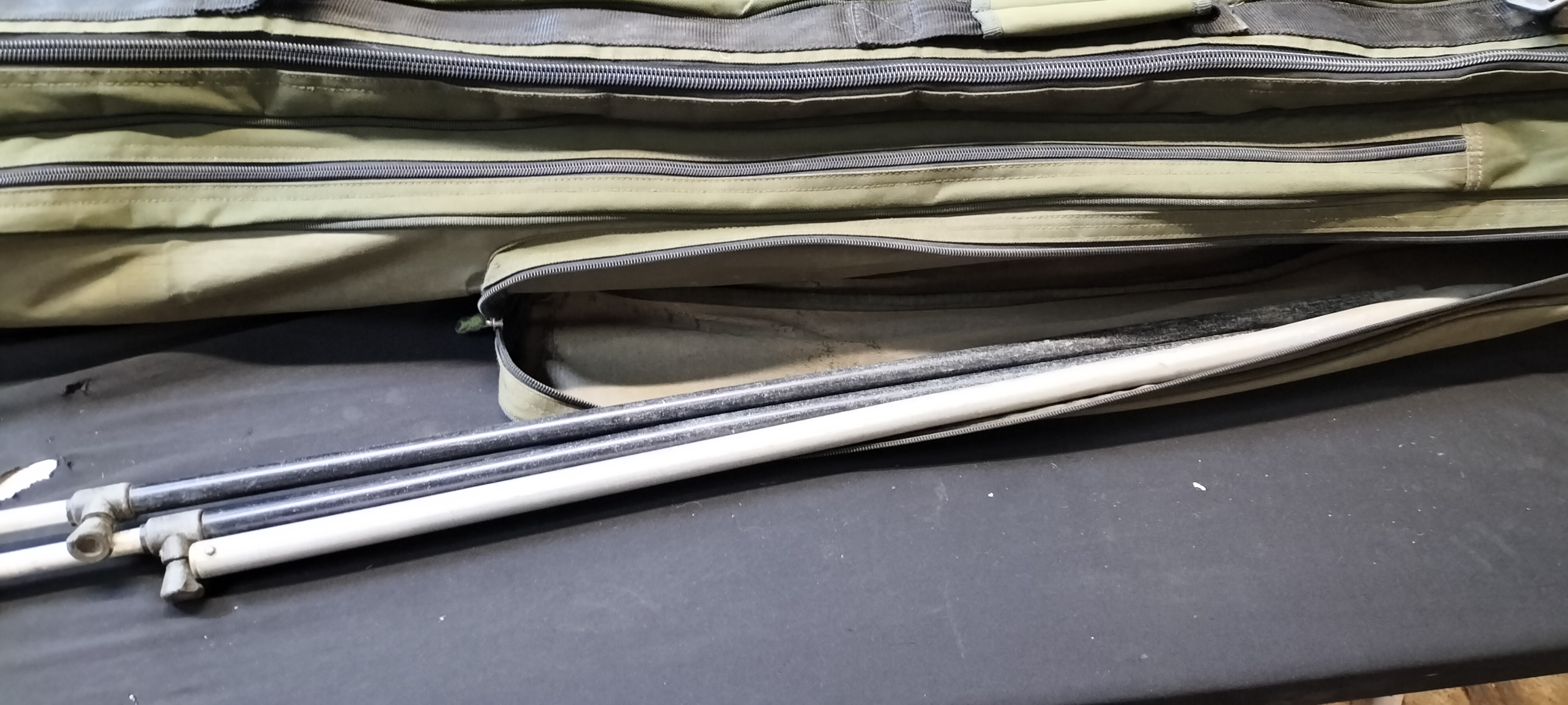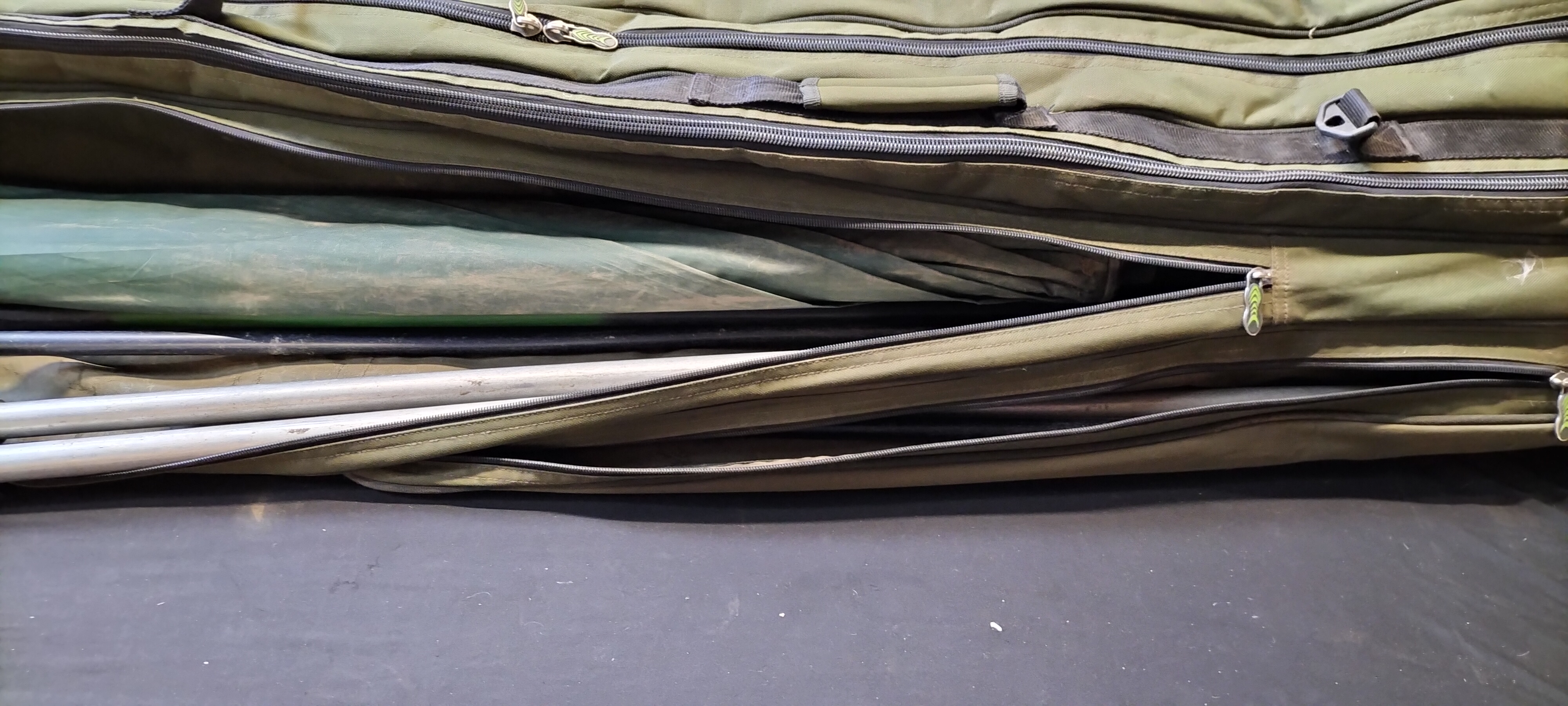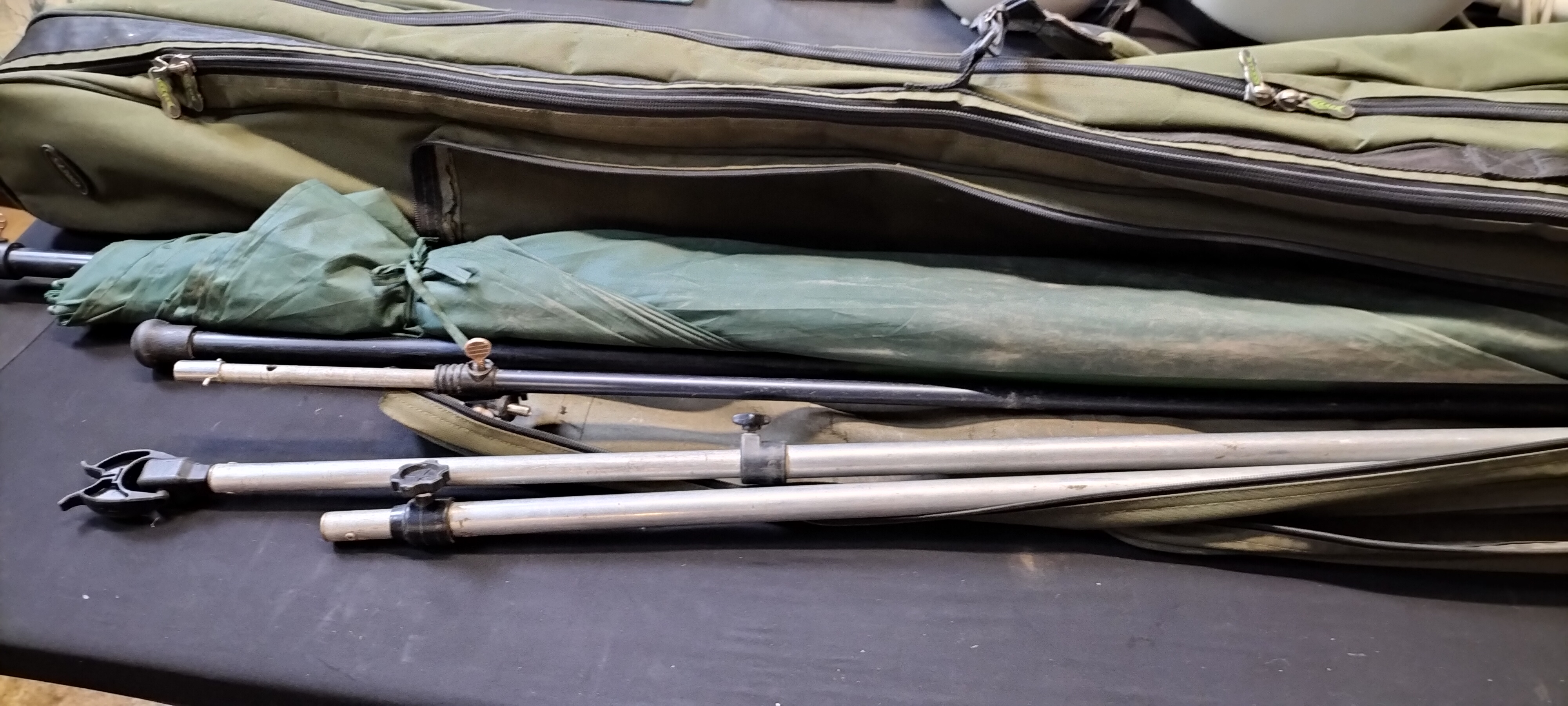 Rods, reels, umbrella, rod rests and extending handle. Bag is approx 190cm tall