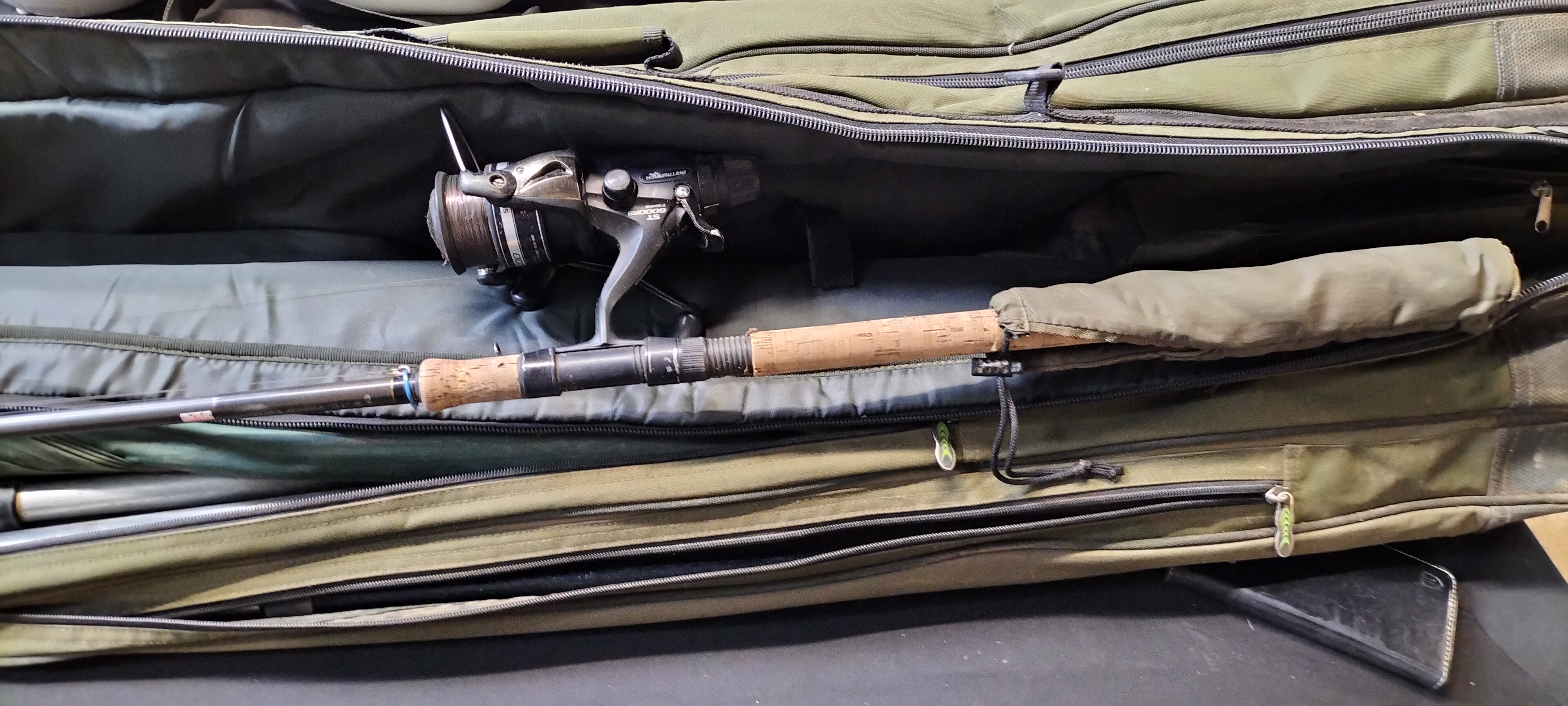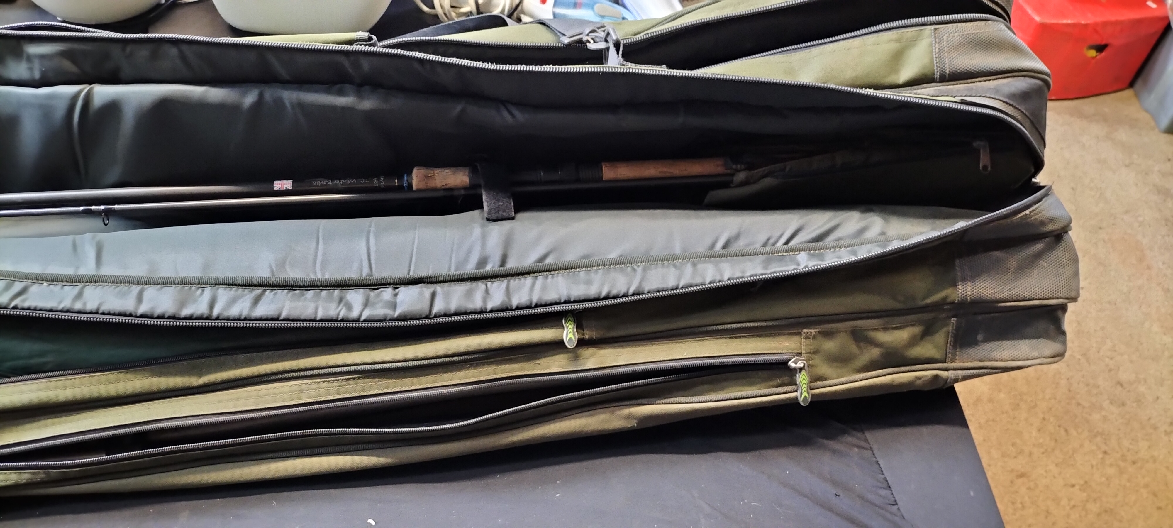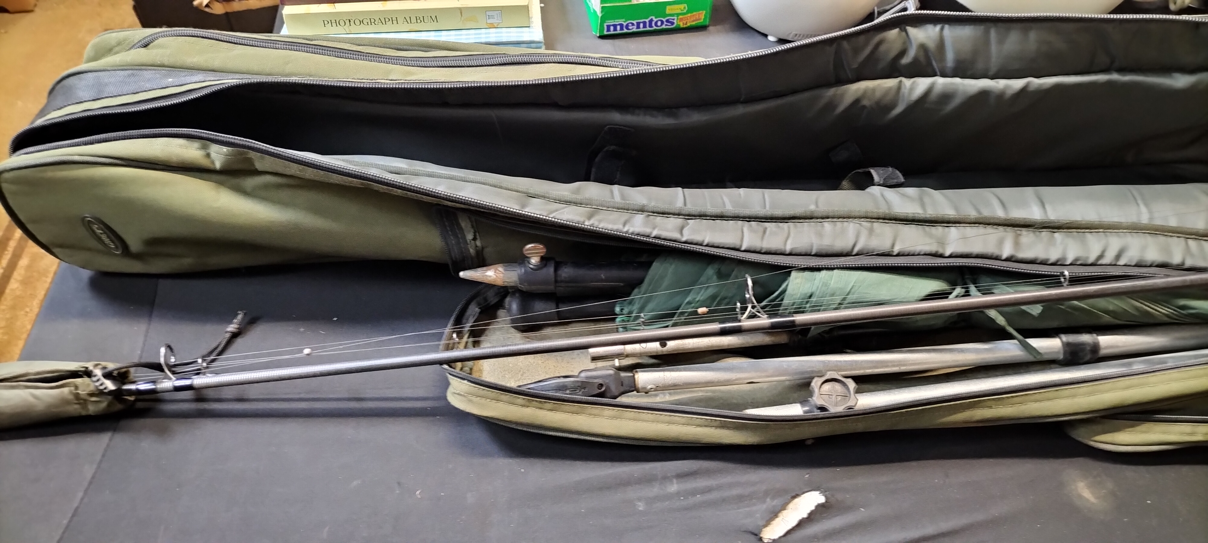 Rods, reels, umbrella, rod rests and extending handle. Bag is approx 190cm tall