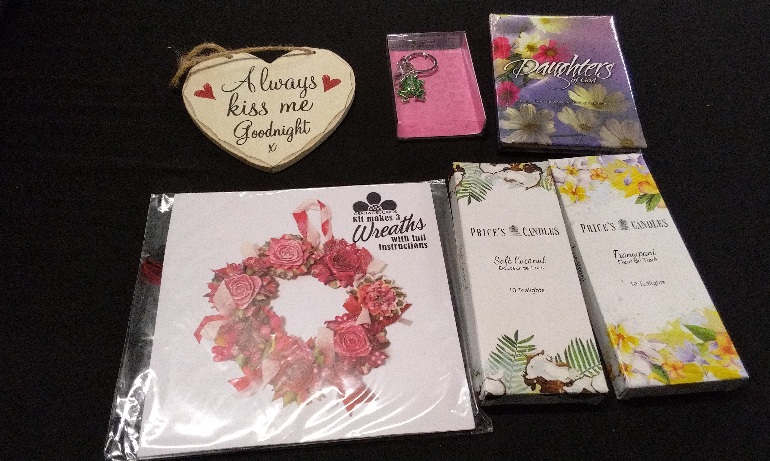 Including Wooden Quote Sign, frog Keyring, Daughters of God The Fragrance of Destiny Book, Wreath Making Kit,2 x Price’s Tea-Light Candles 5x Soft Coconut, full Pack of 10 Fleur De Tiare