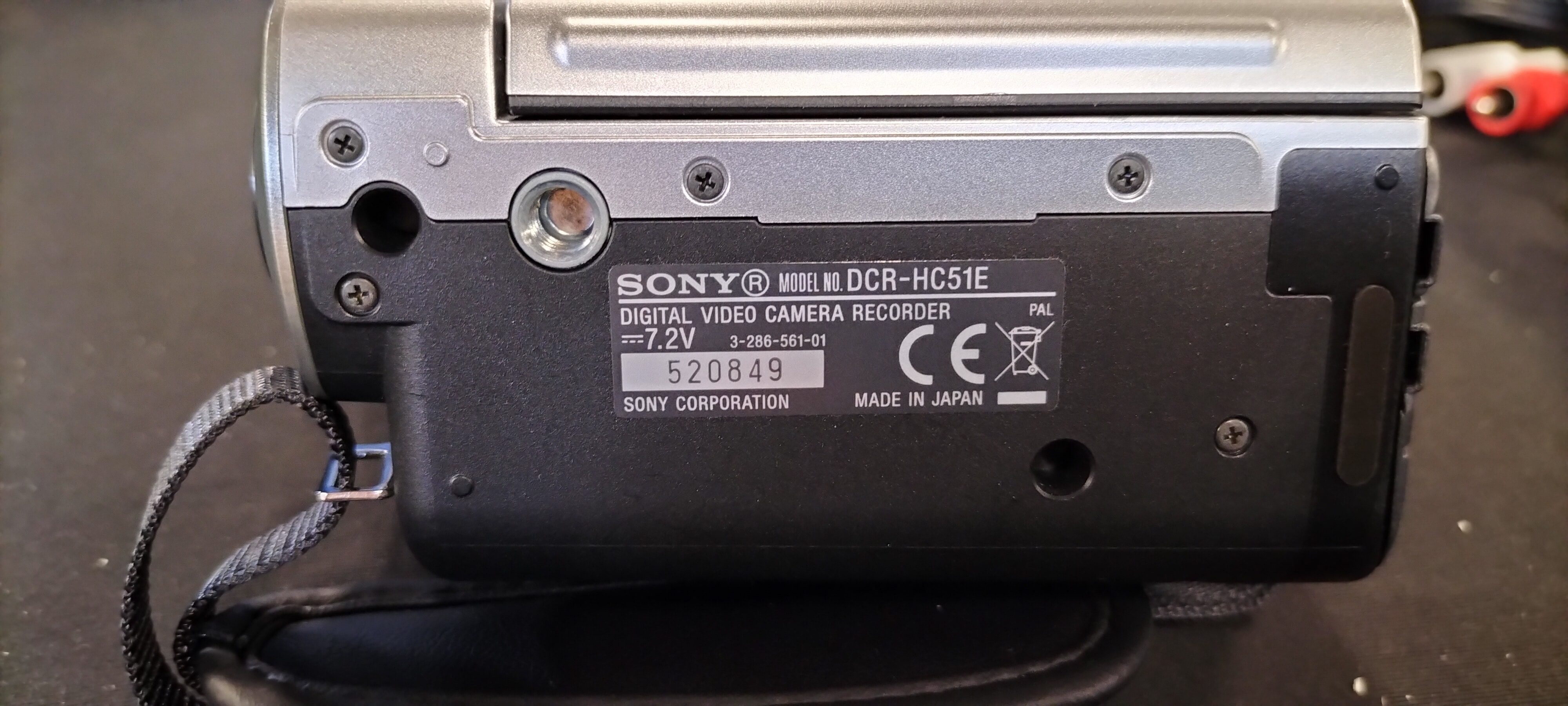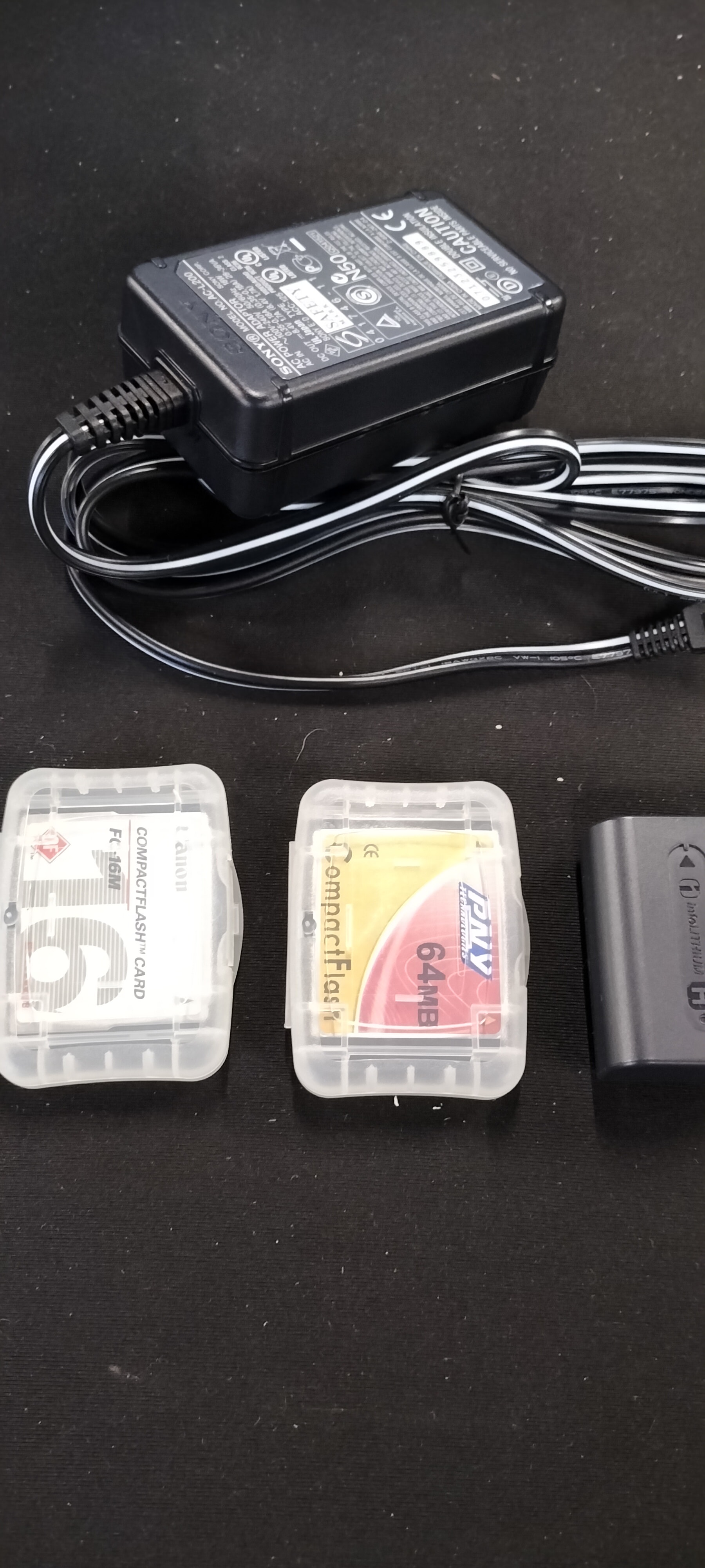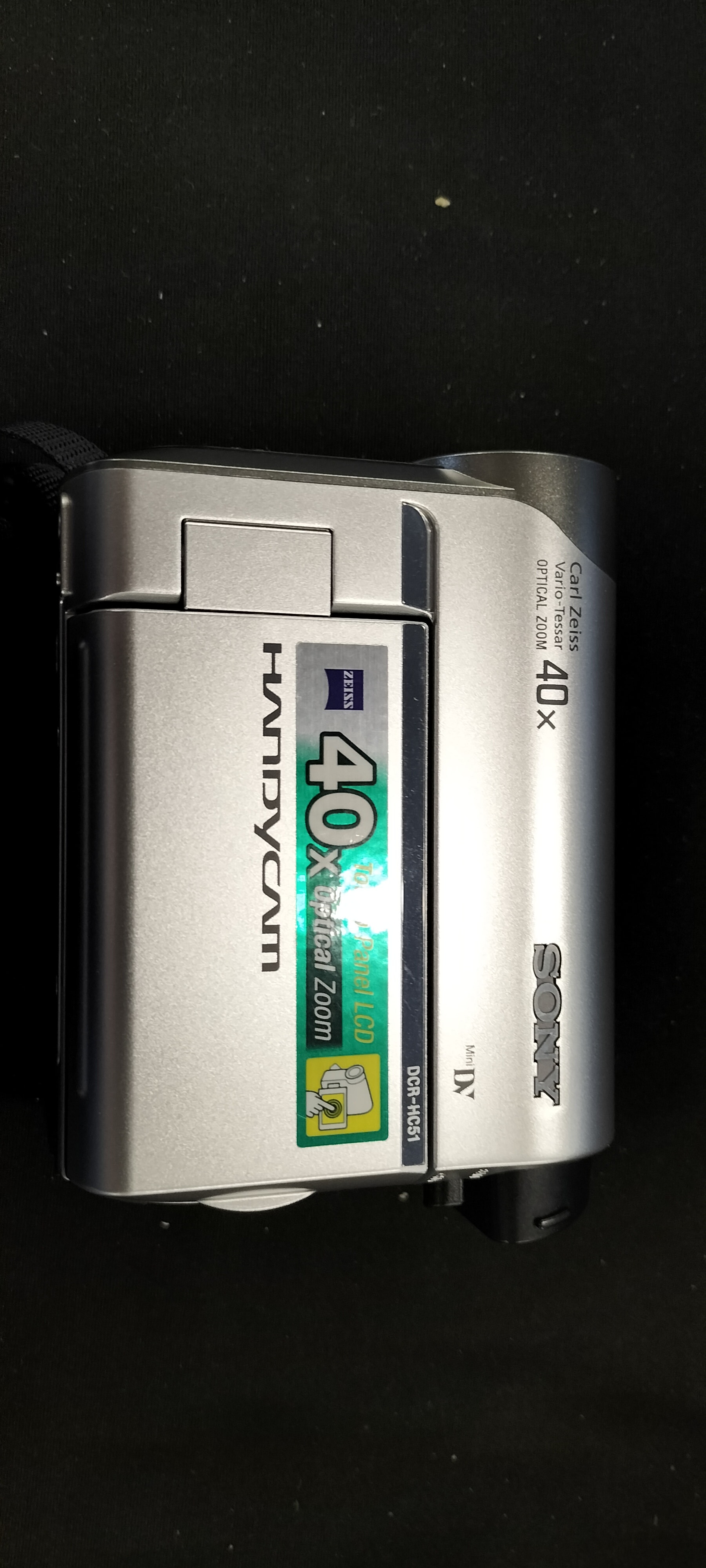 A black and silver Sony DCR-HC51E Handycam Digital Video Camera Recorder with Carl Zeiss Vario-Tessar lens, 40x Optical Zoom, 2000x Digital Zoom, NIGHTSHOT PLUS, assorted cables, Sony AC adapter, two CompactFlash cards, and a Powerbank H device.