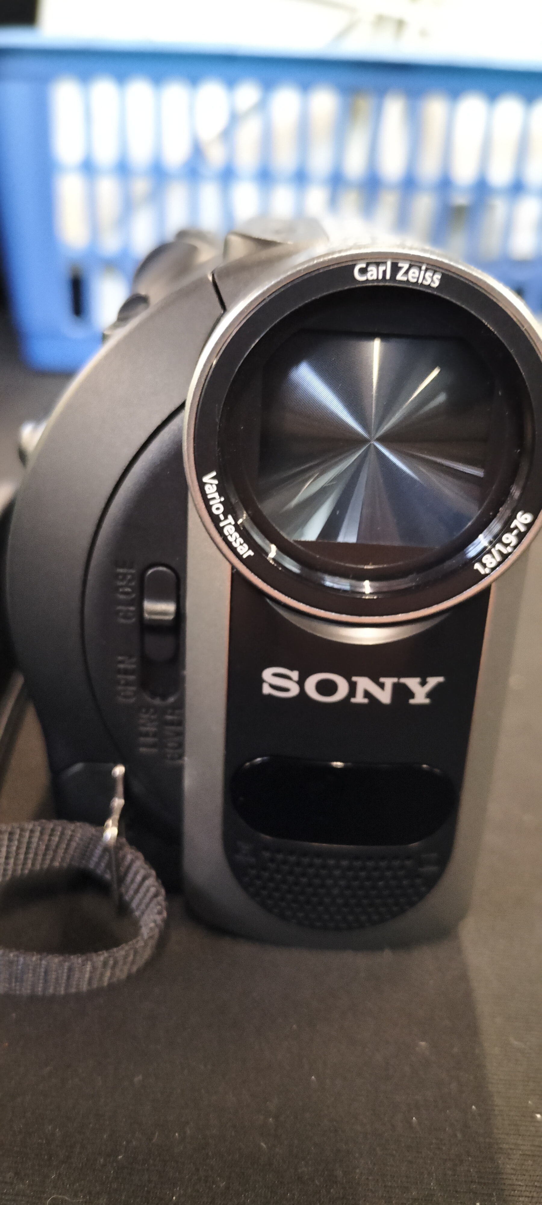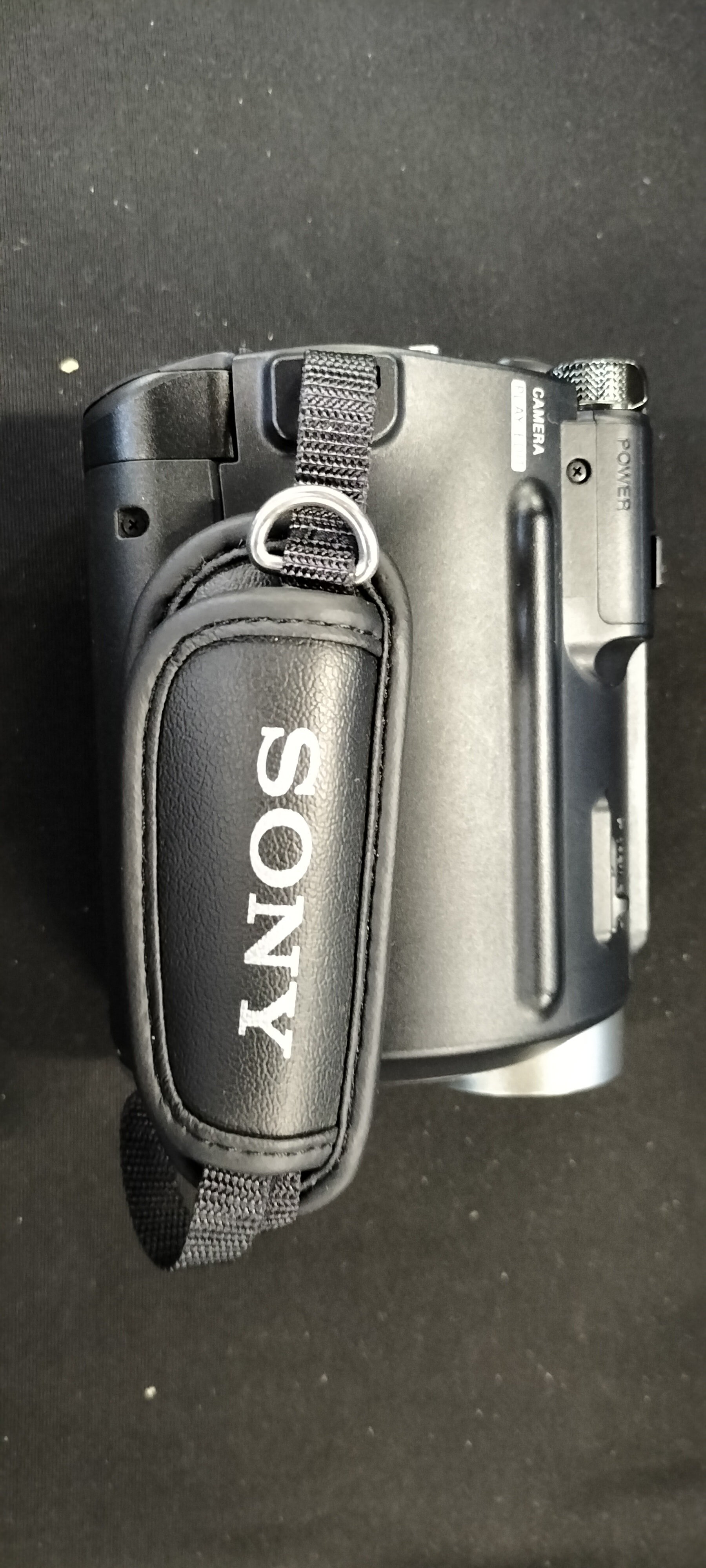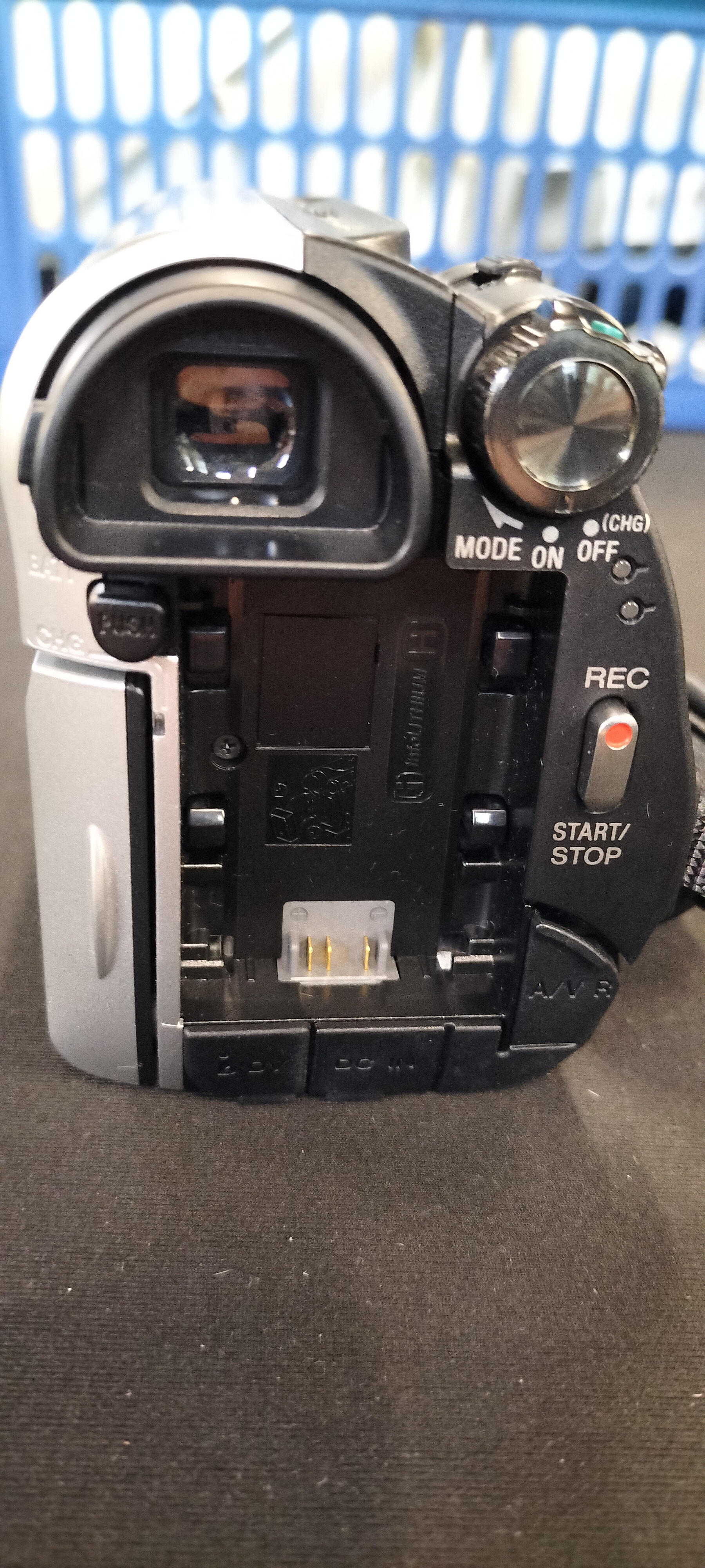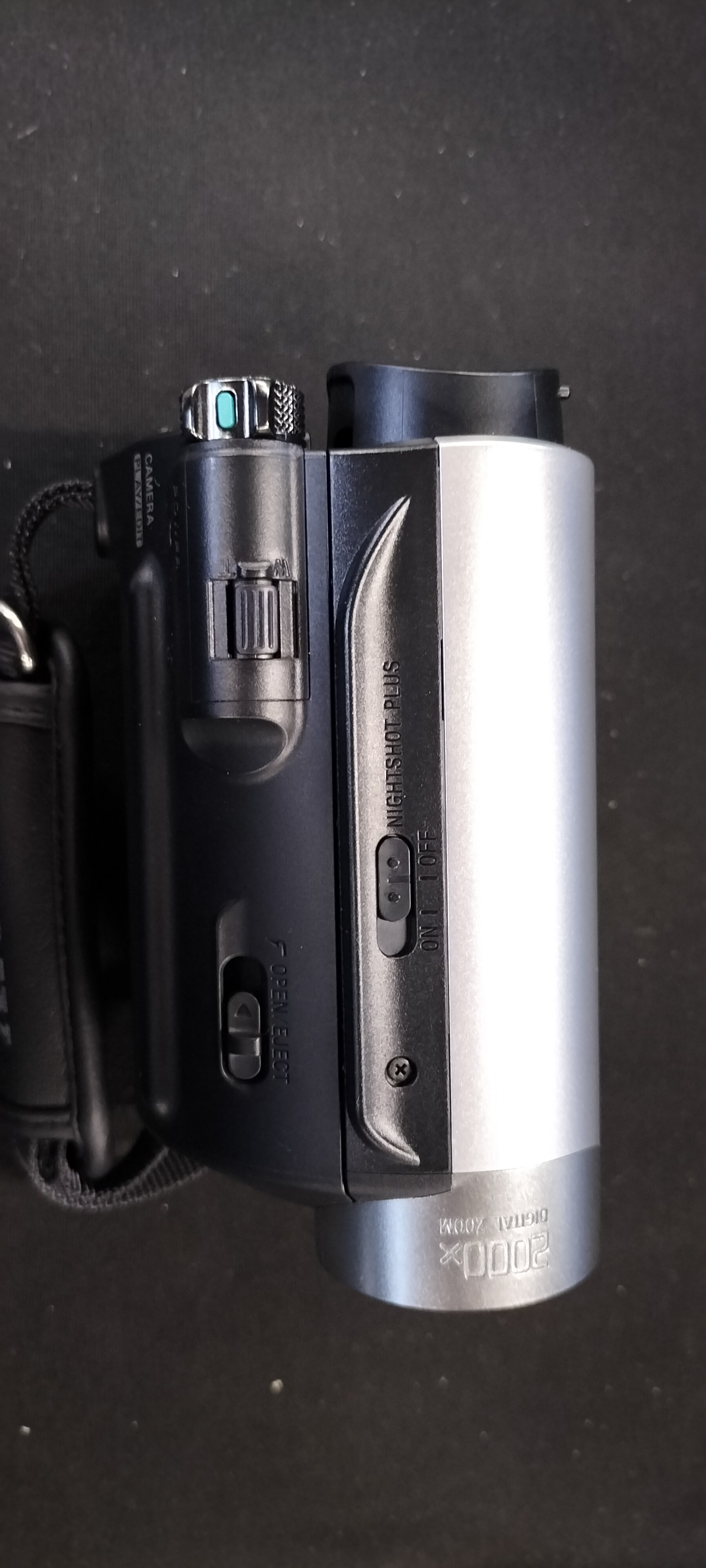 A black and silver Sony DCR-HC51E Handycam Digital Video Camera Recorder with Carl Zeiss Vario-Tessar lens, 40x Optical Zoom, 2000x Digital Zoom, NIGHTSHOT PLUS, assorted cables, Sony AC adapter, two CompactFlash cards, and a Powerbank H device.