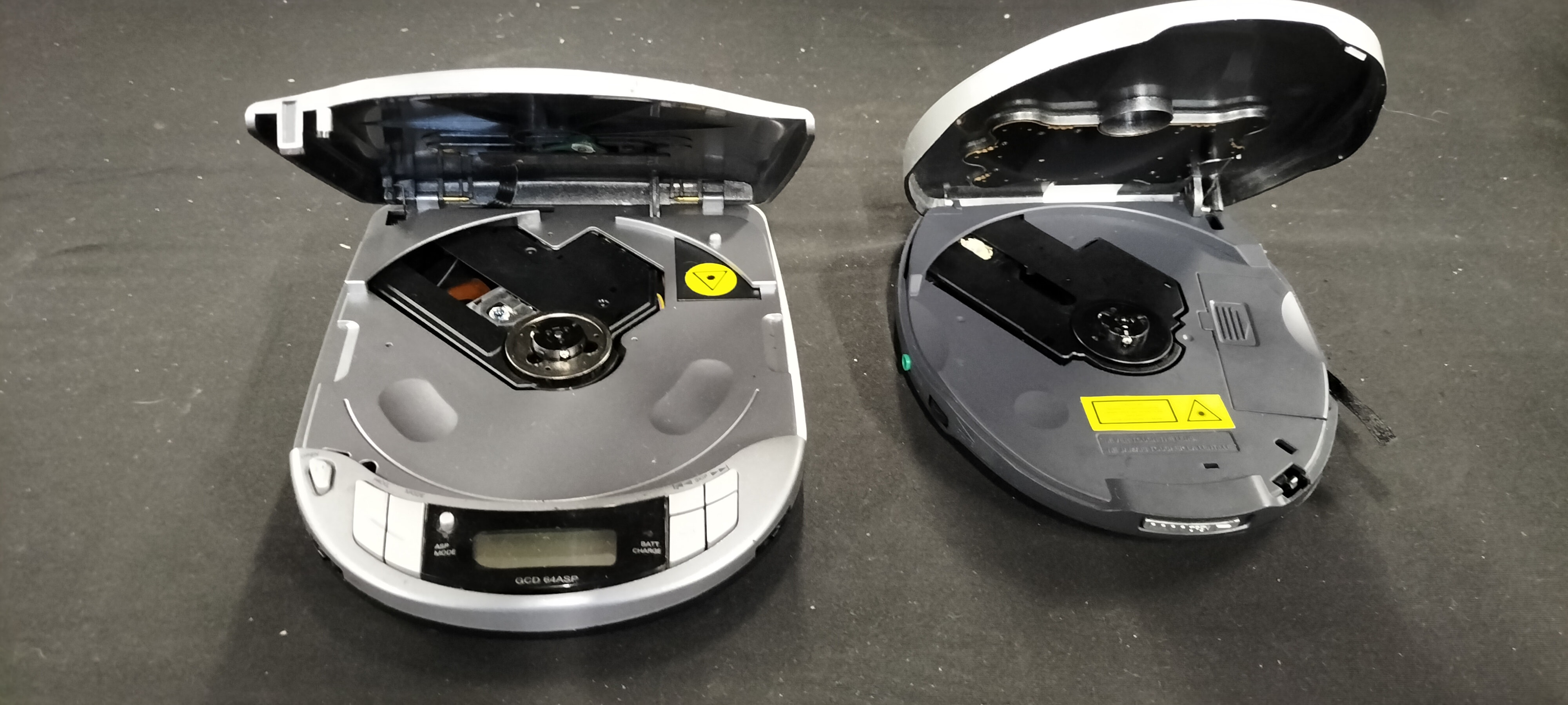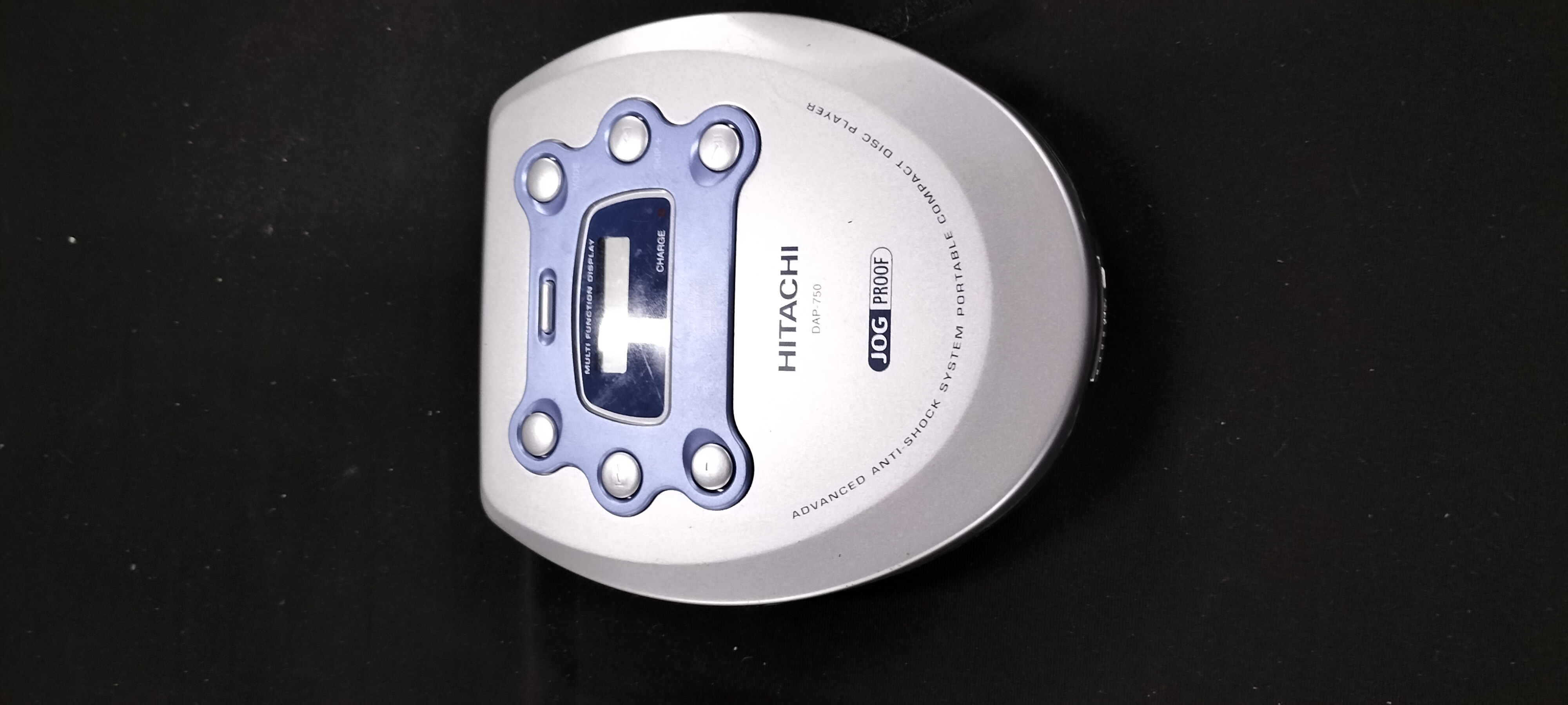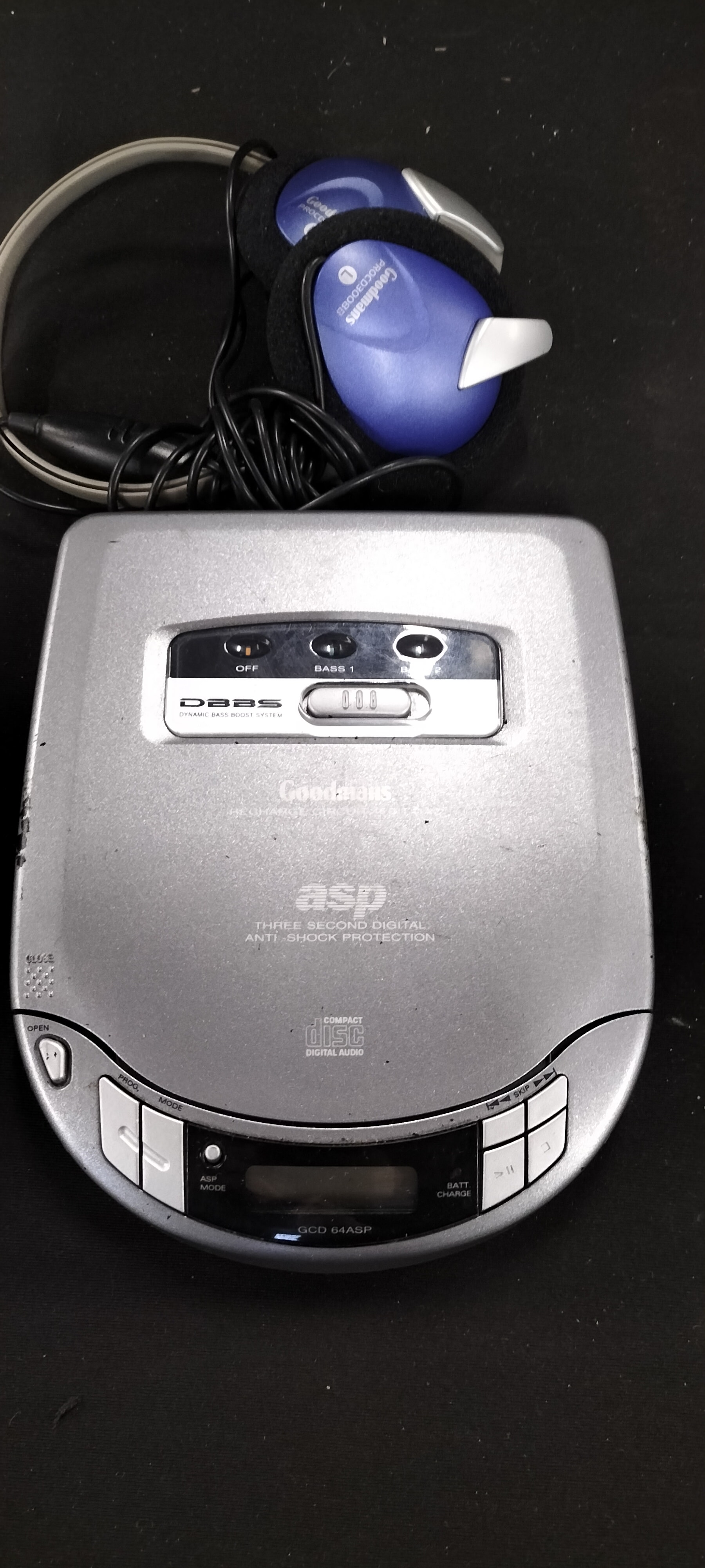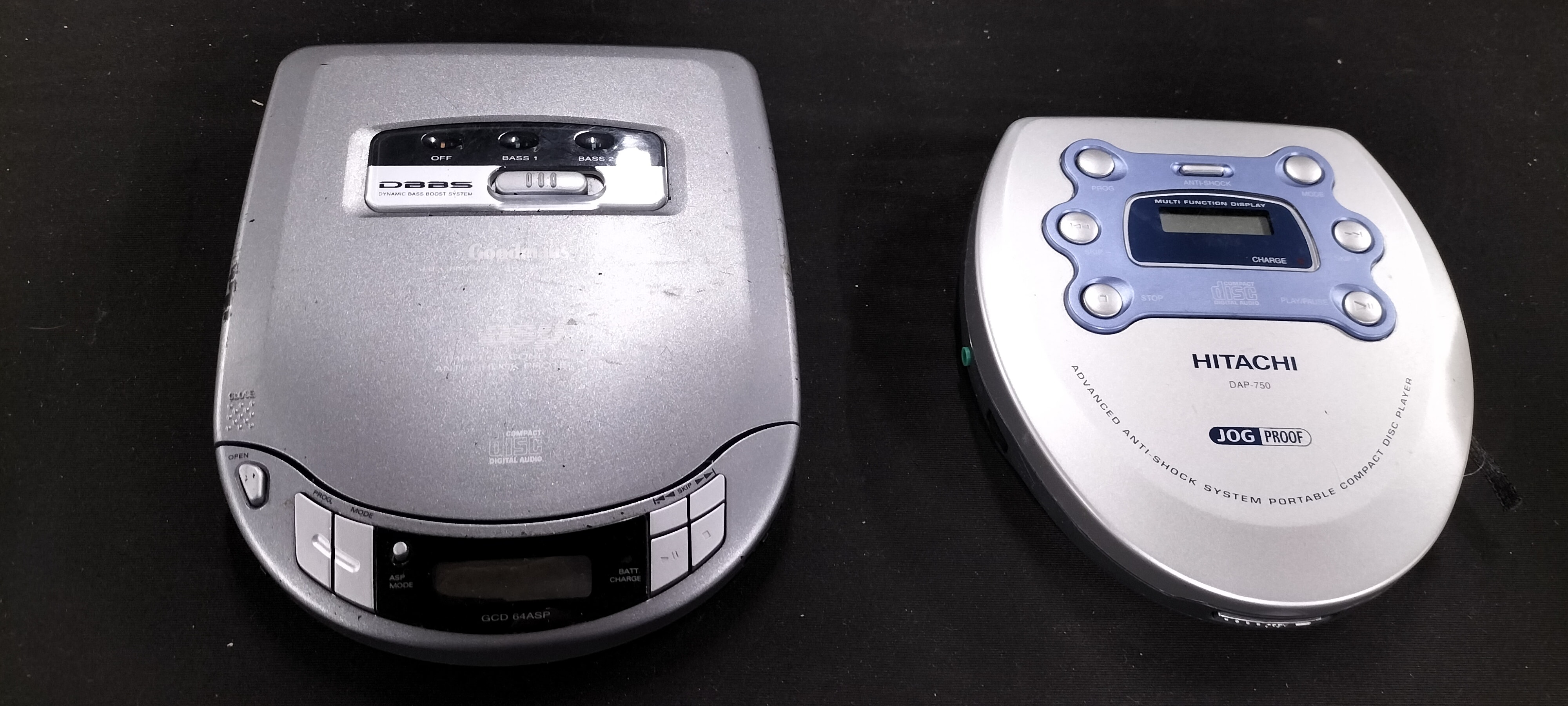 Two silver/grey portable CD players, a Goodmans GCD 64ASP with DBBS and anti-shock, and a Hitachi DAP-750 with blue accents, multi-function display, charge, and advanced anti-shock system.