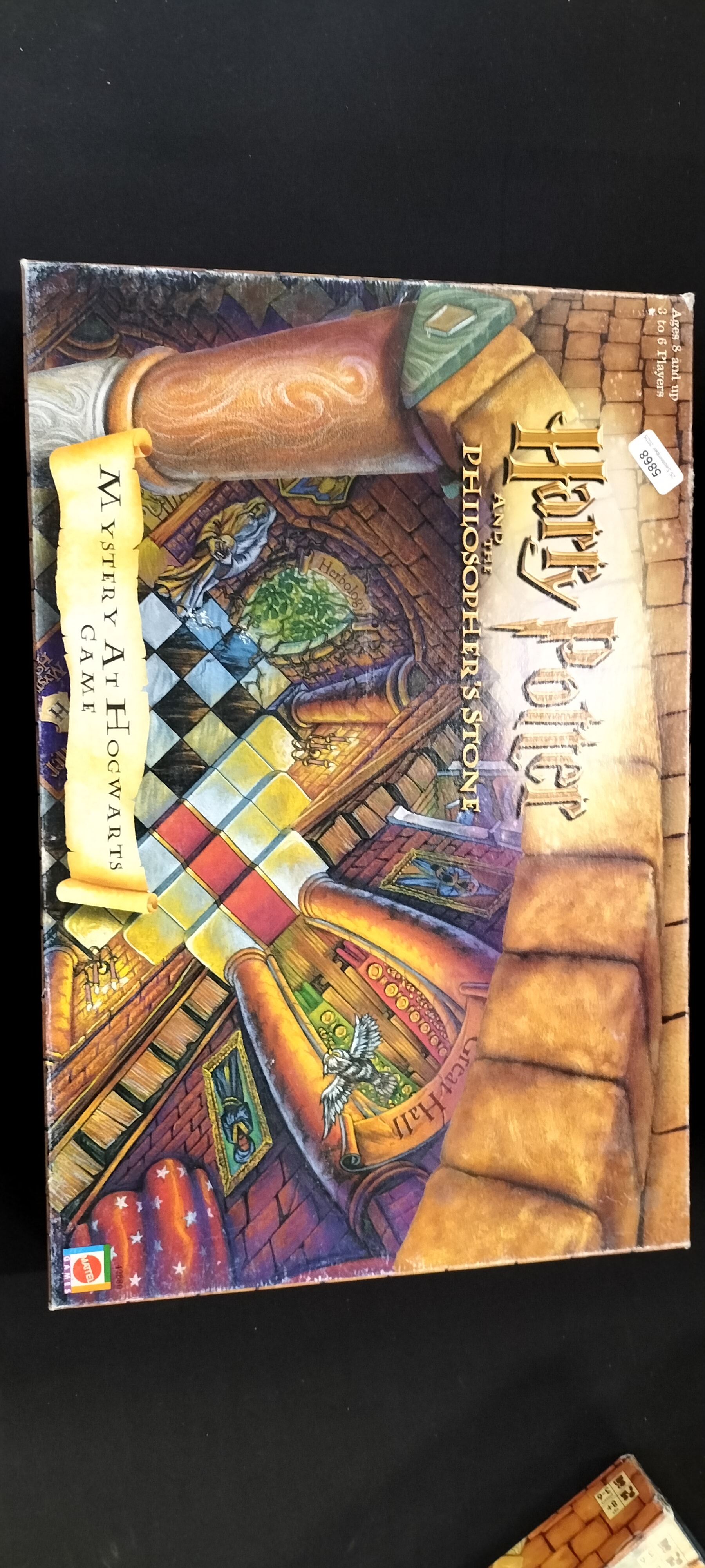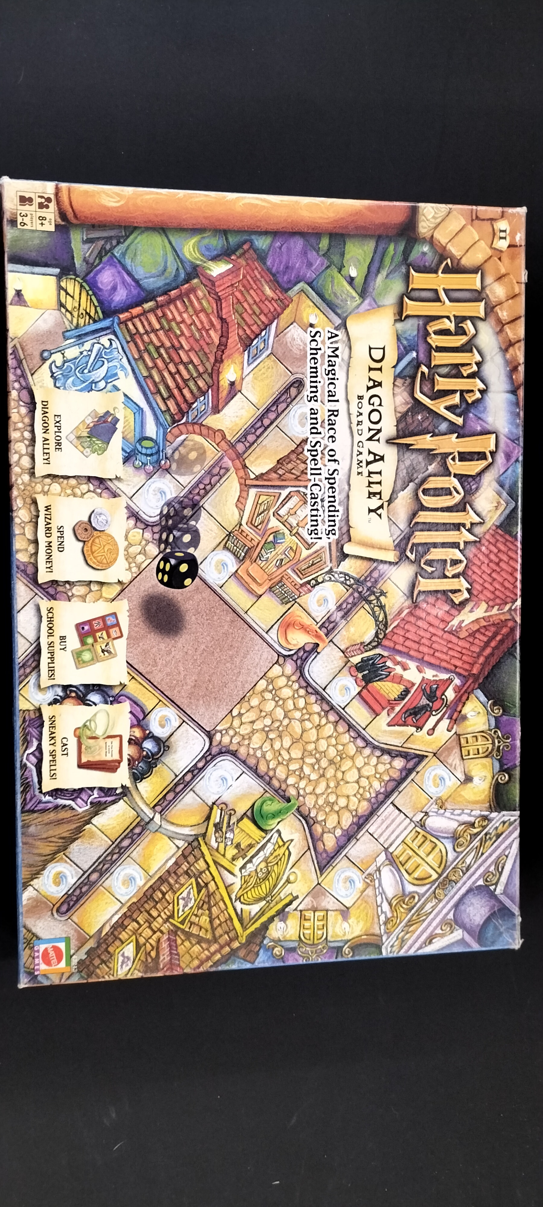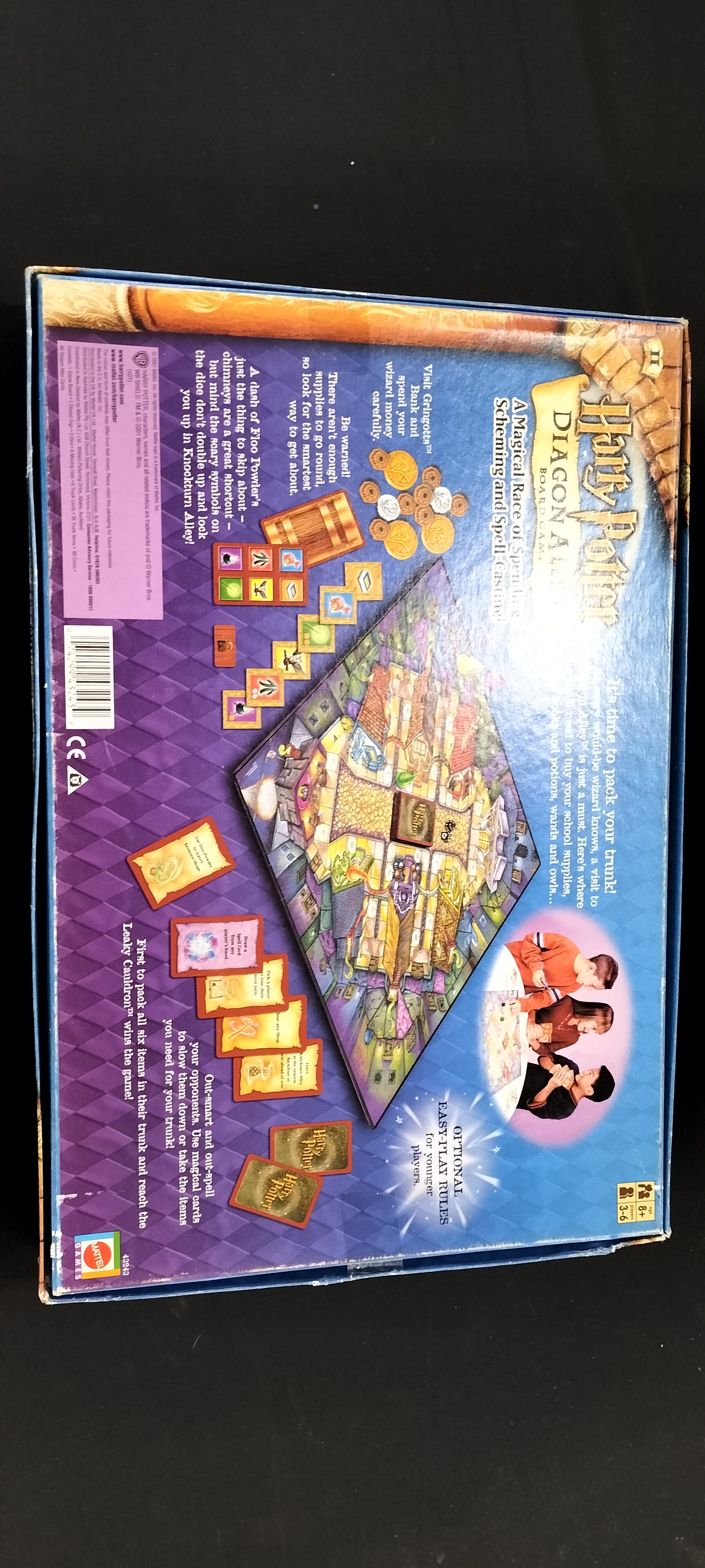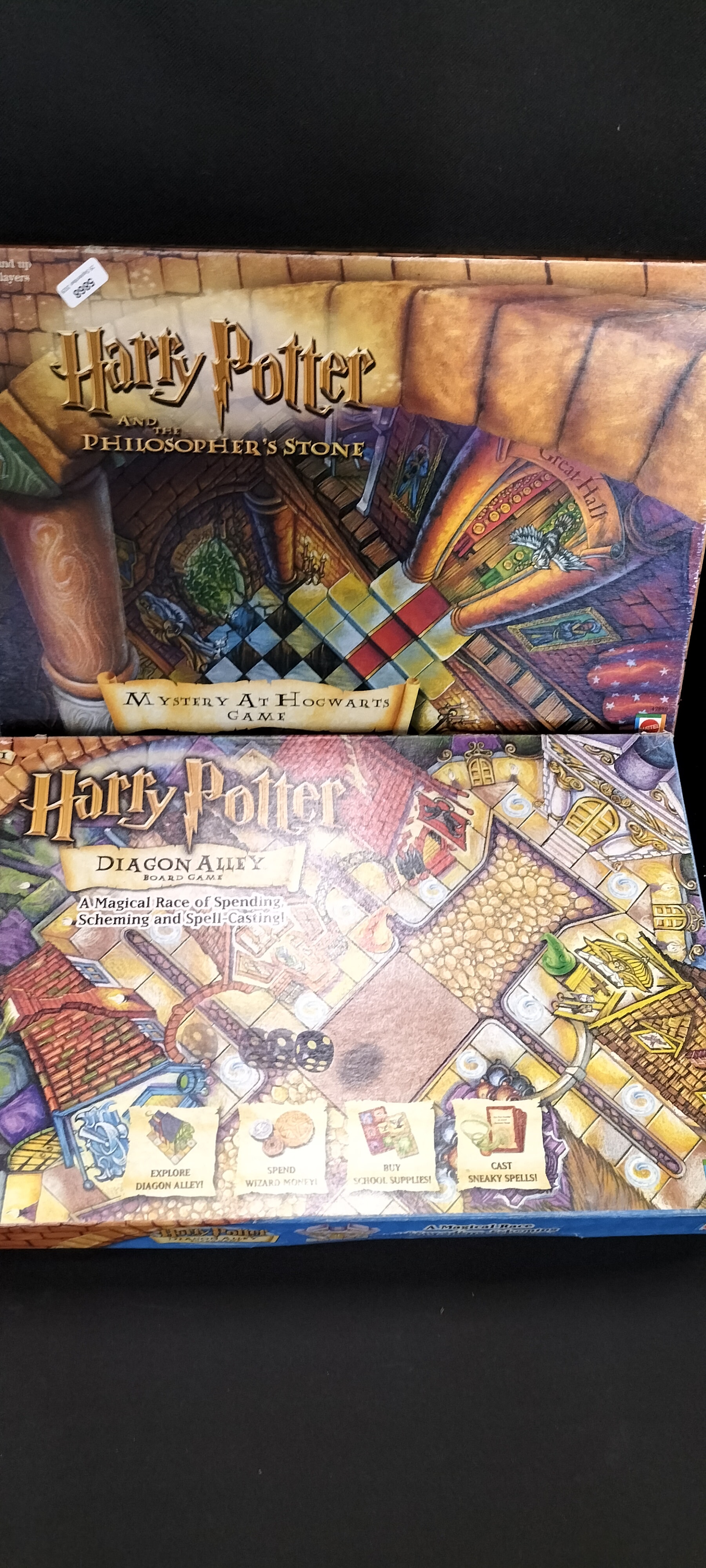 A pair of multi-colored Harry Potter board games, including ‘Mystery at Hogwarts’ and ‘Diagon Alley’, both by Mattel and suitable for ages 8 and up.