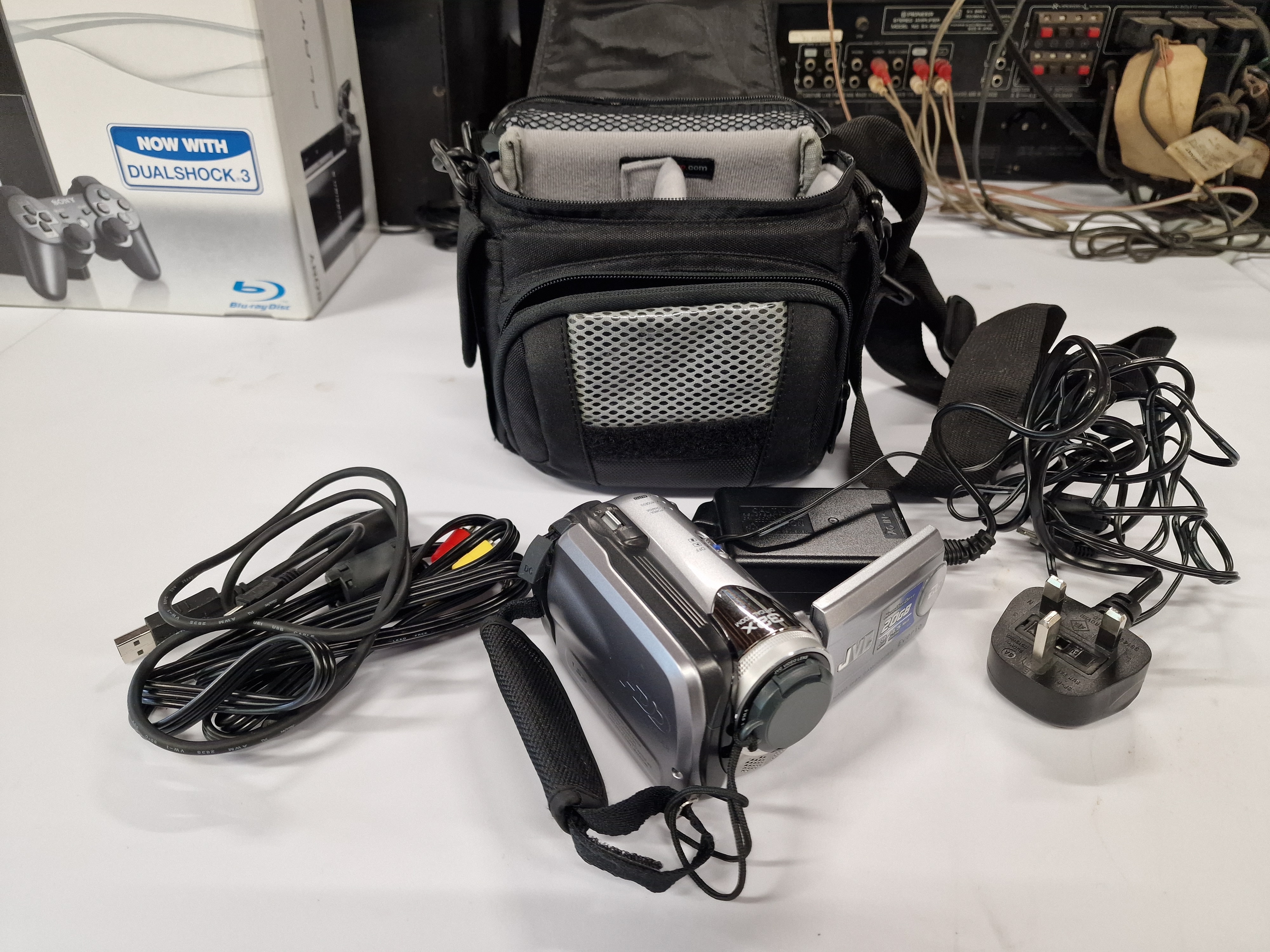 A silver and black JVC Everio Hard Disk Camcorder with 32x OPTICAL ZOOM, 20GB storage, and HD capability, accompanied by a black camera bag, black cables, and a JVC AC Power Adapter (MODEL NO. AP-V17E).