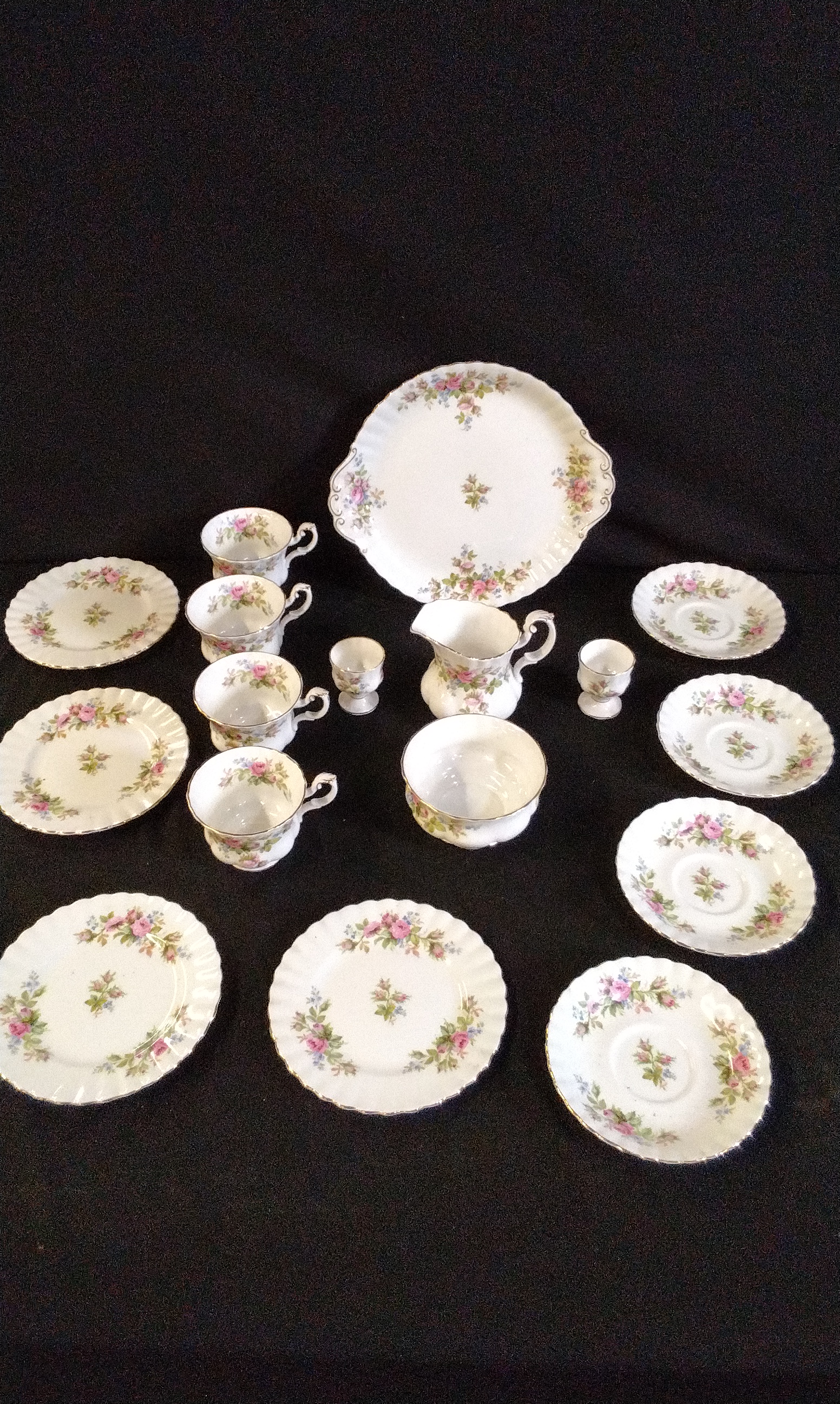 Comprising of, 4 Teacups, Saucers, Side Plates, Milk Jug, Sugar Bowl, Sandwich Plate, and 2x Egg Cups