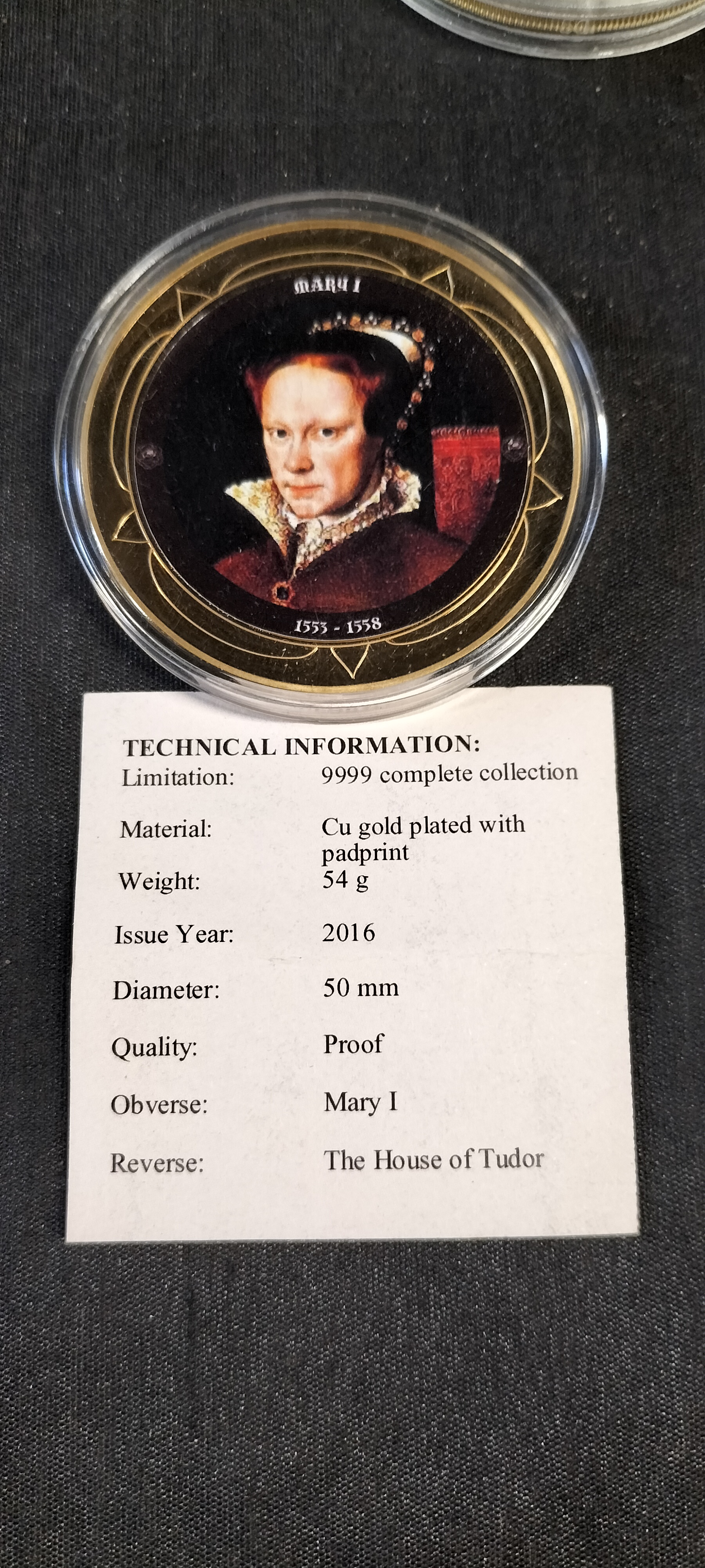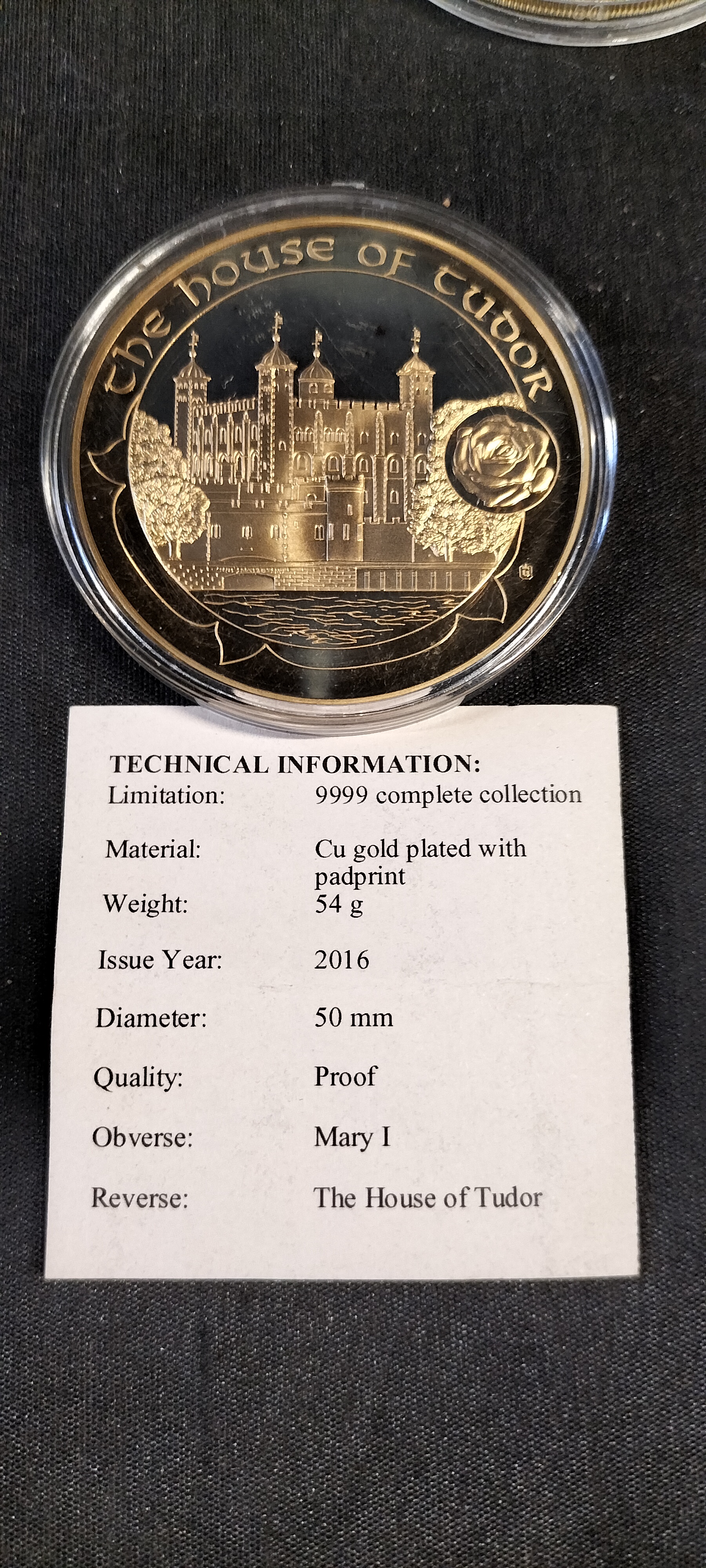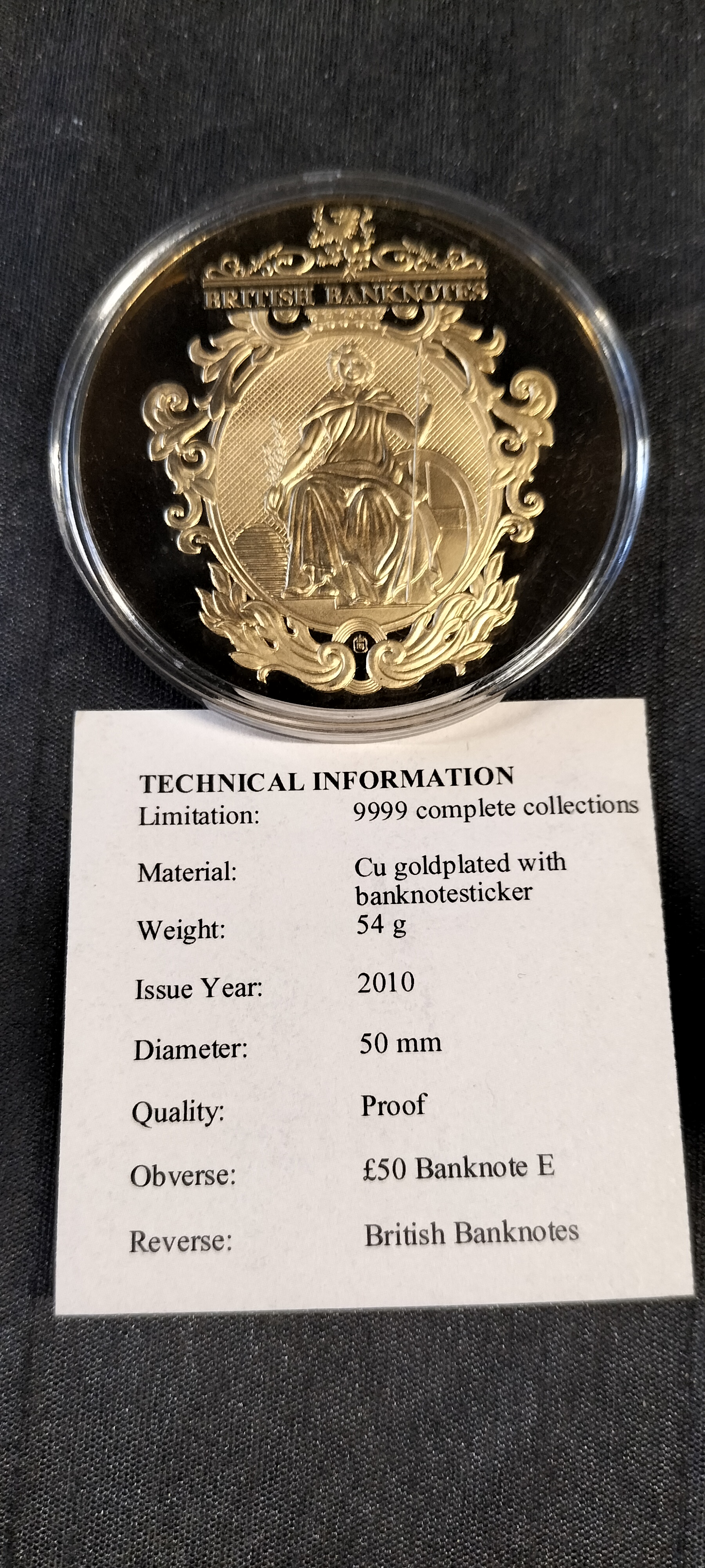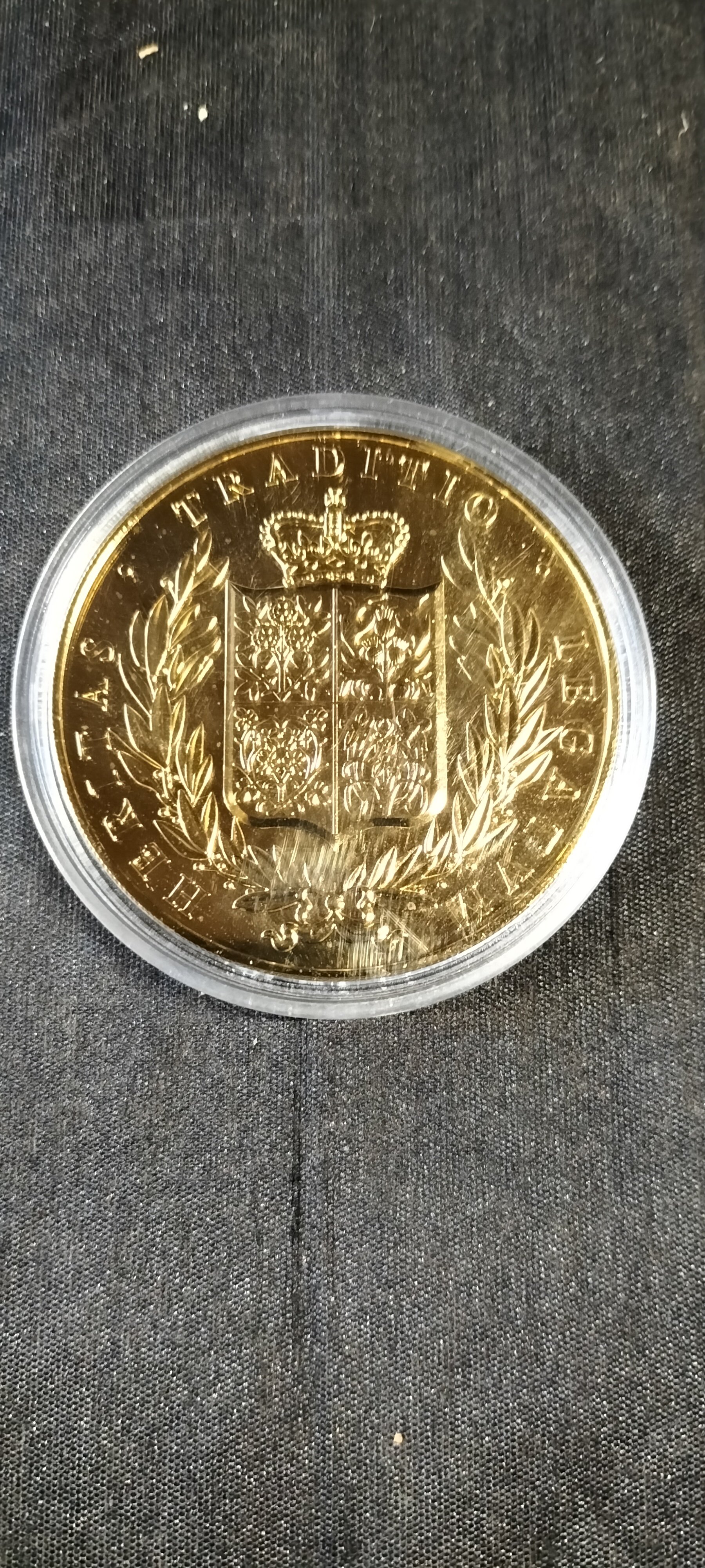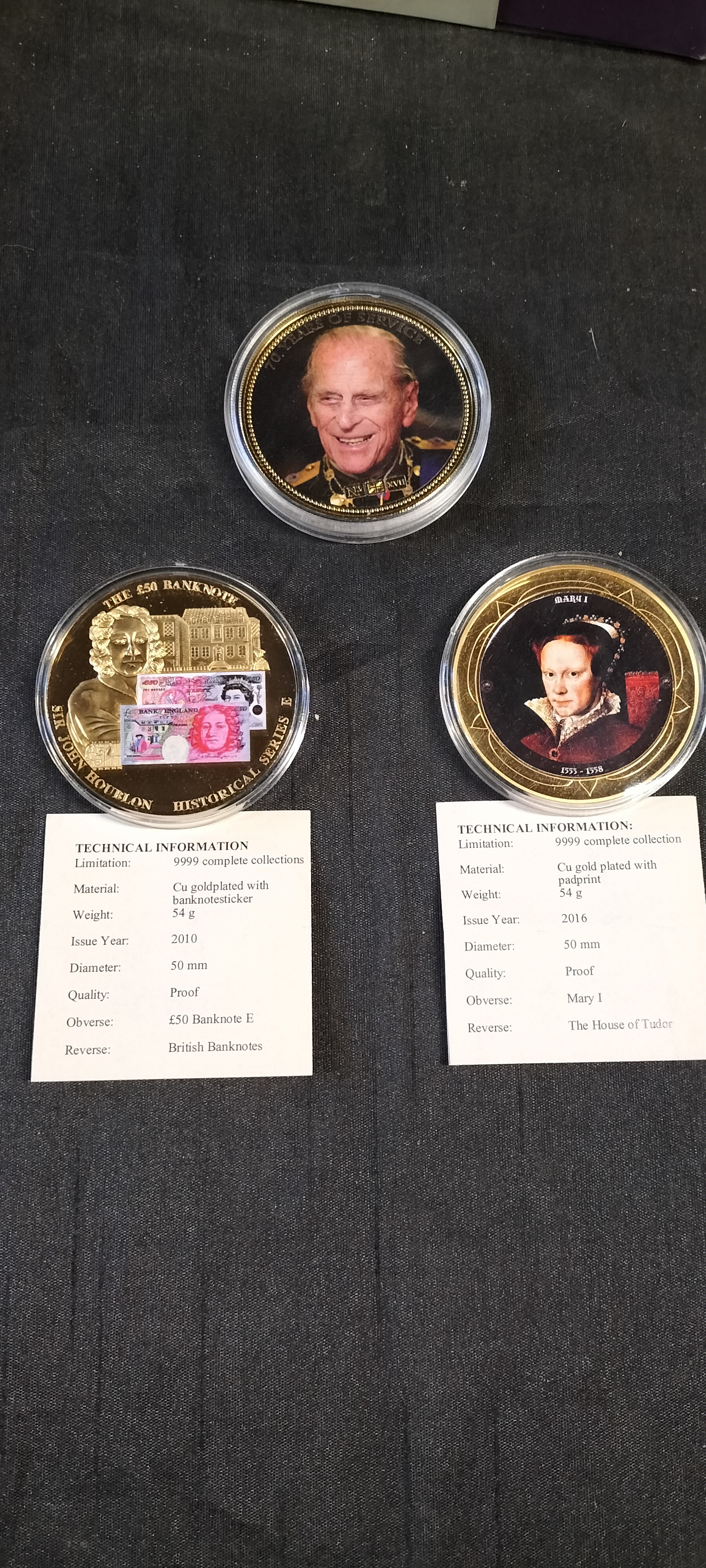 Three Large (5cm) Gold Plated Commemorative Coins in Plastic Capsules. Two with Certificate of Authenticity
