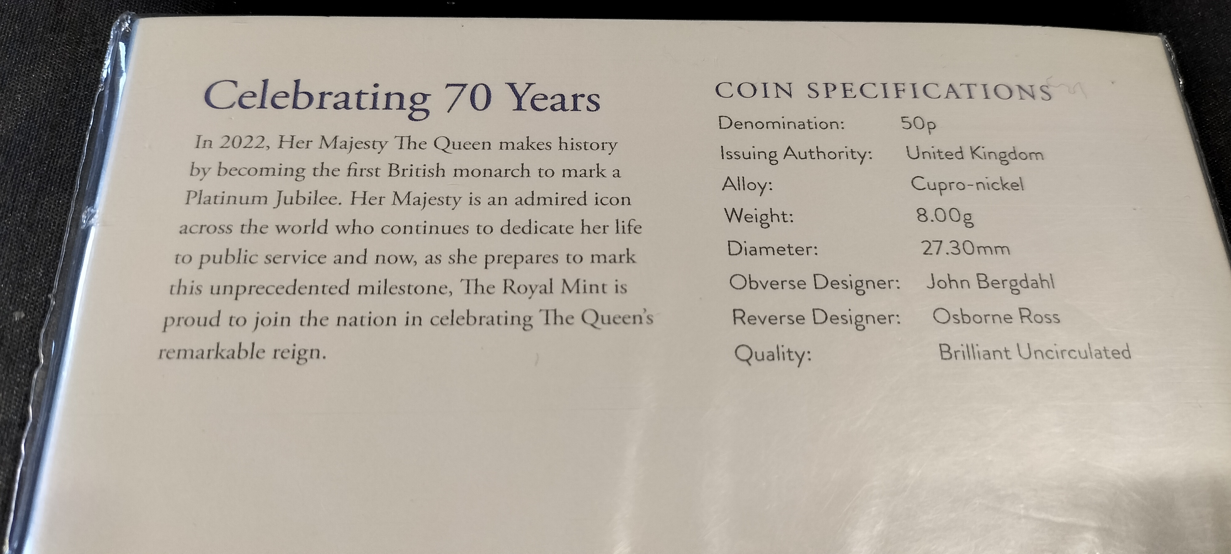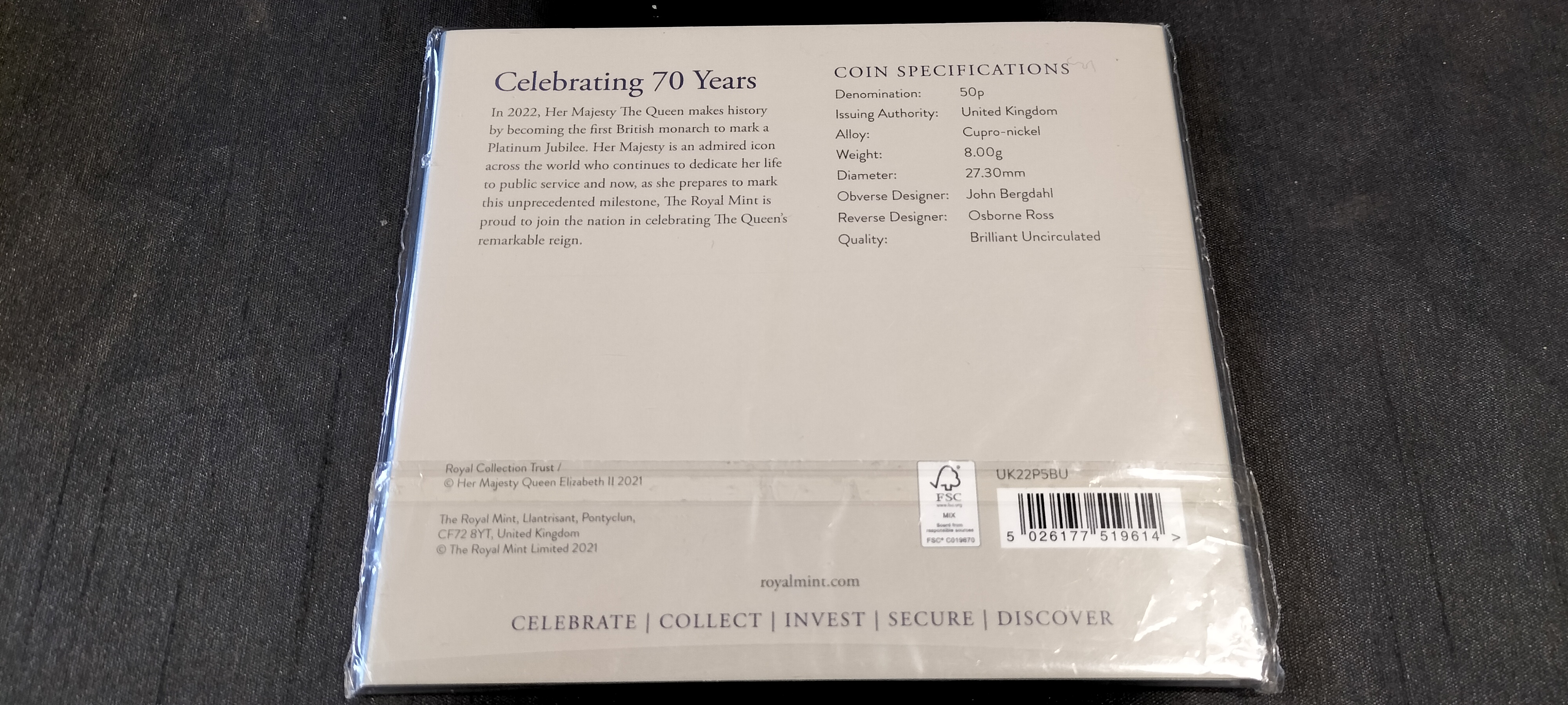 Royal Mint – The Platinum Jubilee of H.M. The Queen 2022. UK 50p. Brilliant Uncirculated New Coin, Sealed in Packaging