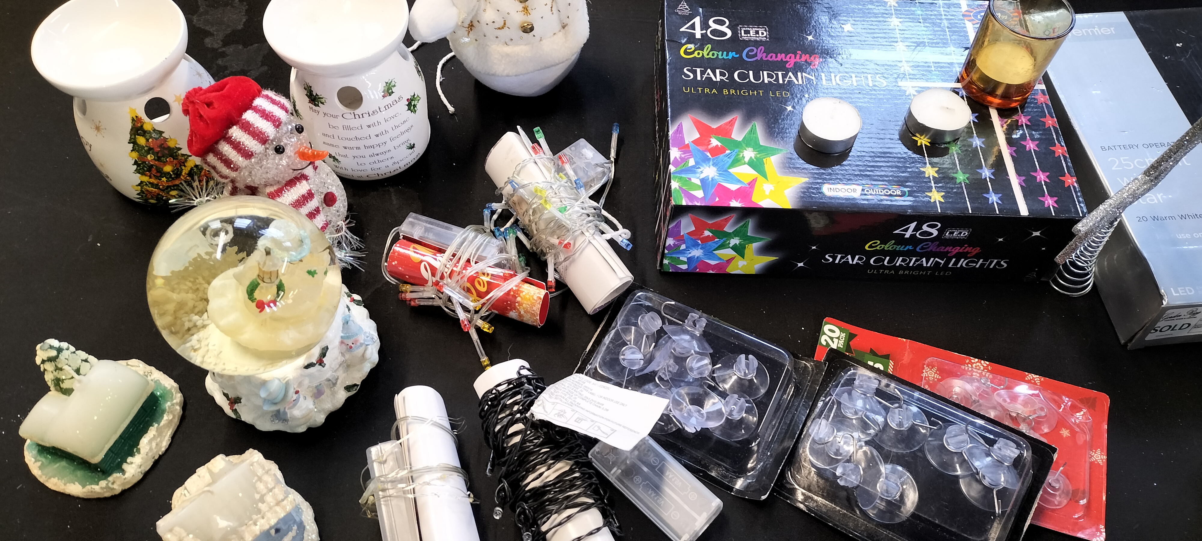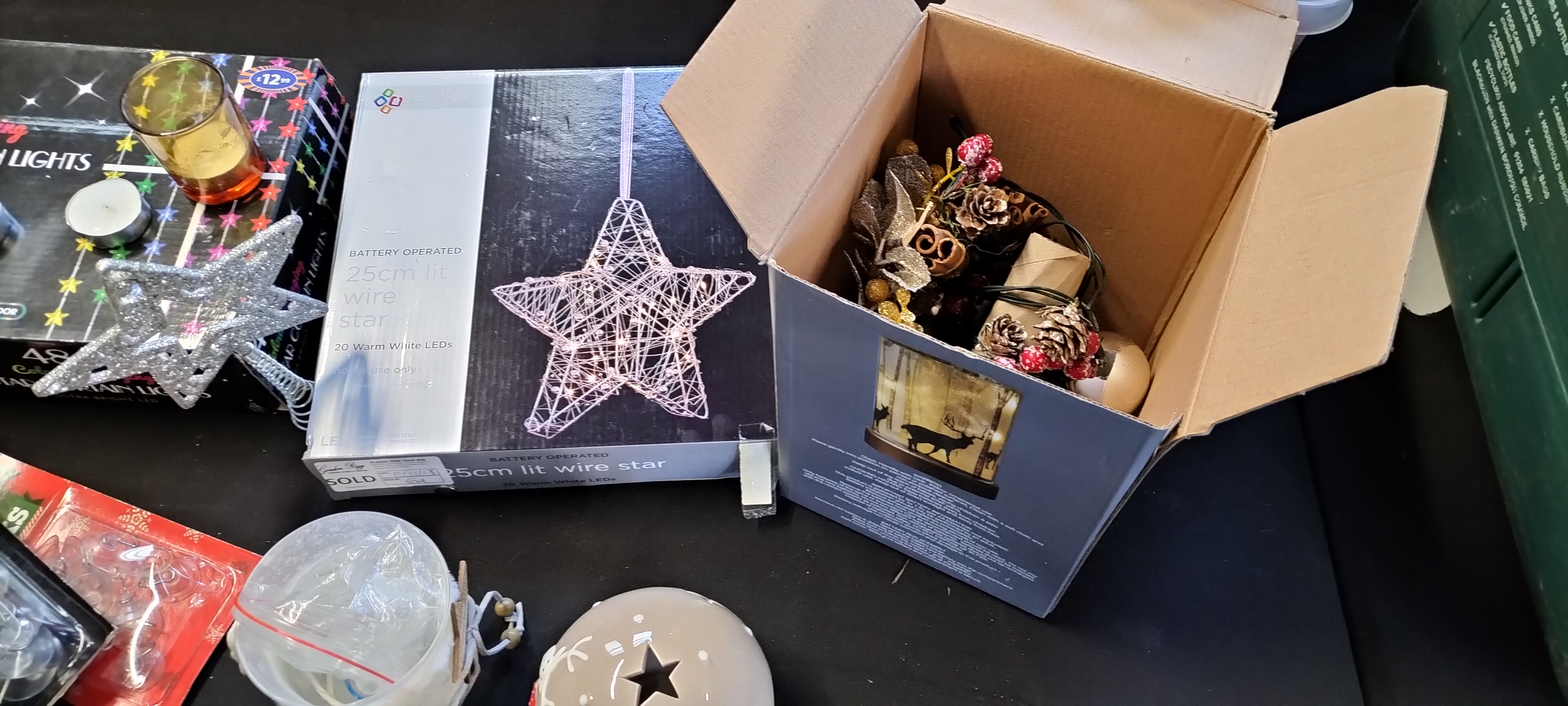 Mixed Lot of Christmas Decorations Including Candles, Tea Light Wax Melters, a 25cm Lit Wire Star and Battery Operated Lights.