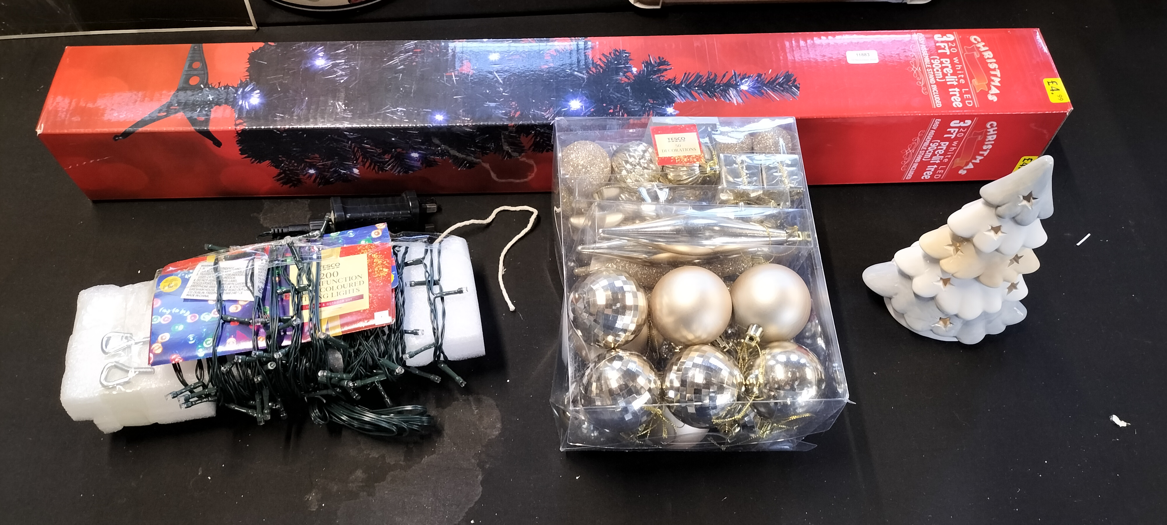 Mixed Lot of Christmas Items Including a 3ft Pre Lit Tree, 200 Multicoloured, Multifunction String Lights and a 50 Pack of Decorations