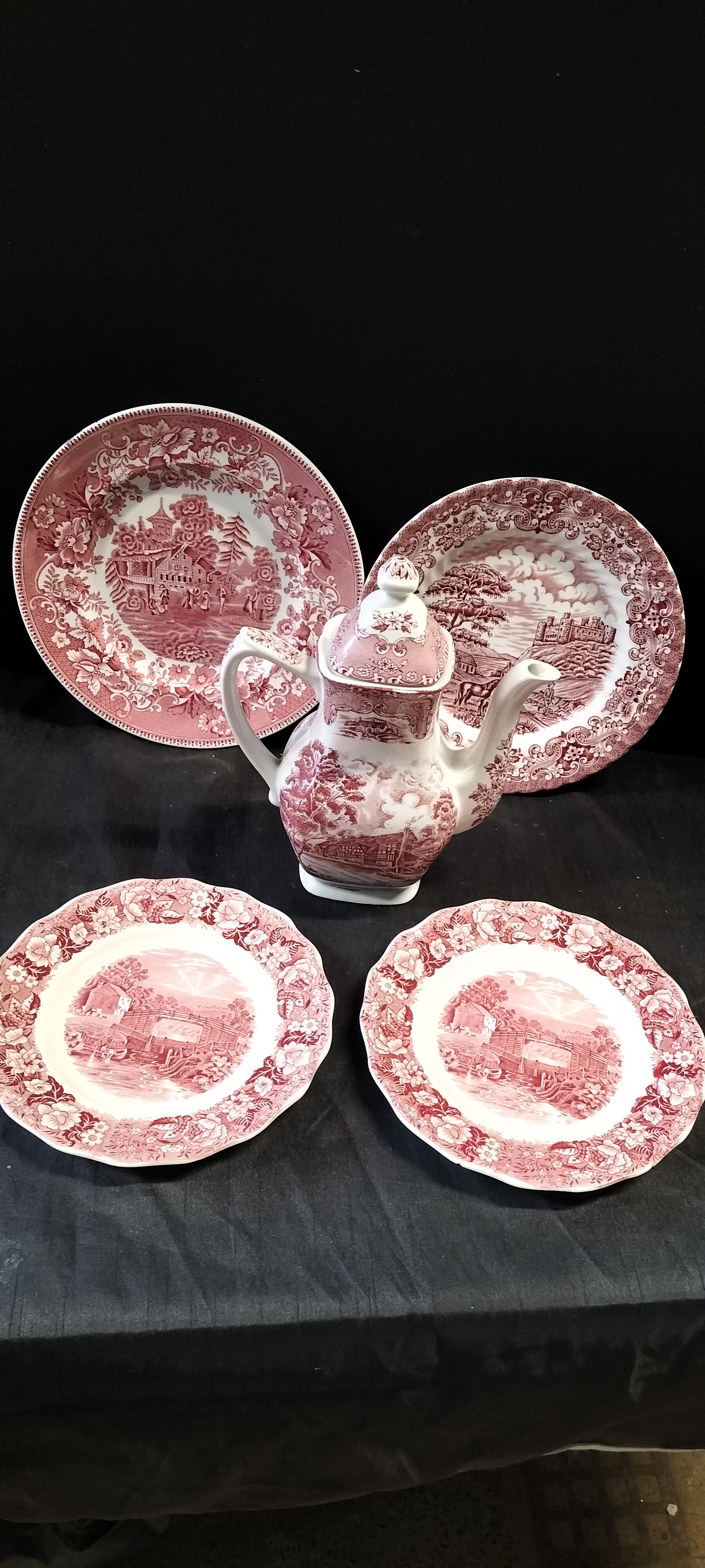 Four Decorative Staffordshire Ironstone China and an English Country Inns Tea Pot, Manufactured by Wedgwood, Palissy Pottery and Grindley & Co.