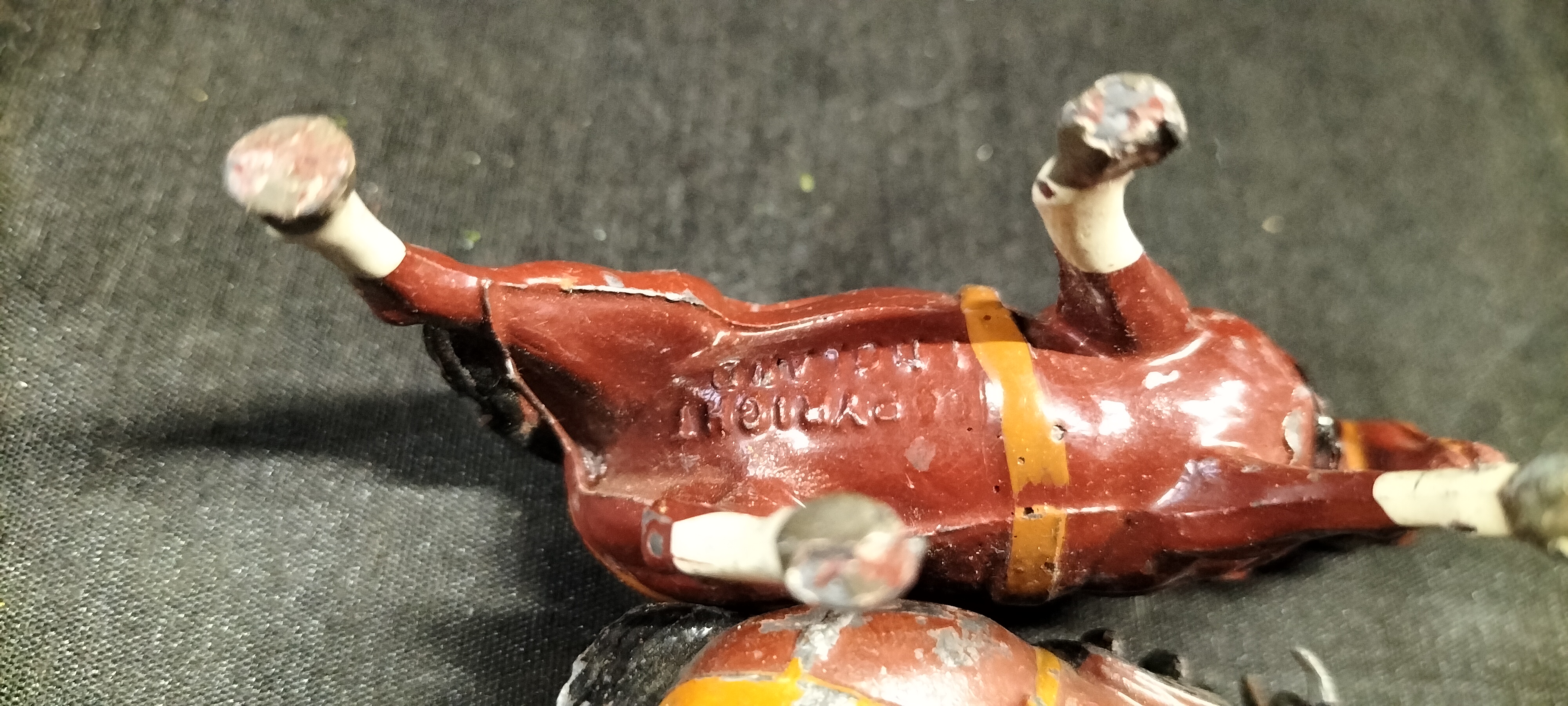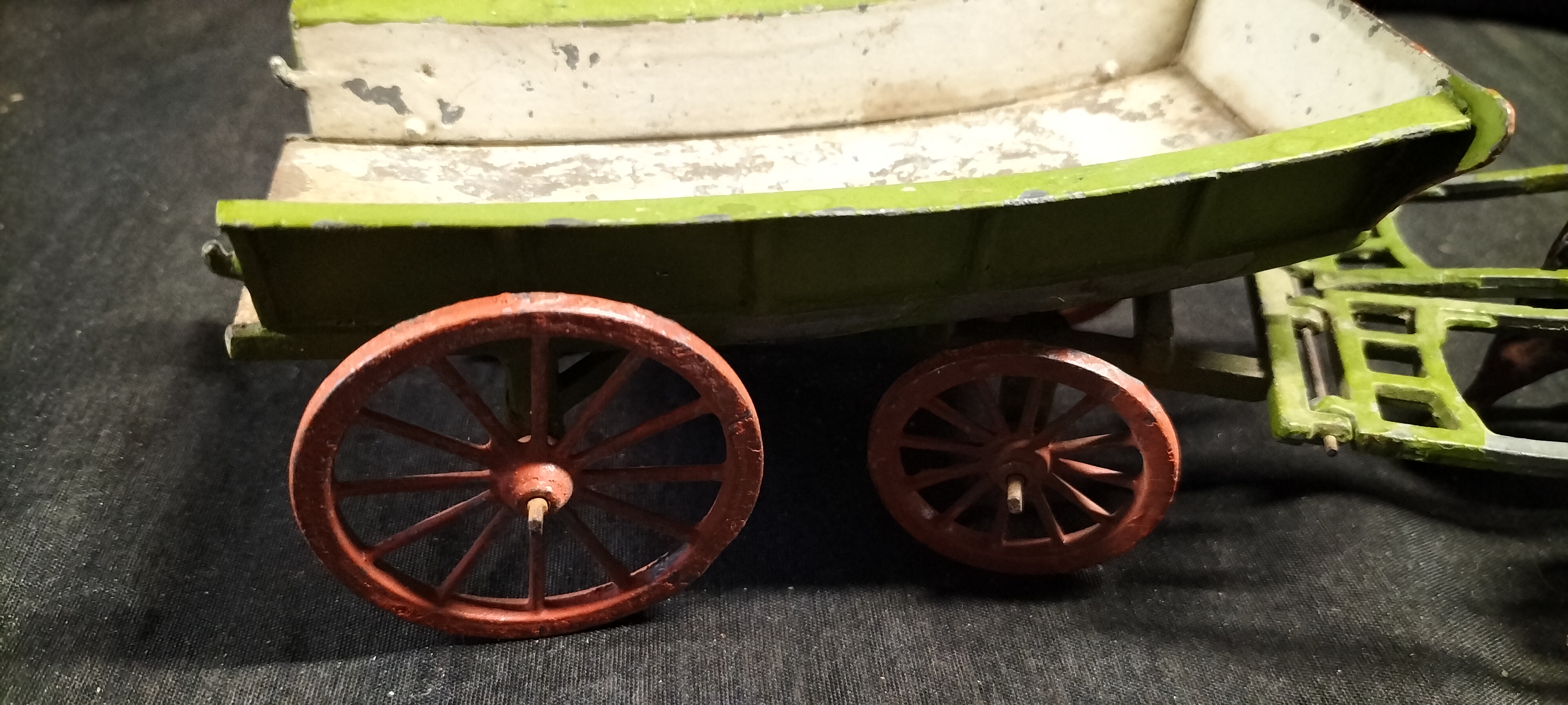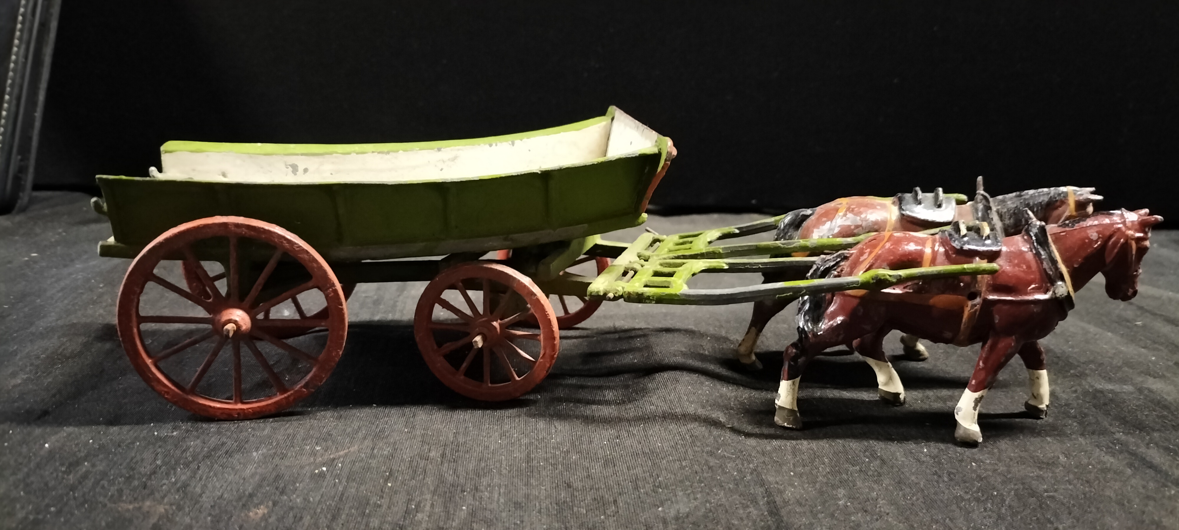 A Vintage Toy Horse Drawn Wagon with Two Horses. Lead Figures in the Britains Style