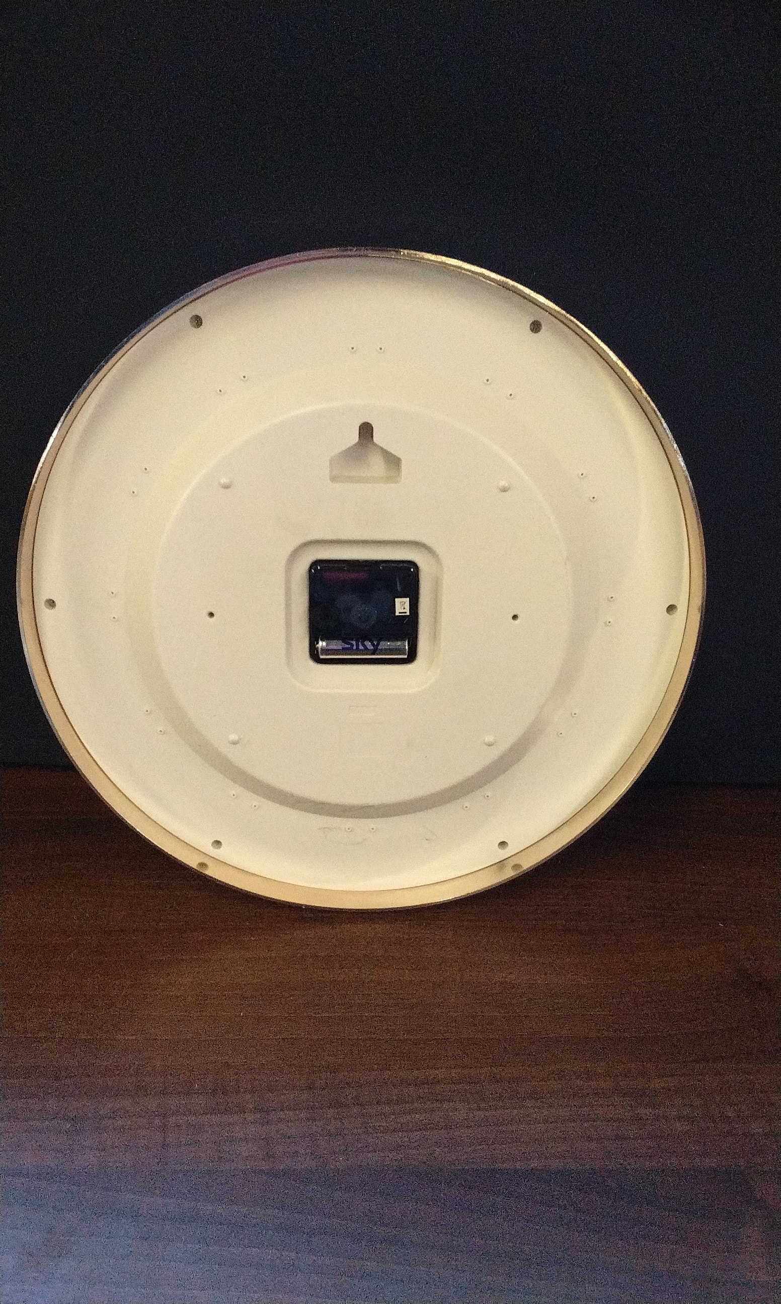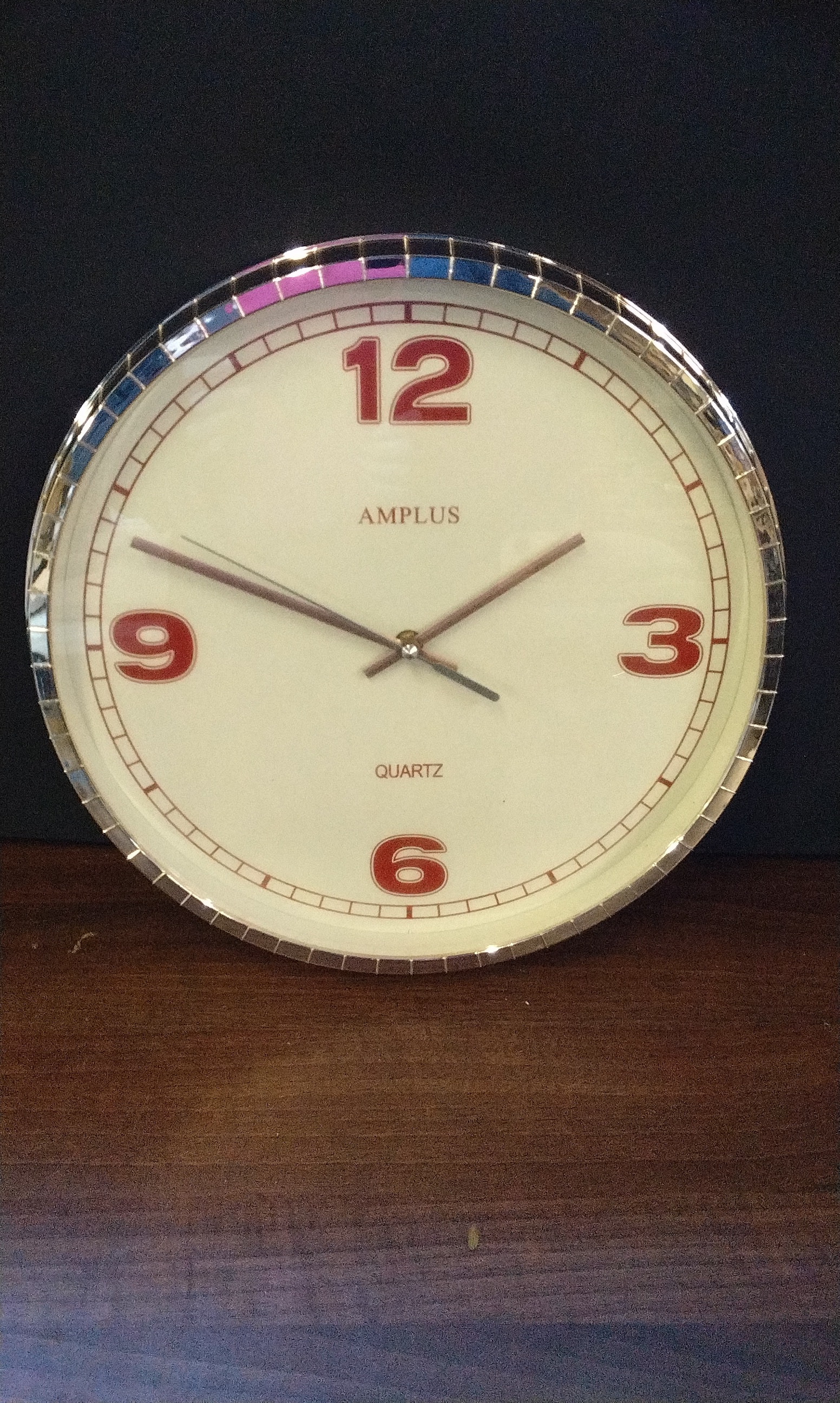 A round wall clock with a cream face, red numbers “3, 6, 9, 12”, a silver/chrome frame with small mirror-like tiles, inscribed “AMPLUS” and “QUARTZ”, and a “SKY” mechanism.