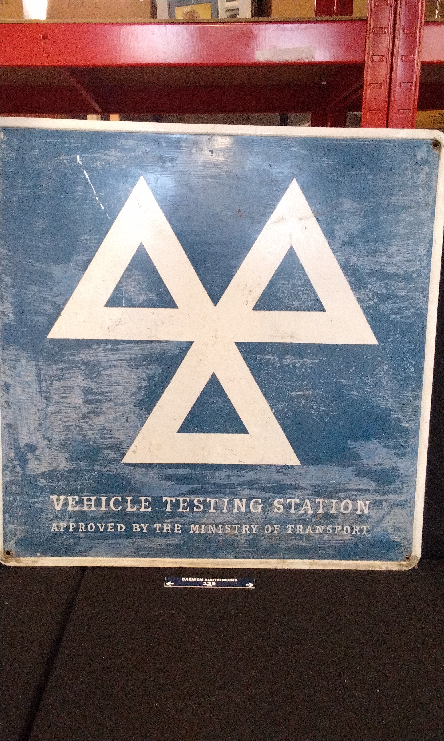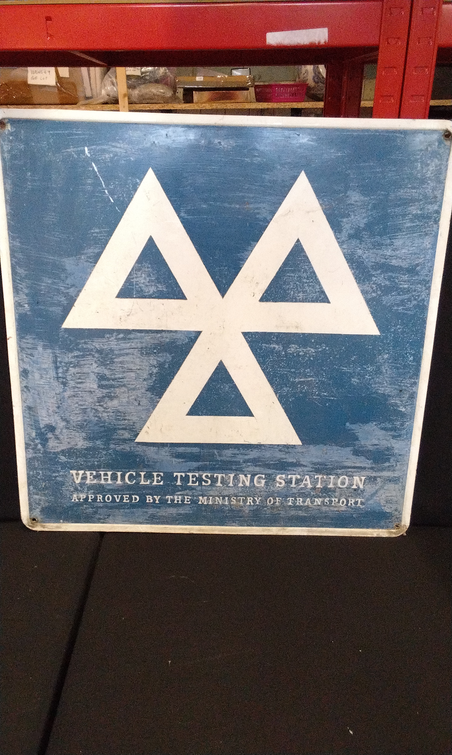 A single blue and white vintage metal sign, likely enamel, inscribed with the historical three-triangle symbol and the text VEHICLE TESTING STATION and APPROVED BY THE MINISTRY OF TRANSPORT.