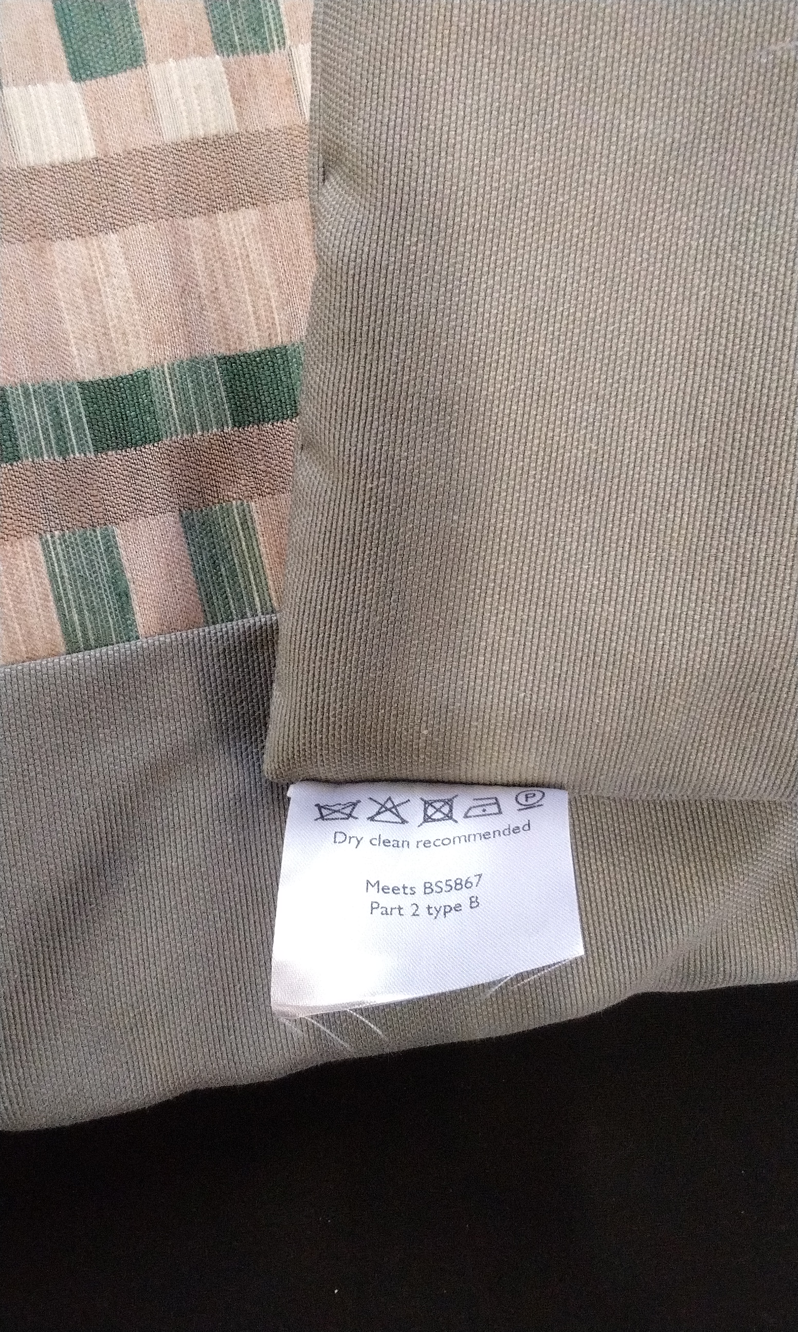 A long rectangular textile Bed runner featuring a wide grey border and a central plaid pattern in white, sage green, and tan, with a care label reading Dry clean recommended and Meets BS5867 Part 2 type B.
