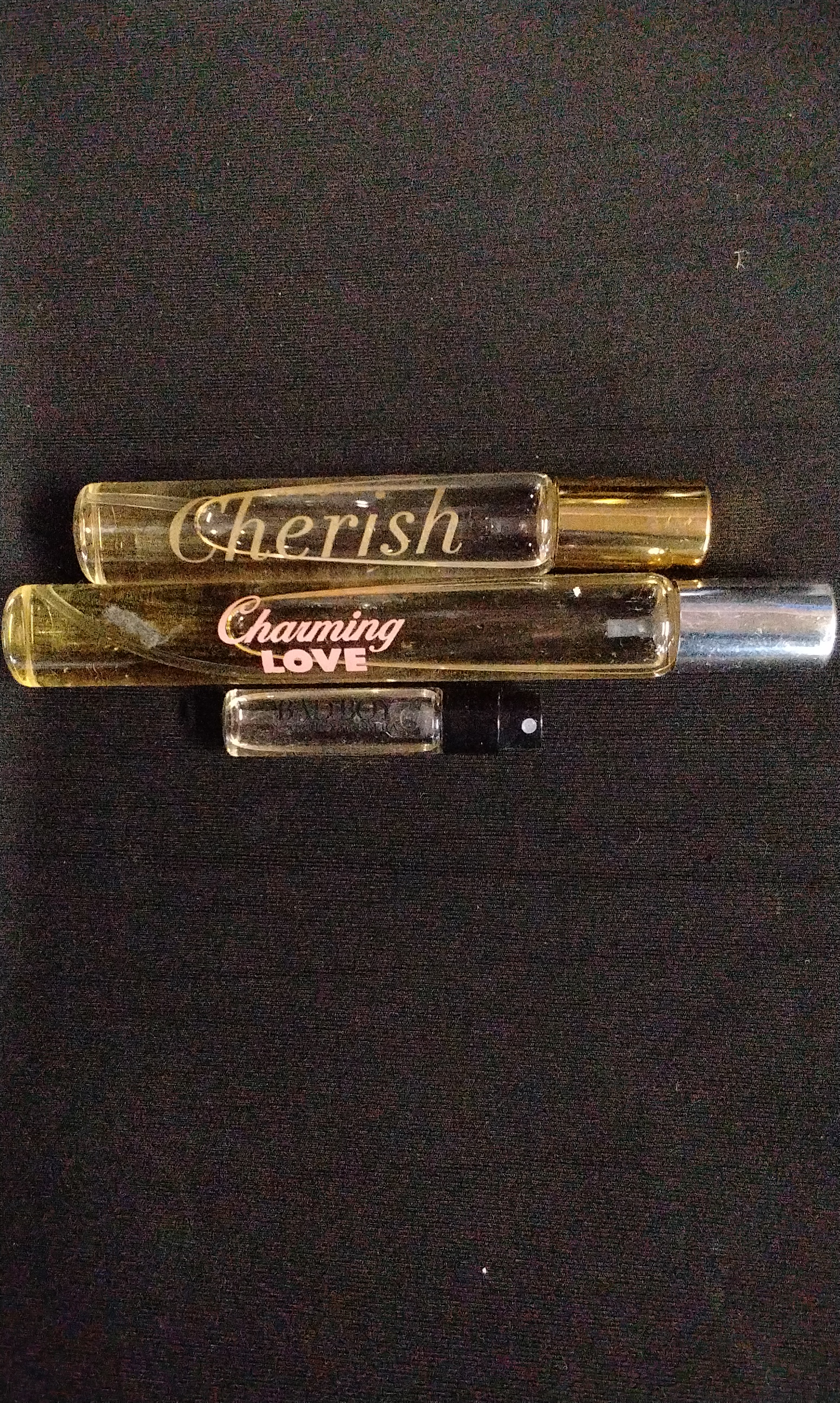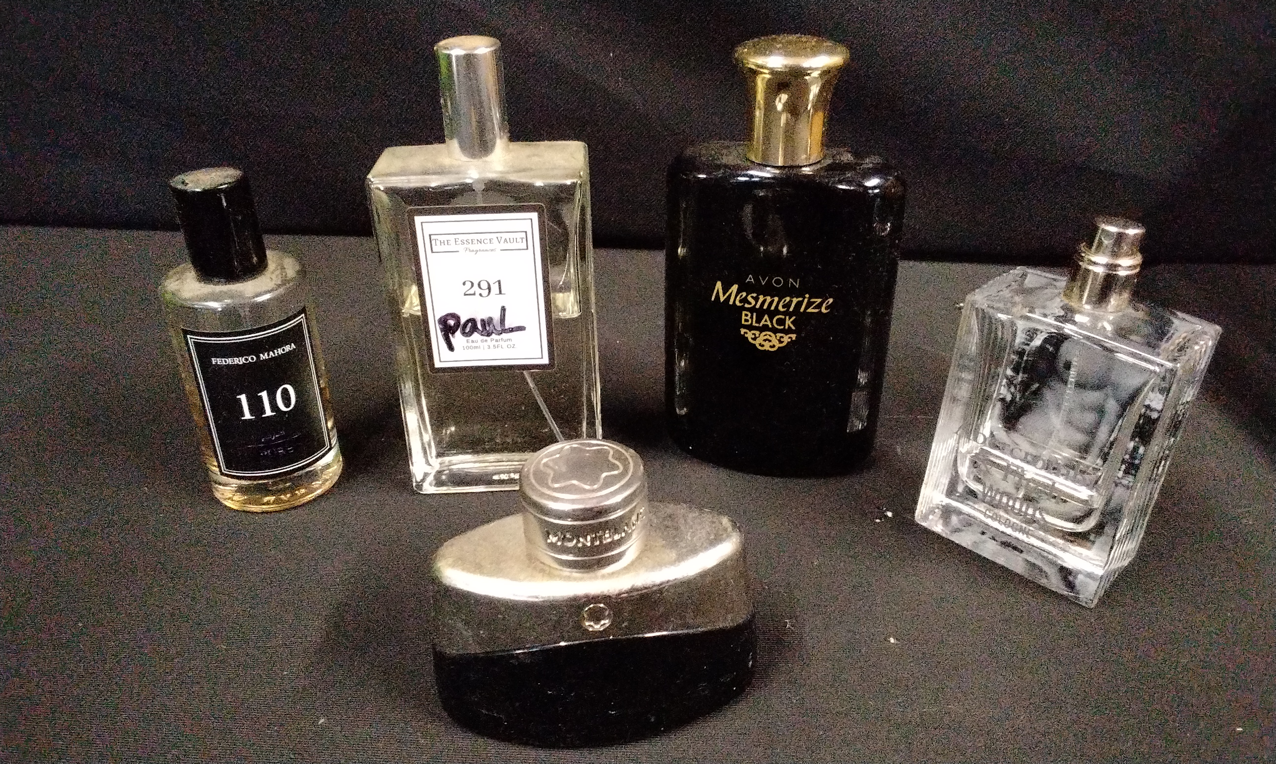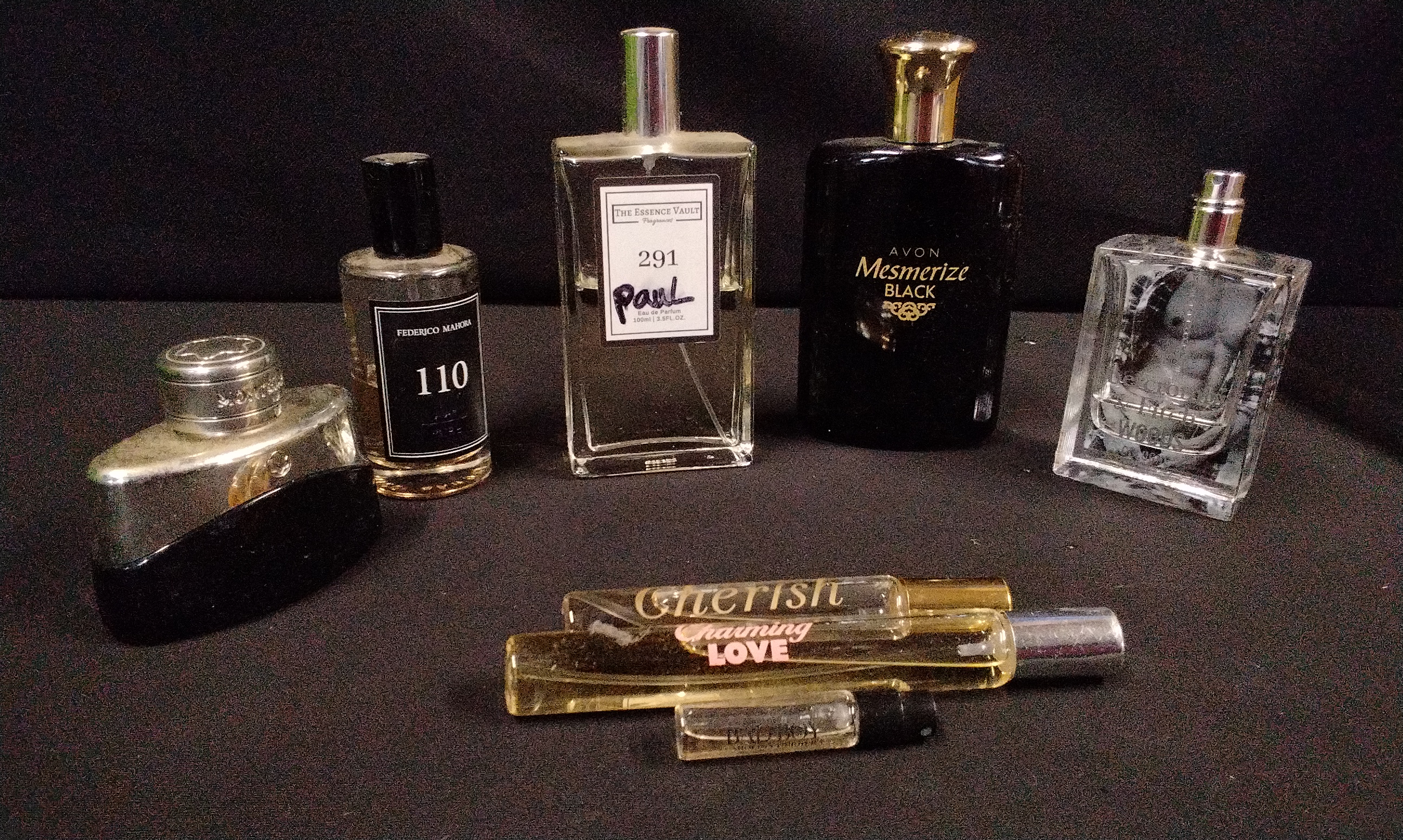 A collection of eight fragrances including bottles of Montblanc, Avon Mesmerize Black, The Essence Vault 291 Paul L., Federico Mahora 110, and Warrior, along with three small glass vials marked Cherish, Charming LOVE, and Bad Boy