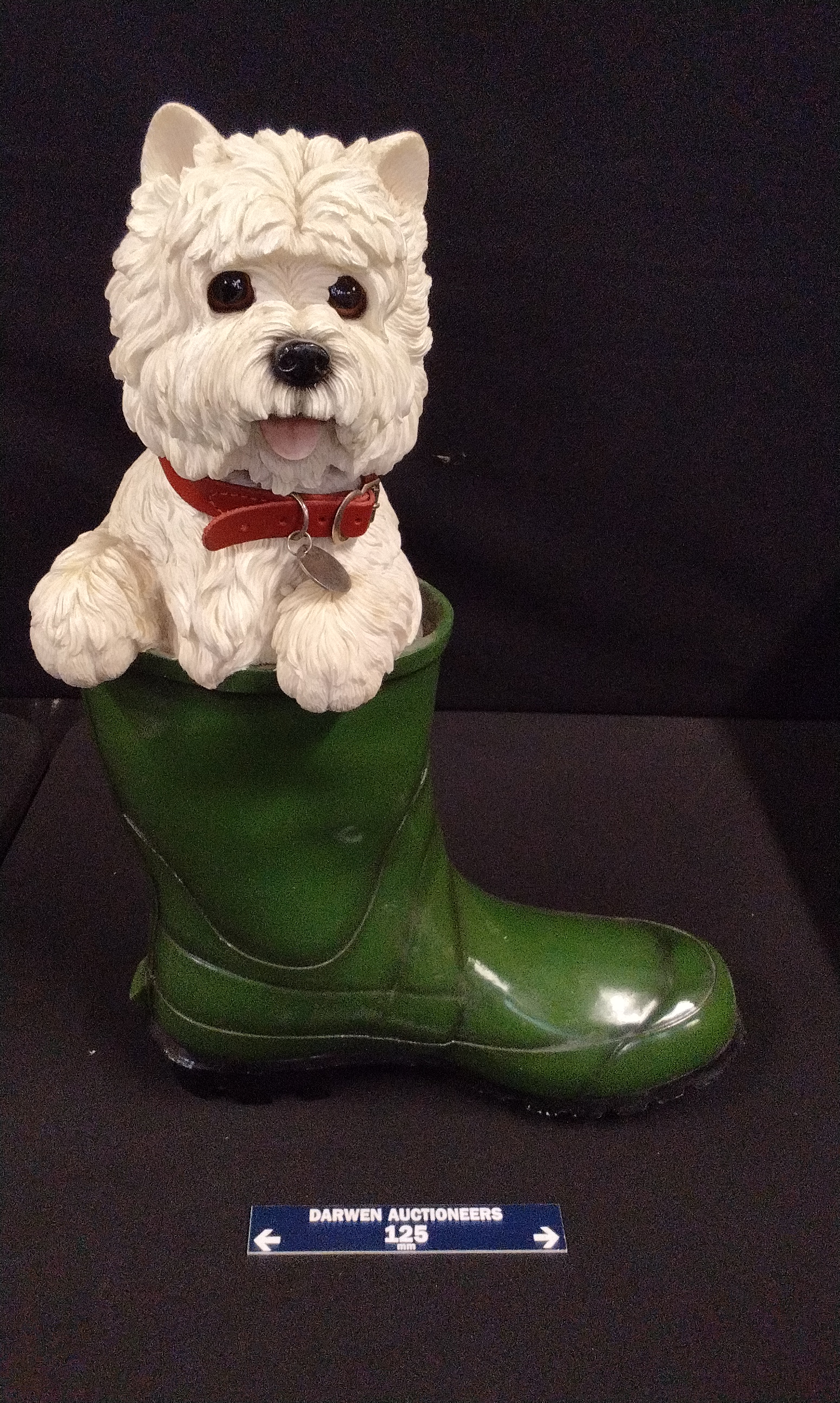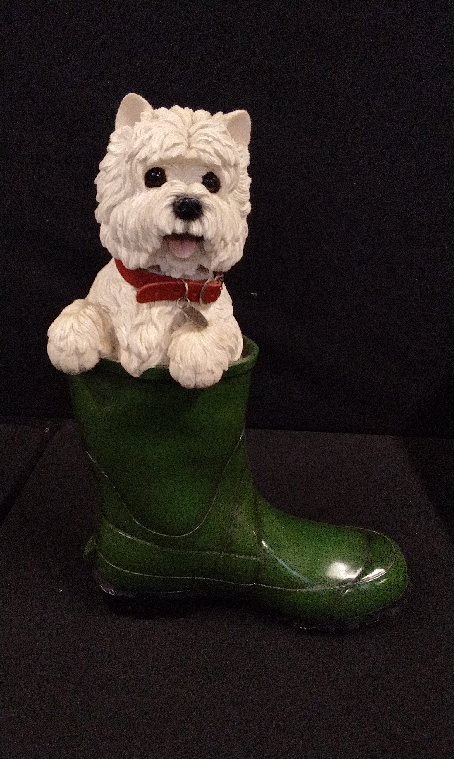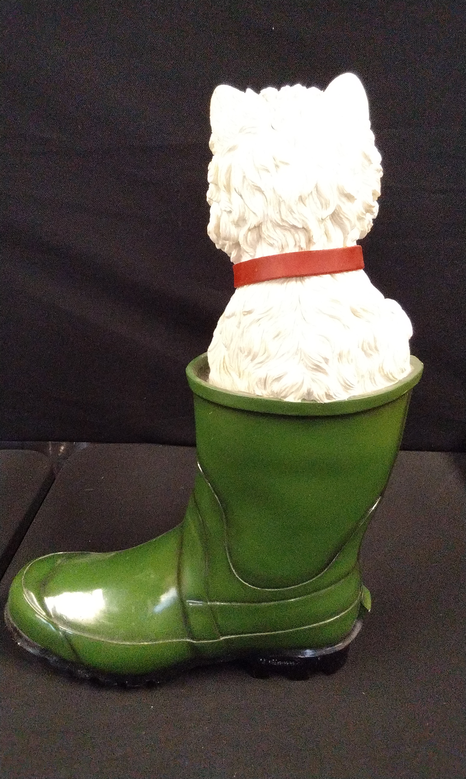 A white West Highland White Terrier Westie figurine from the Leonardo Collection emerging from a glossy green Wellington boot, featuring a red collar.