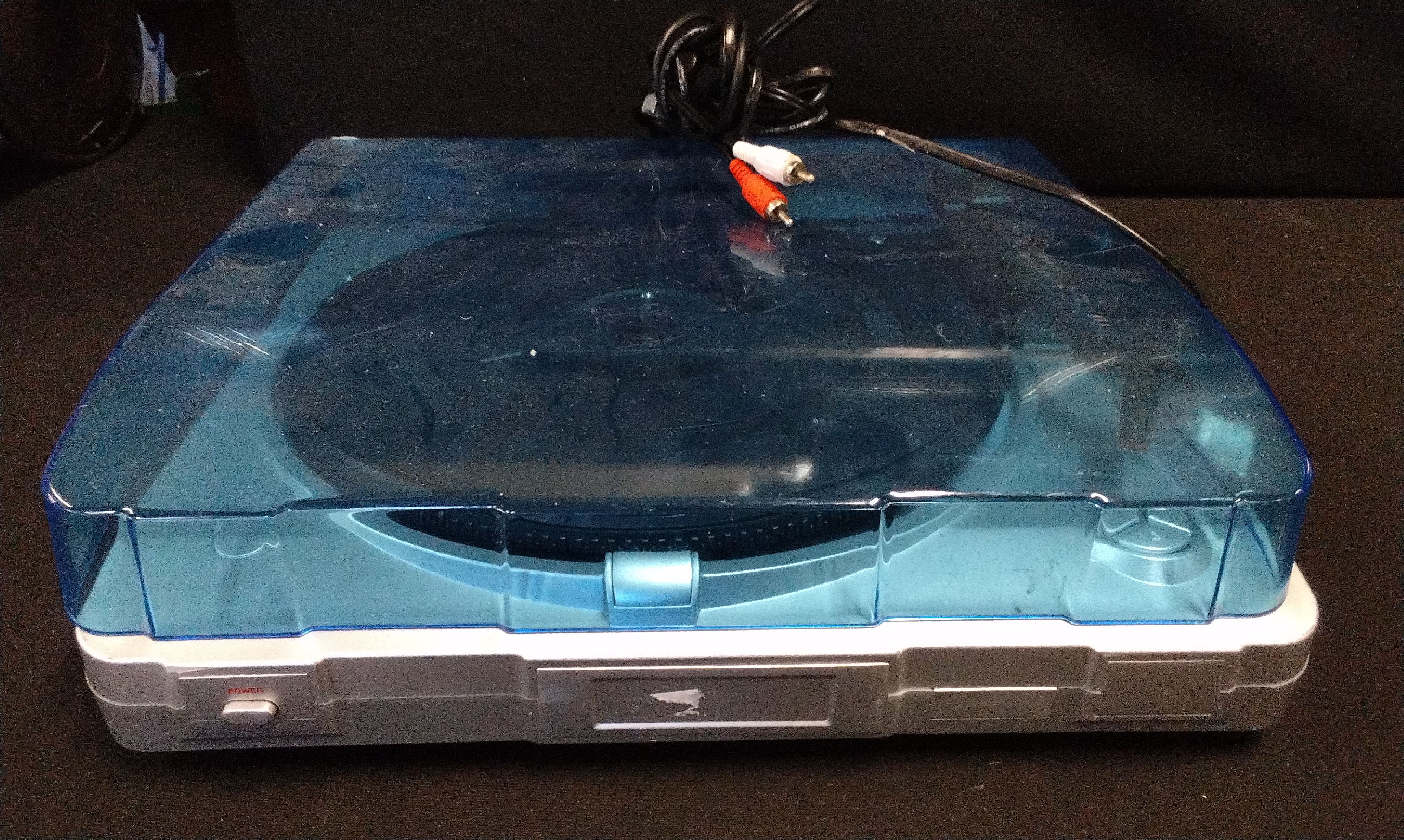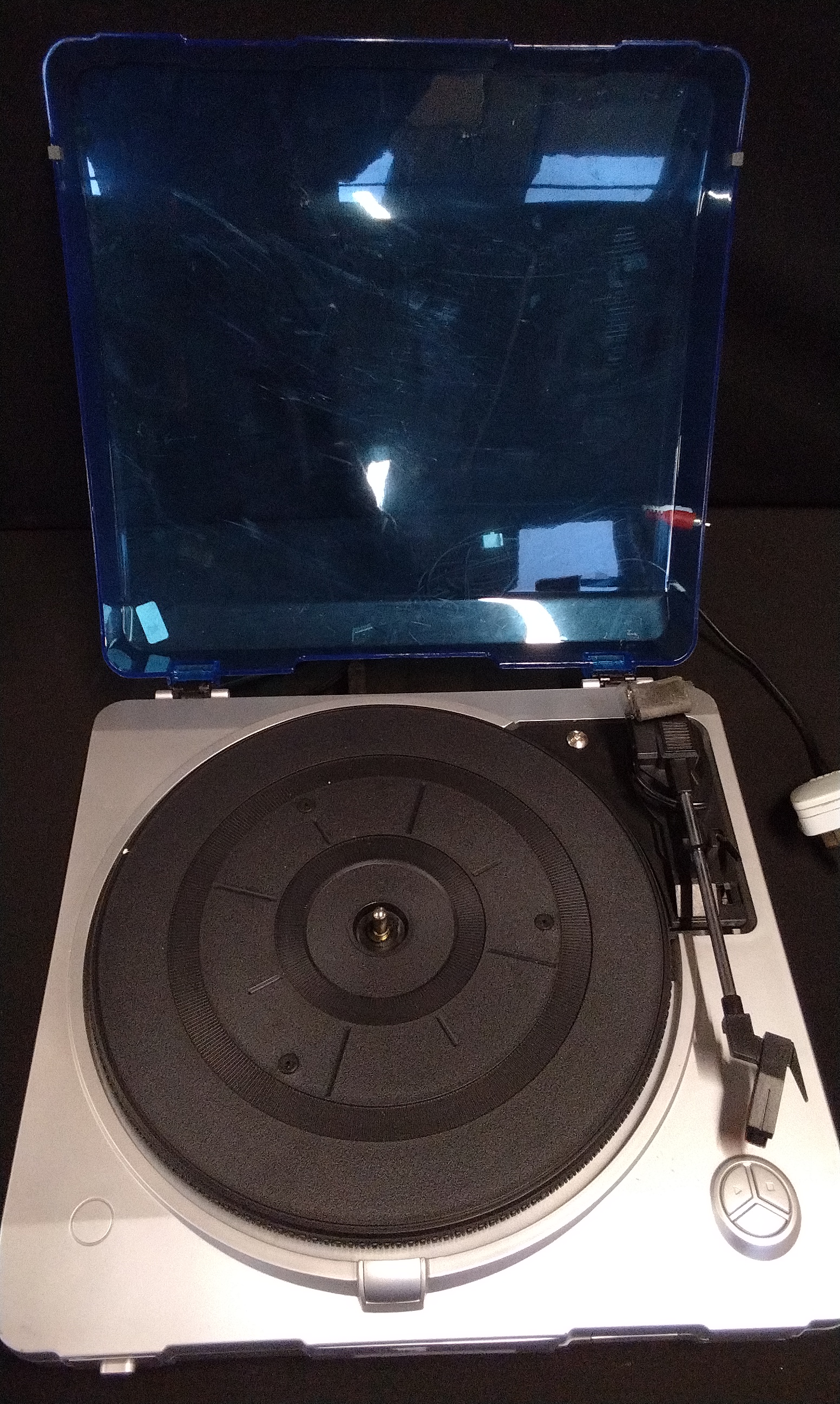 A single Prolectrix compact record player, model LET941430WKFOE, designed for playing vinyl records and commonly associated with USB digital conversion capabilities, as supported by market research. The unit features a silver-toned plastic housing and a large, hinged, translucent blue plastic dust cover. Internally, the unit includes a platter, a black rubber mat, and an attached tone arm assembly with a cartridge. The front fascia includes a POWER button and a stylized logo. The underside bears an adhesive informational sticker confirming the brand Prolectrix, Model LET941430WKFOE, distributed by Wilkinson. Specifications listed include 230V power requirement and 5W power consumption, along with the CE regulatory mark. Integrated power and RCA audio cables (red and white ends) are attached.