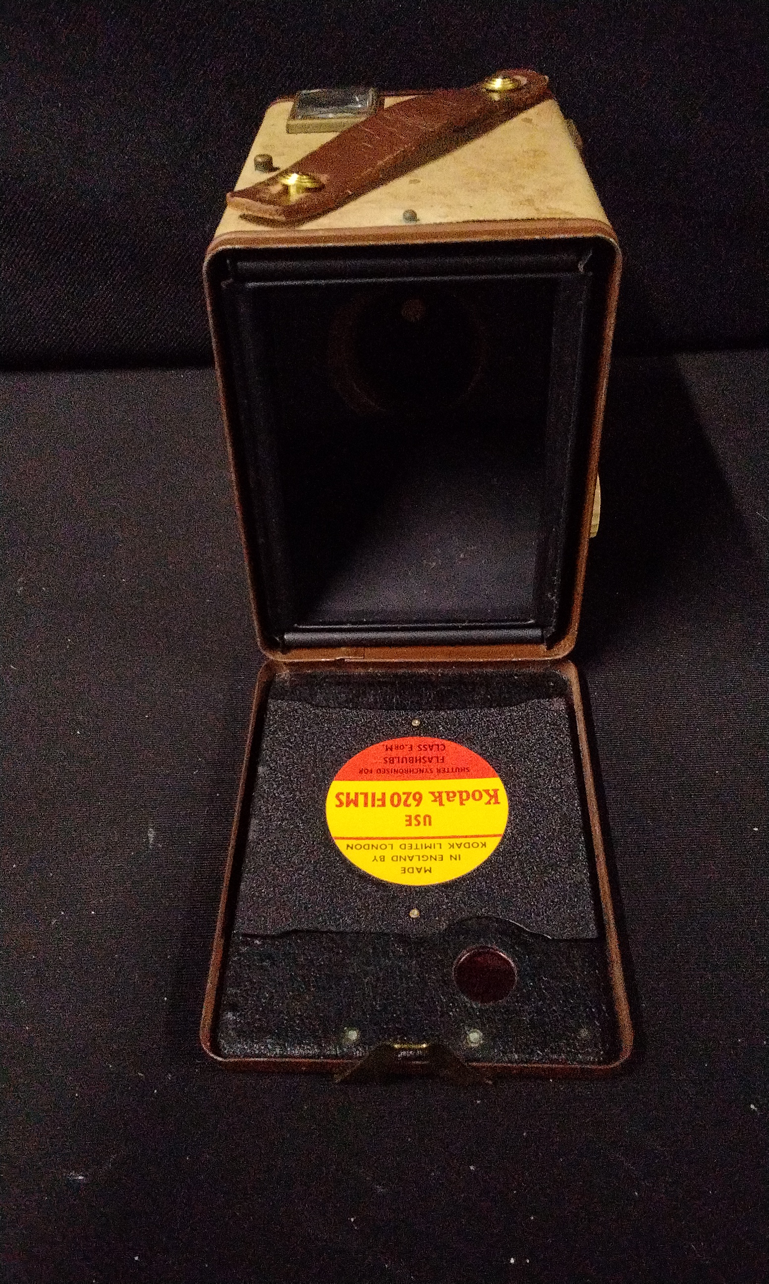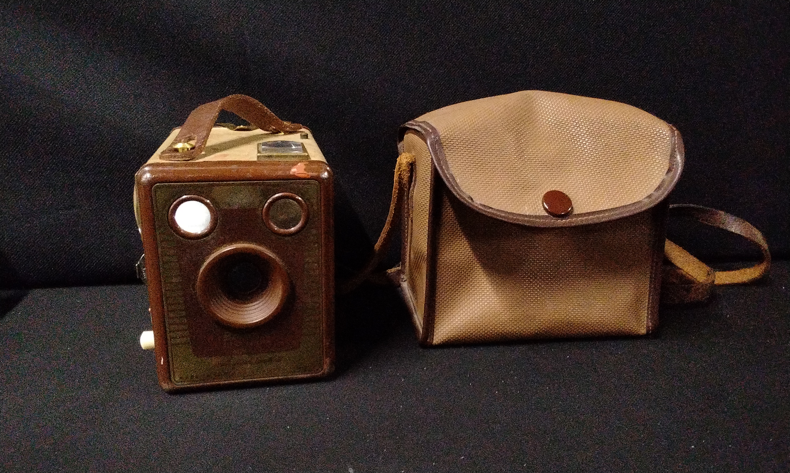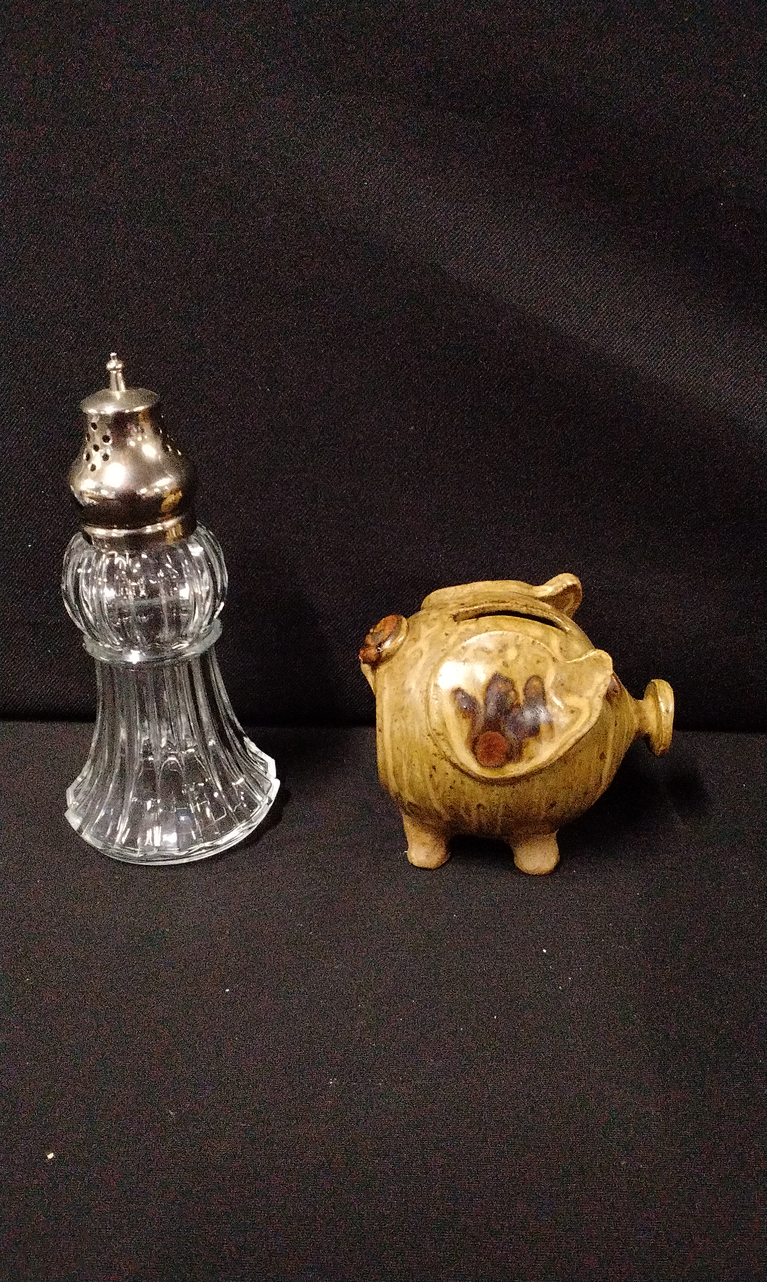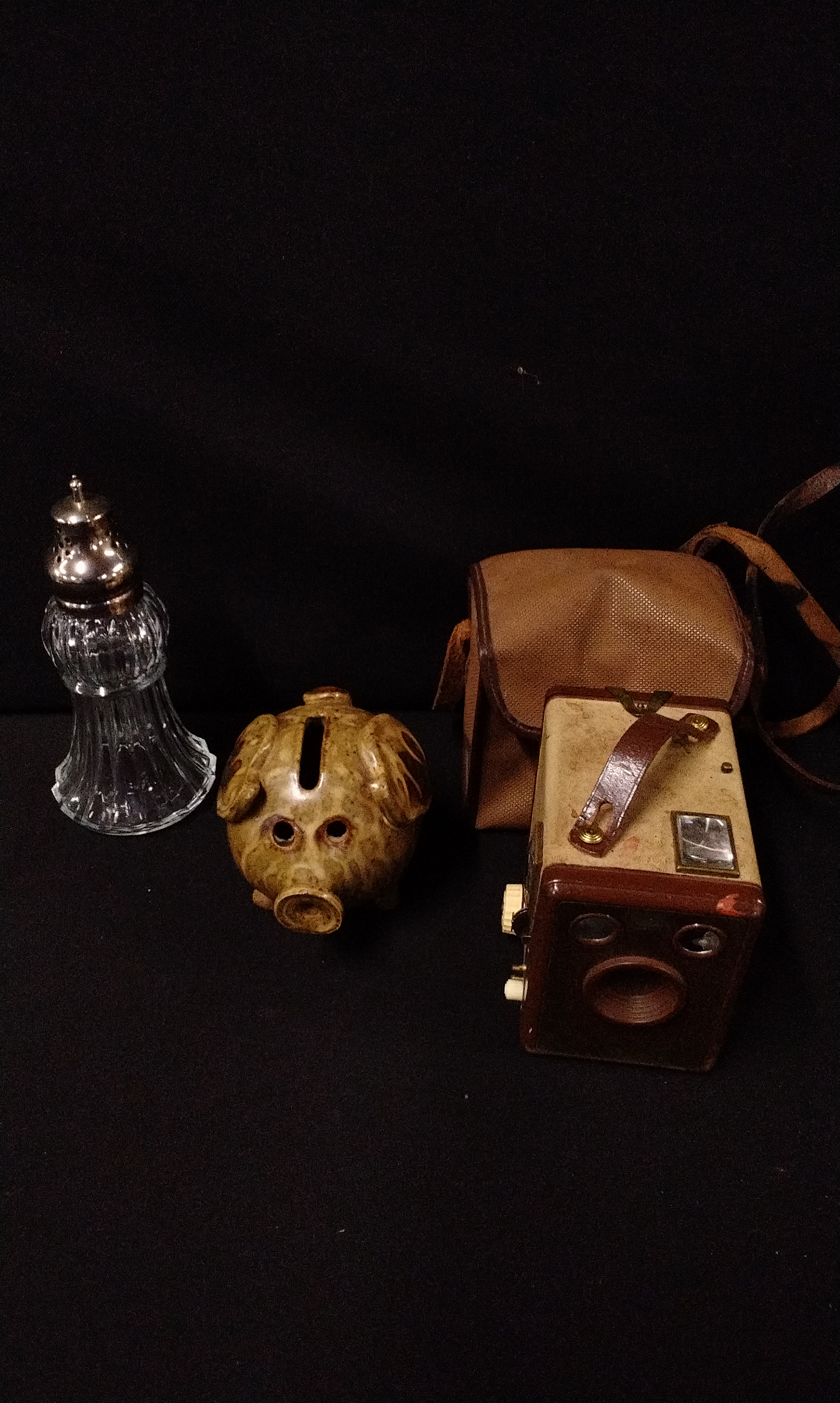 A collection of four miscellaneous vintage objects. The lot includes a Kodak Six-20 Model E box camera, identified by front plate text as having flash contacts and confirmed internally by a label reading “USE KODAK 620 FILMS MADE IN ENGLAND BY KODAK LIMITED LONDON.” The camera features a tan and brown faux leather exterior and a leather carrying handle. Also included is a functional tan woven canvas/vinyl carrying case or bag designed specifically to house the camera, complete with a shoulder strap. The third item is a glazed ceramic figural piggy bank in earthy brown and olive tones, marked on the underside with the stamp “COOPER POTTERY HAND MADE” and the monogram “CP.” The final item is a clear pressed glass shaker with a fluted design and a silver-toned metal perforated cap.